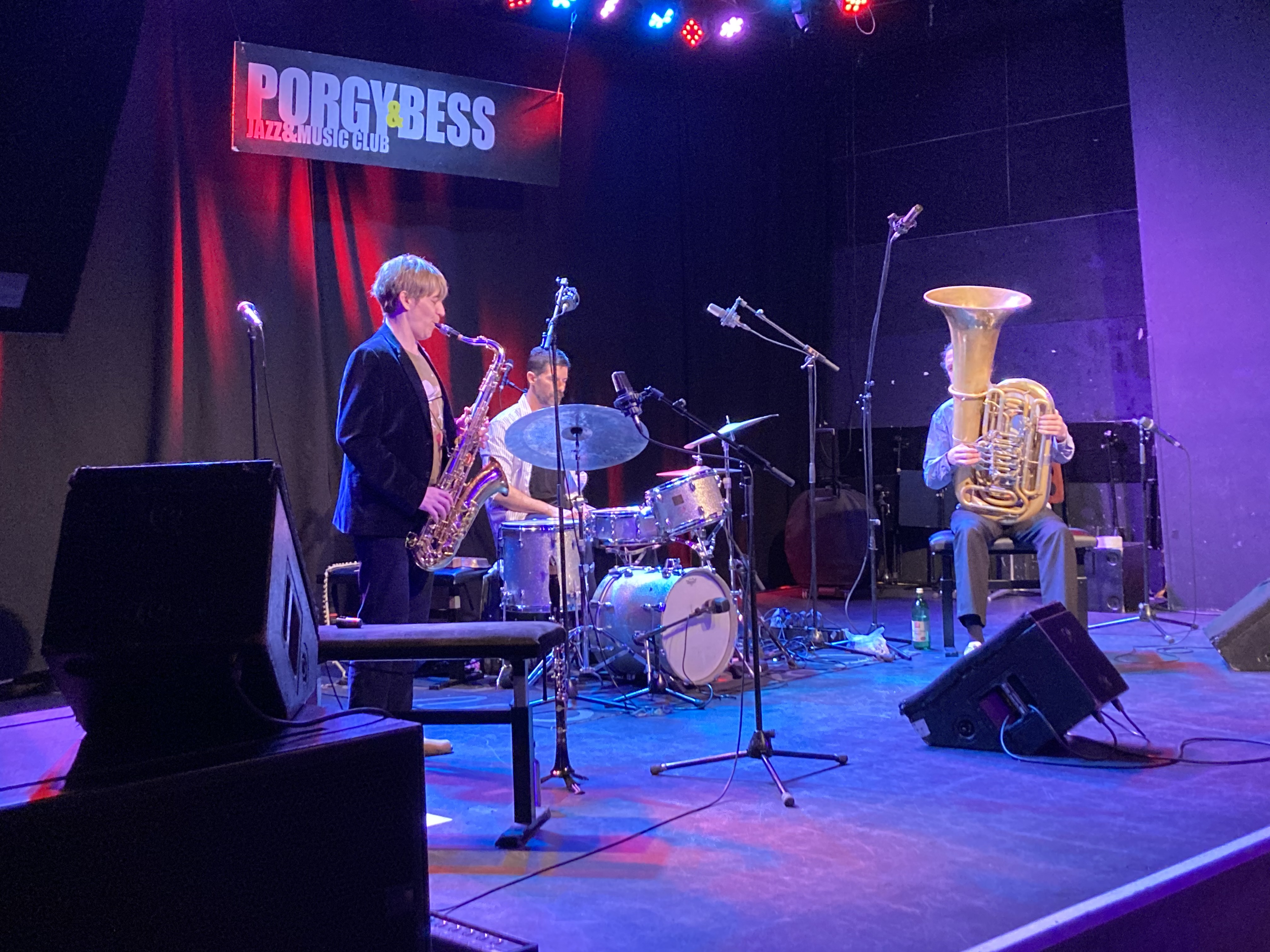 Gemeint sind da jetzt die Berge Vorarlbergs, den von dort her kommt dieses Terzett. Und die Berge würden sehr wohl auch einige von den feixenden Stückelen dieser alpenländischen „Andersticker“ zu Tale rollen lassen. Soweit so guat. Jedenfalls haben sich die Barackler zu einem fulminanten Gipfelsturm entschlossen und hören weit ins „Jazz-Land“ hinein. Ihre Ohren gehören der Jazzverlaufsgeschichte seit dem Bebop-Ausbruch. Aber auch die Frühsozialisation mit volksmusikalischer Blasmusik und ebensolchem Liedgut bleiben nicht unbeachtet. Wiewohl paraphrasiert und bruchstückhaft einbezogen. Steilwandig wie almrauschig inszeniert. Diese Höhenluft vermengt sich symbiotisch mit der Energie, dem Pulsieren des Urbanen. Kein Wunder, alle drei sind höchstversierte Improvisatoren, jazzaffine Spurensucher, originelle Ausloter, Allerlei-Möglichkeiten-Nutzer. Sodann rollte flugs eine sehr drahtig konsistente Blechlawine einher. Alfred Vogel zog gleich einmal flink den perkussiven Raster. Zunächst glommen seine Klangspiele in pixelhafter Manier. Metrischen Reglements enthoben. Umso mehr mit dynamischem Feinschliff und abstrahierter Melodik. Konträr dazu warfen die Bläser ihr Befinden ins Spiel. Von Seiten des Tubisten Joe Bär waren dies kürzelhafte Tonfolgen, vollmundig aus dem tiefen Register des Blechmonsters gehoben, während Andreas Broger ebenso mit viel Volumen eindringliche Melodielinien im Legato Modus ausbreitete – einem saftigen Ton einverleibt. Dann zogen die Musiker weiter. Thematisches Material, retardierend angelegt bzw. von ausreichend groovendem Befund, wurde unorthodox aufgegriffen. Der hohe Interaktionsgrad erlaubte dies spielend. Vom Schlagzeug kam gelenkiges Timekeeping, von vifen Drum-Pattern Melismen durchzogen, schwenkte erneut in aperiodische, filigrane Zeitgliederung um, ehe wieder ungeheure polyrhythmisch angelegte Bewegungsenergie voranpreschte. Vogel deutete hintergründig Marschrhythmen an, zerlegte sie in zwingende Teilrhythmen und Pattern. Dem Sog solchen Drives gibt man sich ungefragt hin. Das ließ Broger und Bär mit Kinästhesie auftrumpfen. Beide zogen ausgiebig am Grat spontaner Explorationen entlang, waren aber immer einem tonalen Zentrum im Wort. Als zusätzliche starke rhythmische Ader deklarierte sich der tradiert swingende, markig funkende, ad lib perkussive „Tubismus“. Dem aber auch das reine Soundspektrum nicht fremd ist. Mit der Fähigkeit in konzisen Soli Essentielles darzulegen, zog Broger stringent die melodischen/harmonischen Koordinaten. An der Klarinette ein anrührender Ton und am Tenor erweckte er des öfteren Erinnerungen an „Coleman Hawkinsche“- Sanftmut, die dennoch auch bärbeißig ausbuchsen kann. Die Umhüllende ist die kollektive Gestik, von gewitzten Off-Beat Schichtungen geprägt. Da wurde bizarr gelandelt, klassisch gebopt, sowie euphorisch oberhalb der Baumgrenze herumflaniert. Querverstrebte Marschrichtung: zeitgenössische Modal-Jazz Gemengelage. Ja, da fliegt  schon mal das Blech weg, wie einem hier der Marsch geblasen wird.