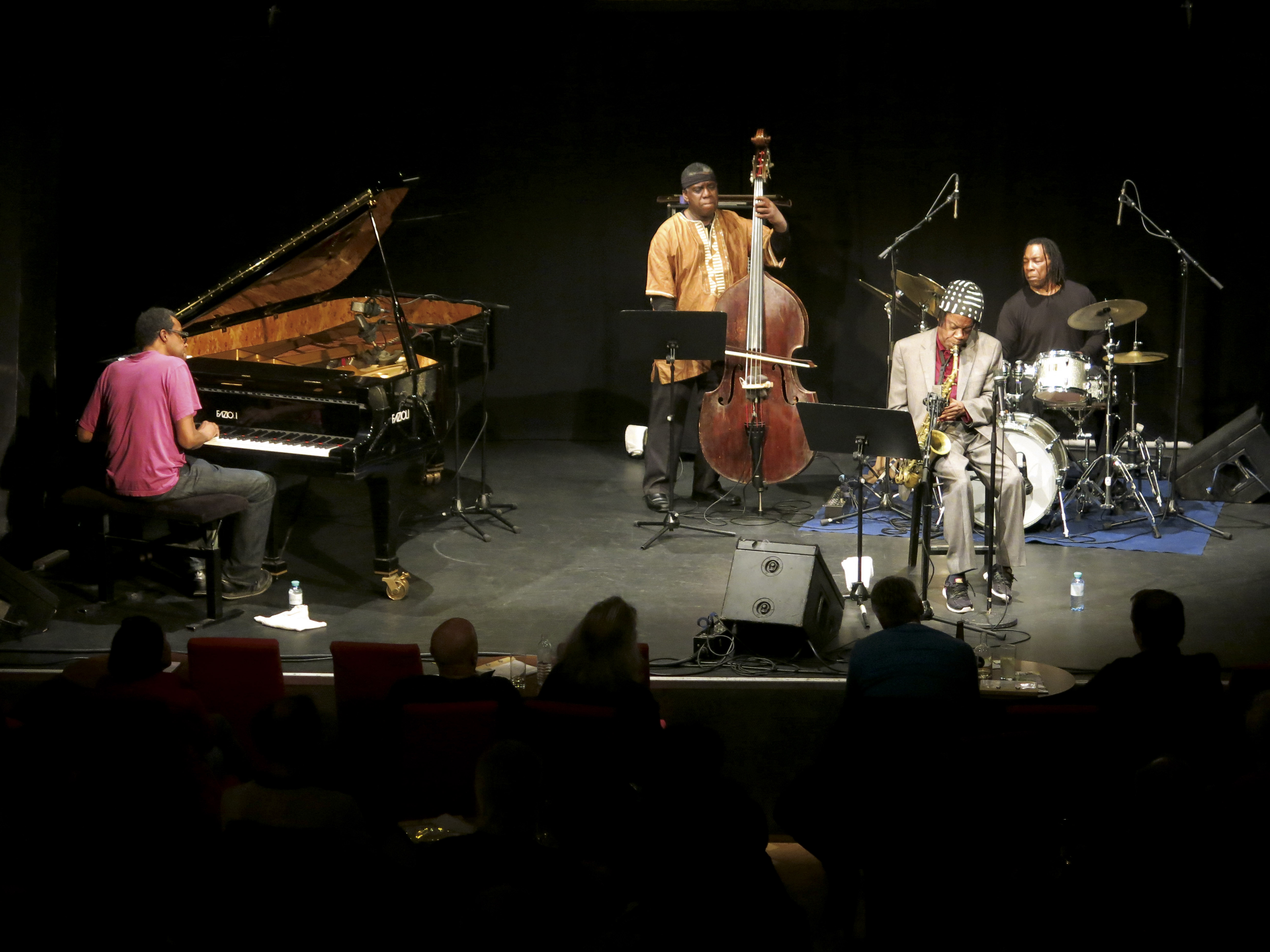 Den Beginn des Konzertes hatte das Quartett konventionell angelegt. Das längere, einer Post-Bop-Diktion folgende Stück, diente als warm upbzw. als Plattform für improvisatorische Exkurse jedes Einzelnen. Das dabei Gehörte muss als durchwachsen umschrieben werden. Lediglich Shipp zeigte sprühende Fantasie, setzte fassettenreiche Initiativen, trieb die Musik voran. Nichts desto trotz offenbarte sich eine gewisse Unschlüssigkeit und Zerfahrenheit in der Interaktion heraus. Moondocs sonst so wendiges in verschlungenen Legatobögen meanderndes Spiel mit dem schneiden Ton wirkte doch einigermaßen flapsig und das Rhythmusteam zeigte Unentschlossenheit, da der steif wirkende Schlagzeuger Baker zu den kraftvollen walkenden Basslinien Greenes nicht aufschließen konnte. So hinterließ das erste Set ein laues Gefühl. Im zweiten Set fing die Band dann doch entsprechend Feuer. Es war die lässige „Looseness“ in ihrem Agieren, sprich jeder folgte seinem eigenen Tempo und die Musiker bezogen sich nur auf wenige vordefinierte Parameter – wie eine pentatonische Skala oder ostinate Riffs, die die freie Interaktion florieren ließ. Was stark berührte war die Authentizität und die Unmittelbarkeit der Spielhaltung des Quartetts. Demzufolge wehten Geist und Seele der Great Black Musicvehement herüber.