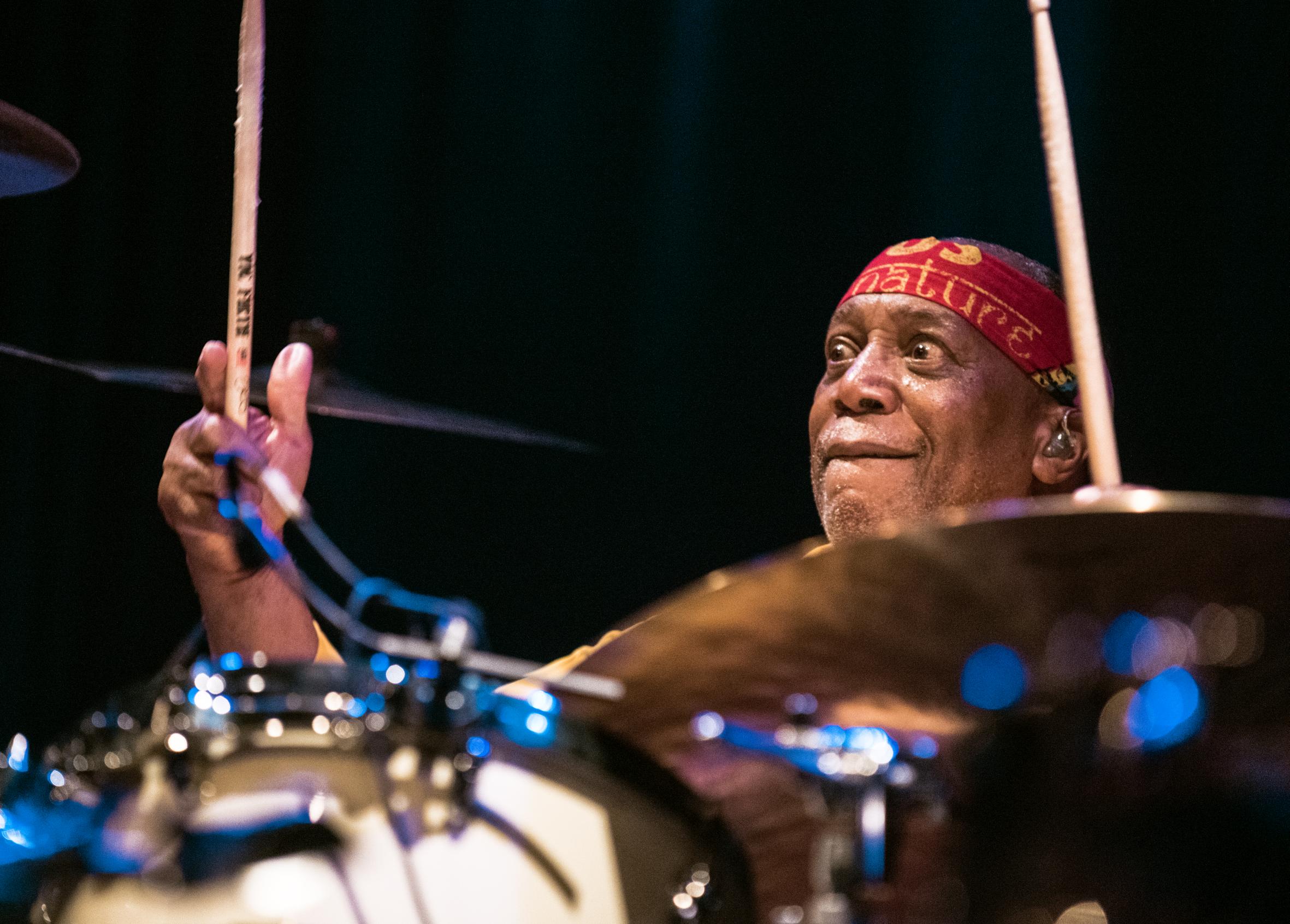 Am Vorabend eines innerösterreichischen Wahldesasters mit den Folgen von viel gesellschaftspolitisch verbrannter Erde durch einen rechtspopulistischen Flächenbrand, jonglierte „Drum-Colossus“ Billy Cobham mit atemberaubendem Zauber mit einem Füllhorn an Off-Beats und Paradiddles und fulminanten, melodiesinnigen Schlagabfolgen auf seinem ausladenden, feinstens getunten Set, quasi einer Meta-Trommel“. Jedoch immer durchflutet von zwingender Musikalität. Man konnte einen aus dem „Jazzbauch“ kommenden Musiker erleben, der einer der ganz wichtigen Fährtenleger des „Jazz-Rock“, einer Ausrichtung im Windschatten von „Dark Magus“ Miles, war und ist. Wiewohl man der Stilistik einst keine Nachhaltigkeit zugestand, obschon sie sich zeitweise selbst einigermaßen verwässerte, hat sie aus heutiger Sicht sehr wohl unüberhörbare Spuren hinterlassen. Man denke nur an Kollektive wie e.s.t. oder The Bad Plus und Konsorten. Und Cobham vollführte eindrucksvoll wie Authentizität in diesem Genre, das er mit findiger Funkyness und Latin-Groovigkeit auflud, klingt und man diese auf gültige Art ins Heute holt. Voraussetzung ist allerdings ein „Premier League“-Level. Musikalisch wie Instrumentaltechnisch. Mit beidem sind er und seine Truppe ausreichend gesegnet. Ohne Umschweife entfachte die Band, angetrieben vom unbändigen Drive und Kraftstoff Cobhams, ein Furioso an irrwitzigen strukturellen Abläufen - kollektiv oder stimmtragend ausgeführt. Faszinierend zu beobachten war, wie Virtuosentum nie dem Selbstzweck anheimfiel, sondern dem Überraschenden, dem Unvorherhörbaren, einer als technokratisch verschriehenen Spielweise den Raum öffnete. Es schienen rhythmisch wie metrisch keine Limits im engmaschigen Interplay der Band zu existieren. Standen zwar Cobhams unantastbare Fähigkeiten im Fokus, waren diese jedoch nie von egomanischer Dominanz. Ein wunderbares Beispiel war z.B. die erfrischende Version des Cobham-Klassikers „Stratus“ innerhalb derer sich ein herrliches Gitarre/Schlagzeug-Duo herauskristallisierte, das auch die im Rahmen einer derartigen Spielhaltung mögliche Offenheit und Spontaneität darlegte. Auch sonst zeigten alle MusikerInnen in den Soli ein bestechendes Maß an Fantasie und Originalität. Die beiden Tasten VirtuosInnen lieferten, zumal nicht alle Sounds glücklich gewählt waren, in den Klangqualitäten von Mini-Moog und Rhodes mitreißende Beiträge, denen die zwei Saitenakrobaten in zumeist rockgetränkter Klangästhetik, die sie jedoch immer wieder ausweiteten, gleichwertiges hinzuzufügen wussten. Hier agierte eine Band die zu sich steht und sich gemeinsam trägt und, allen voran Cobham, überschäumende Spielfreude und packenden Spielwitz in die Nacht legte. Ganz großer „Shabazz“.