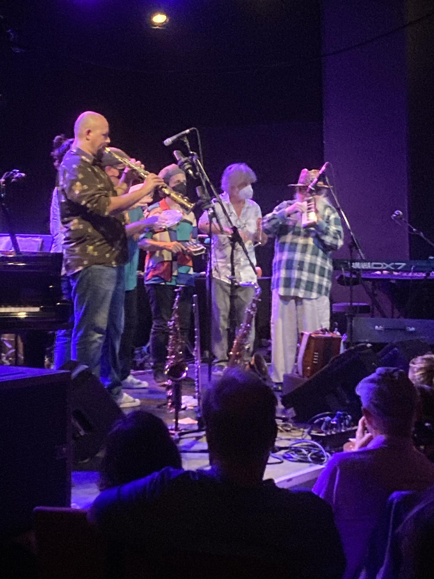 Höchst fokussiert setzte er damit lenkende, anregende Harmoniekürzel hinzu. Oder setzte melodierhythmische Kontrapunkte, oder lenkte den Rhythmus überhaupt um. Eine Praktik die Miles Davis, dessen Einfluss Pascoals auf ihn er hoch bewertete und der auch Anfang der 1970er Jahre in seiner Band spielte, für seine Keyboardverwendung übernommen haben dürfte. Geschickt wusste Pascoal mit physischen und kreativen Energie zu haushalten. Nach eingestreuten Ideen überließ er oftmals seinen Mitmusikern die weitere Vervollkommnung. Beeindruckende Homogenität war hierbei erlebbar. Hellhörig, sensibel, reaktionsschnell interagierte das Kollektiv. Eingebunden in eine unglaublichen Leichtigkeit des Seins. Gleich ob komplexe rhythmische Überlagerungen, polymetrische Extravaganzen - speziell Bass, Schlagzeug und Perkussion waren dahingehend, auf das reiche brasilianische Rhythmuserbe Bezug nehmend, am Zaubern -, oder eben melodische/harmonische Eigenheiten mit ihren direkten Singbarkeiten. Bacchantisch zelebriert von Klavier und Saxophon. Wobei dem Saxophonisten solistisch eine exponierte Rolle zukam. Mit fliegender Fantasie, expliziter Präsenz und Gelenkigkeit im Spiel, entwickelte er auf seinen diversen Hörnern die vorgegebene Kantabilität von Pascoals Stücken weiter. Umsichtig kanalisierte der wiederum den Improvisationsrausch zeitgerecht in die Bahnen seiner knifflig originellen Kompositionstexturen. Um sodann in Konzentriertheit seine Spontanimaginationen als Glanzpunkte draufzusetzen. Etwa mit einem zerbeulten Teekessel, mit der Bassflöte, die er auch ausschließlich auf deren Kopfstück reduziert, vogelstimmenimitierend bespielte, mit der Sanfona (Knopfakkordeon) oder mit spielerischem Können auf dem Klavier. In seinen Händen wird alles zu Musik. Tiefgreifend im Ausdruck. Nicht zu überhören waren auch die mit größter Spielfreude ausgeleuchteten Klangdetails, die zumeist ad hoc explodierten. Dann wäre da noch unverhohlen Essentielles in der Musik Pascoals: Analog zum Jazzbegriff „swingen“, spricht man in Brasilien von „balancado“. Die Balance zwischen den musikalischen Zeitebenen afrikanischer und europäischer Provinienz. Es beschreibt diesen fühlbaren Schwebezustand zwischen diesen beiden Zeitverhältnissen. Der war an diesem Abend rundum prickelnd. Für Hermeto Pascoal ist die ganze Welt Klang. Limitlos im Stilistischen wie Klanglichen. Von höchster emotionaler Qualität. Hermeto, o mago do som. (Hannes Schweiger über das Konzert vom 27. Mai 2022)