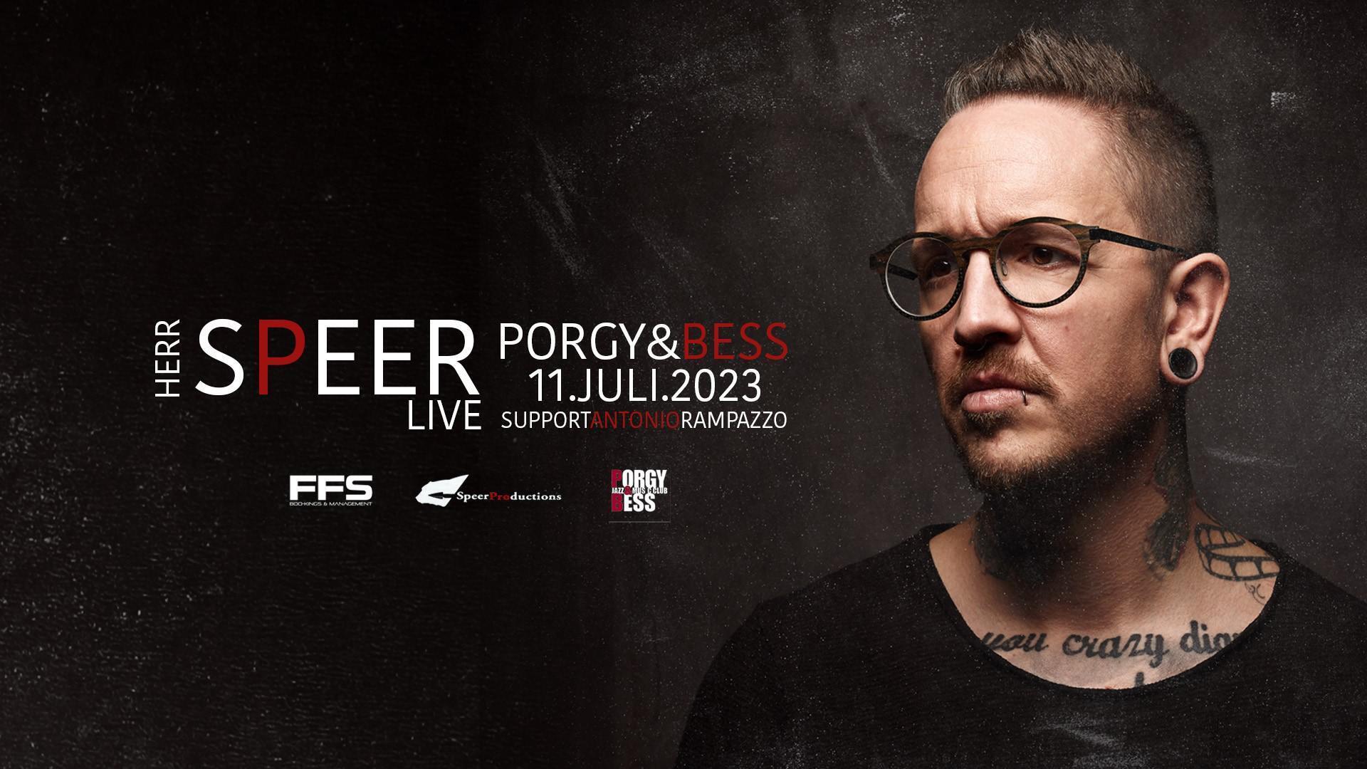 Es ist soweit, Herr Speer alias Bernhard Speer gibt sein erstes Solokonzert in einer der kultigsten Locations Österreichs, dem Porgy und Bess. Kurz davor, am 07.07.2023 erscheint die bereits dritte Solo Single vom kommenden Album, welches noch heuer veröffentlicht werden soll. Bevor es im Juli, zusammen mit Robbie Williams auf die große Bühne der Burg Hochosterwitz geht habt ihr am 11. Juli 2023 die erste und wahrscheinlich auch letzte Möglichkeit Herr Speer in so einer kleinen und exklusiven Umgebung live zu sehen.