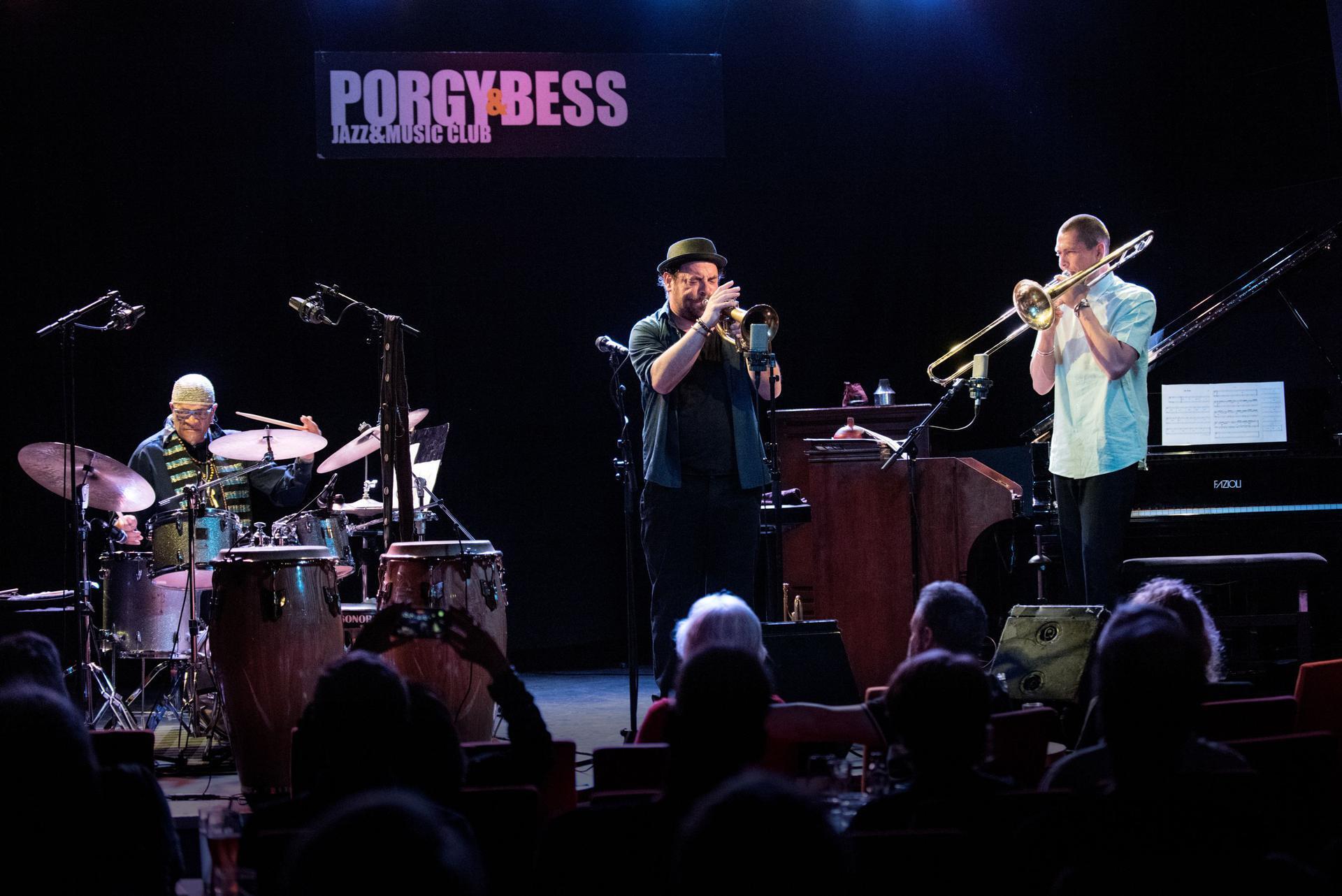 Nach längerer konzertanter Pause, Moye lebt seit geraumer Zeit wieder in Frankreich, konnte man sich von diesen Vorzügen seiner musikalischen Kunst einmal mehr überzeugen. Mit den beiden um etliches jüngeren Musikern des heutigen französischen Jazztreibens, offerierte Moye eine Rahmenhandlung des Jazz-Klassizismus. Federndes, vorwärtsdrängendes Time-Keeping und variierend, geerdete, repetitive auf gewisse Afrikanismen verweisende Schlagpattern, zwischen Schlagzeug und Congas wechselnd, gaben der Klangrede der drei die Grundierung. Dazwischen immer wieder Moyes genüssliche Klangfarben-Pointilismen. Gestaltet überwiegend in Up-Tempo-Fasson. Zusammengeführt in dem für den Schlagzeuger nach wie vor unerlässlichen Formkomplex: Klang-Rhythmus-Melodie. Verortet in einem modalen Funktionsraum. Solistische Handlungsfreiheit bzw. improvisatorische Kollektivität sind dabei vorrangig. Unpathetisch lyrische Versponnenheit, in Abtausch mit stakkatiert phrasierter Beflügeltheit setzte der Trompeter frei. Changesabfolgen überführte er in einfallsreiche, ungetaktete Melodieströme. Mit der Posaune traf er sich zu polyphonen Überkreuzungen großer Geschlossenheit. Der eben auch an der Posaune agierende Multiinstrumentalist Simon Sieger brillierte gleichfalls an Piano und Hammond und reflektierte großteils, mit gebührendem Eigensinn, den kompletten Jazz-Piano-Stilkanon. Eine ausgefeilte Spieltechnik befähigt in dazu. Obschon auch er sich einer konventionelleren Jazzauffassung zuwendet, ließ er ab und an losgelöste Tontraubenergüsse hervorbrechen. Nur in einer ausführlichen, simultan an Orgel und Piano erimprovisierten Solosequenz, outete sich Sieger zu imitativ als Jaki Byard Apologet. Doch wenn die Virtuosität zu sehr überkochte führte ein völlig entspannter Moye die Musik auf Herz und Seele zurück. Um dann mit aller Überlegenheit die Hörerschaft in das Erlebnis miteinzubinden, wie man mit Trommeln singen kann. Die einstige „Advancedheit“, die der „Great Black Music“ des Art Ensemble Of Chicago eingeschrieben war, nimmt Moye für sein heutiges Schaffen nicht mehr in Anspruch. Jedoch, er hält die für ihn relevanten Aspekte wie Jazz Moderne und afrikanische Bezugsquellen am kochen. Und die Art Ensemble-Philosophie eines universellen Verständnisses von Musik schwingt und swingt unerlässlich mit. Das Vermächtnis bringt Famoudou Don Moye auf einen für ihn gültigen Schlusspunkt. Nach wie vor „Great Human Music“. (Hannes Schweiger über das Konzert vom 16. Mai 2022)