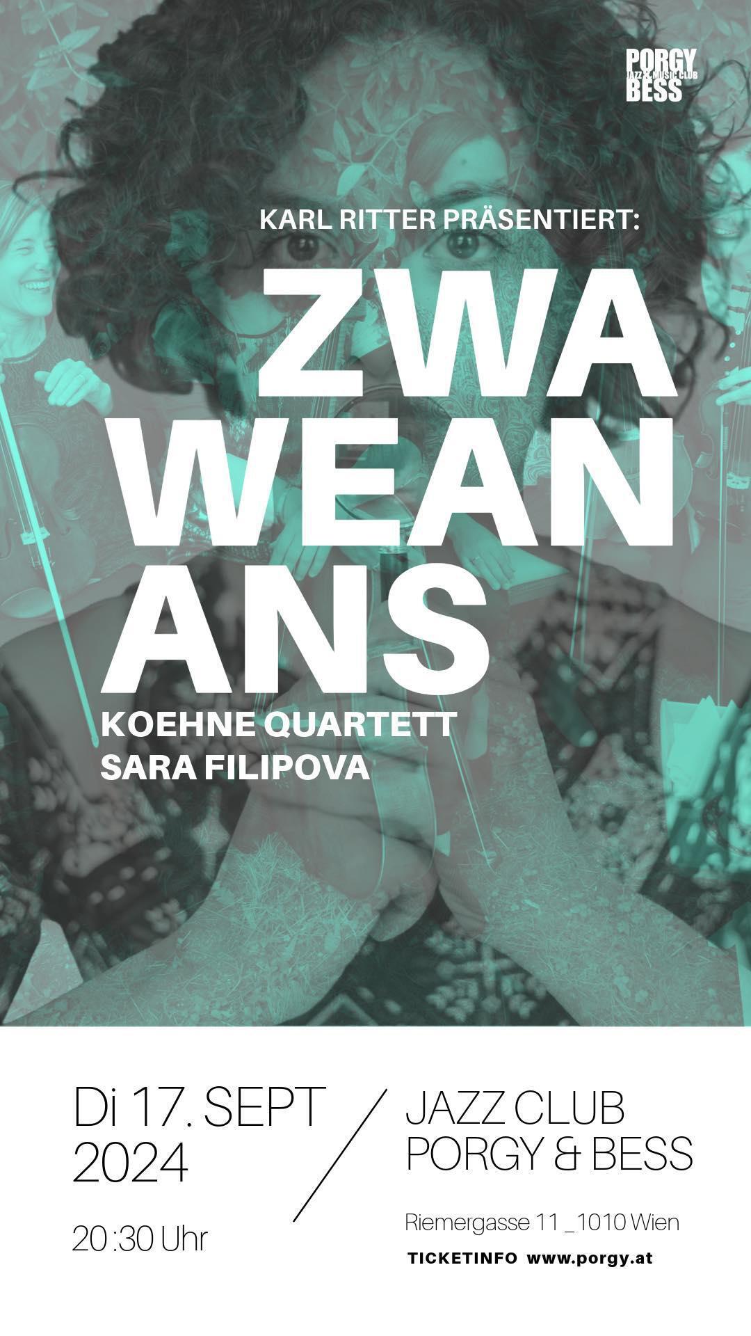 Bei "Zwa Wean ans" werden gleichzeitig zwei unterschiedliche Musikstücke aus den Genres Neue Musik und Popmusik aufgeführt. Dieses innovative "Parallelkonzert" vereint die außergewöhnlichen Talente der Singer-Songwriterin Sara Filipova mit dem virtuosen Koehne Quartett. Gemeinsam bringen sie ihre einzigartigen Klangwelten auf die Bühne des Porgy & Bess und schaffen dabei etwas vollkommen Neues und Einzigartiges.