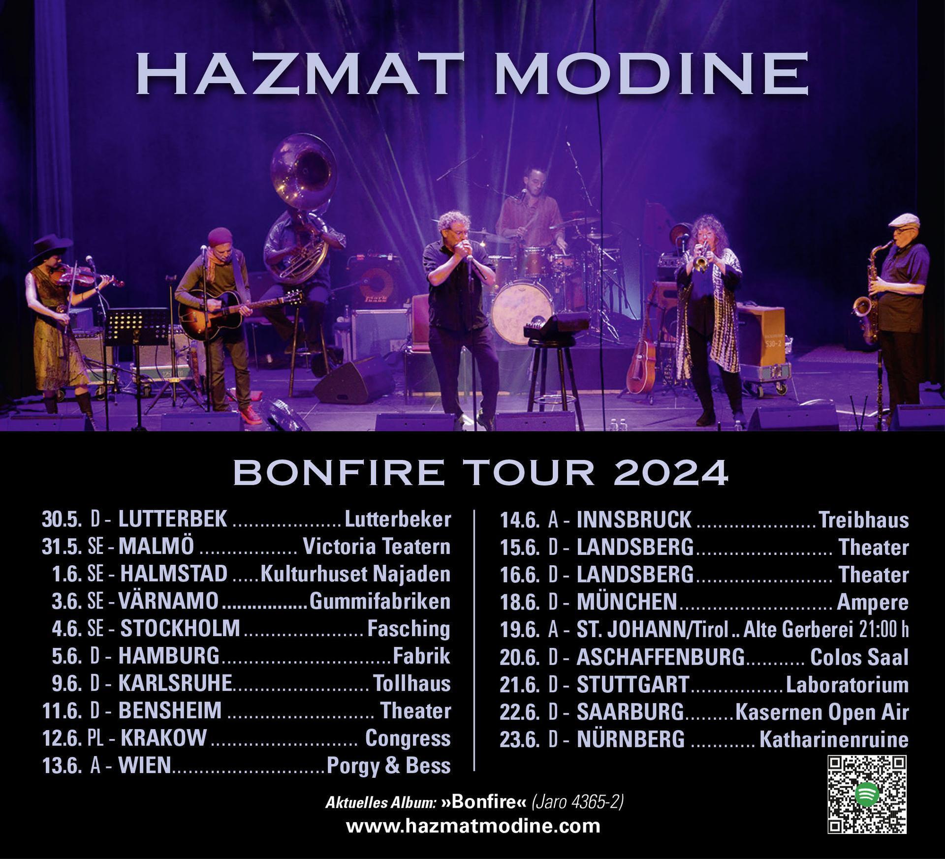 Seit Hazmat Modine 2007 das erste Mal nach Europa kam, haben sie sich eine riesige Fangemeinde aufgebaut und bereisten China, Australien, New Zealand, Malysia, Brasilien, Mexiko. Im Jahr vor Corona absolvierte die Band das erfolgreichstes Jahr in ihrer Bandgeschichte. Die CD Box of Breath schaffte in 10 Top Album Listen des Jahres 2019, in Australien in die Charts, in den Downloadcharts sogar unter die Top 5. Schon lange arbeitete Bandleader Wade Schuman mit Gitarrist Erik Della Penna an Songs, die dann auf der Sommertour 2023 auf der neuen CD Bonfire zu hören sind. Die gewährte Mischung aus Blues, World und Jazzelementen machen die Band auch nach 16 Jahren intensiven touren immer noch und wieder zu einem einzigartigen Liveerlebnis. Sie nennen ihr neues Album und die Lieder dort “als Lieder eines ruhelosen Amerikas, der Unzufriedenheit, der Besinnung, und der Hoffnung”. Neue Songs wie "Garden of Grievance" und "Too Fat to Fly" sind scharfe Sozialkritiken, die sich in musikalischen Stilen von 70er-Jahre-Folk-Blues bis Rocksteady bewegen. Andere Songs wie "Paulina" und "Late at Night" sind bewegende Country-Geschichten, die sich mit den Komplikationen intimer Beziehungen auseinandersetzen.