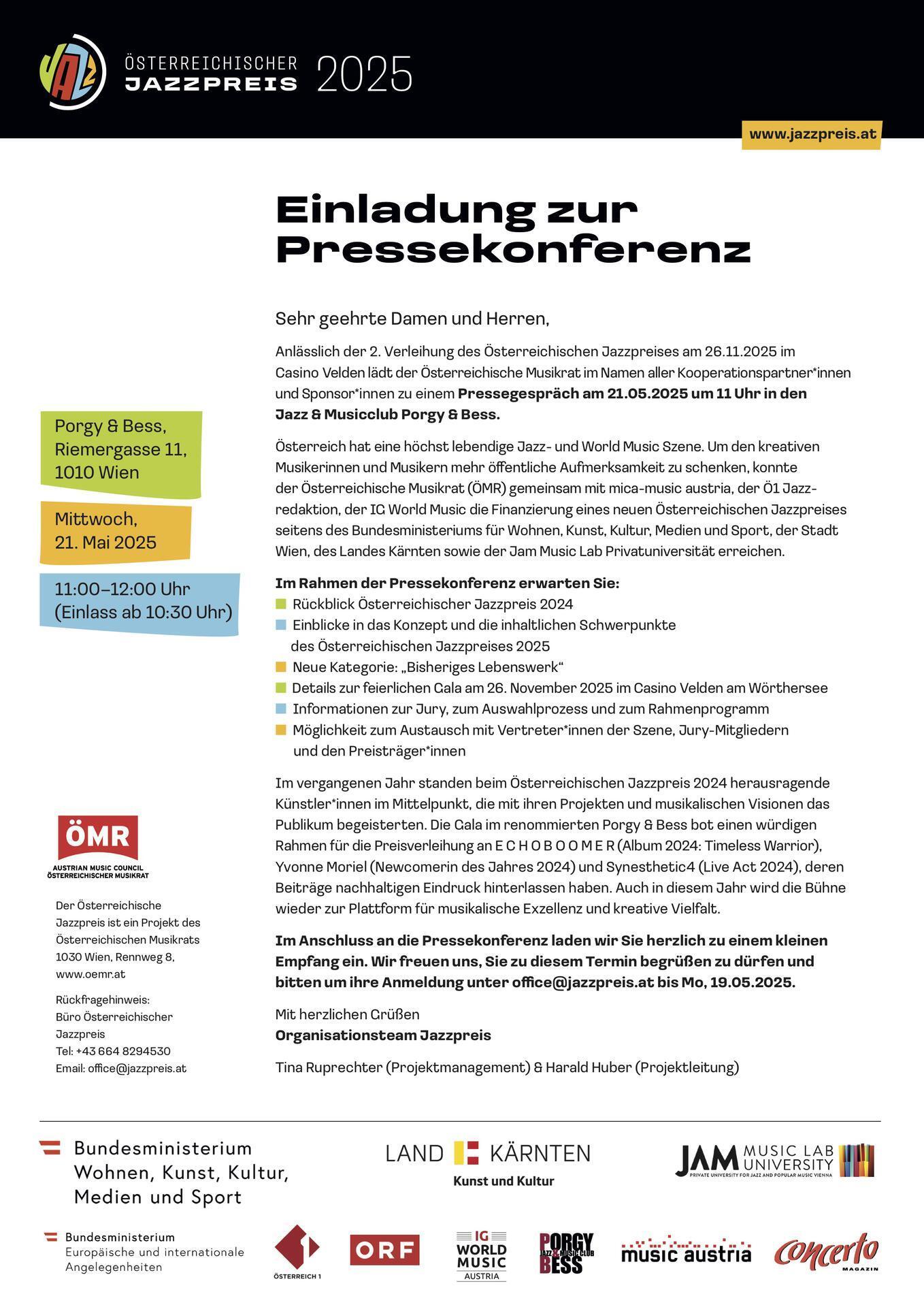 Anlässlich der 2. Verleihung des Österreichischen Jazzpreises am 26.11.2025 im Casino Velden lädt der Österreichische Musikrat im Namen aller Kooperationspartner und Sponsoren zu einem Pressegespräch am 21.05.2025 um 11 Uhr in den Jazz & Musicclub Porgy & Bess.