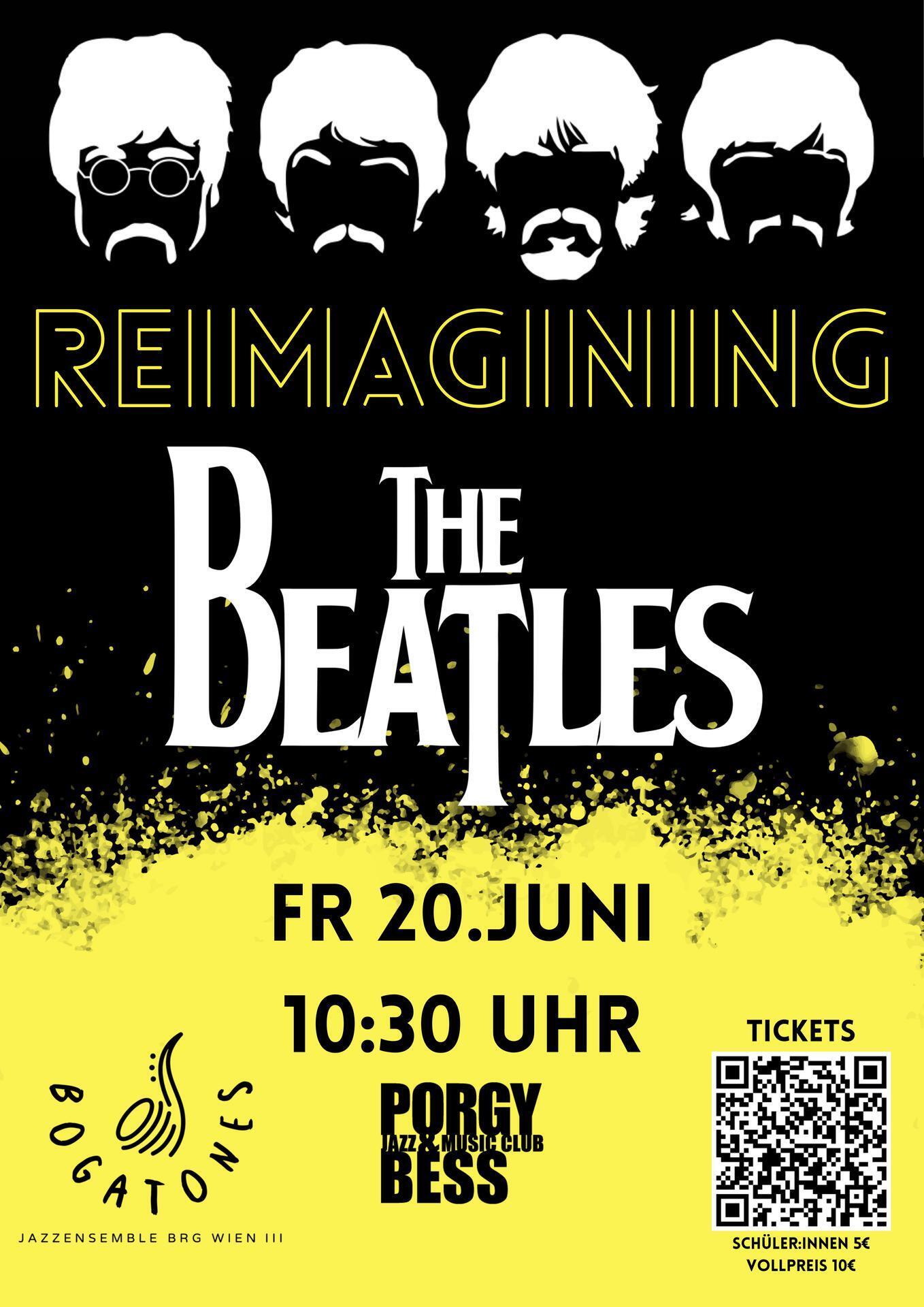 In diesem Tribute-Konzert präsentieren die BOGATONES – das Jazzensemble des BRG WIEN III Boerhaavegasse die so vielseitige Musik der Beatles. Das Besondere dabei: Ausgewählte Songs aus den erfolgreichsten Alben tre[en dabei auf verschiedene (jazz-verwandte) Stile wie Swing, Bossa Nova, Funk, Latin uvm. und erklingen so im neuen Sound – re:imagined. Von treibenden Funk- und Latin-Grooves bis hin zu kunstvoll ausgearbeiteten Arrangements – es ist für jeden Geschmack etwas dabei! Dieses speziell für Schulklassen konzipierte Konzert folgt dem Gedanken Schüler:innen musizieren für Schüler:innen und soll somit die Begeisterung für (Jazz-)Musik unter den Jugendlichen fördern. Dafür ö[net das Porgy&Bess seine Pforten – nicht zuletzt soll den Schüler:innen damit ermöglicht werden, diesen anerkannten Jazzclub als zentrale Kulturstätte kennenzulernen. Der Konzerttermin am Fr 20.Juni um 10:30, also am Freitag vor der letzten Schulwoche, soll den Ausklang des Schuljahres musikalisch einläuten.