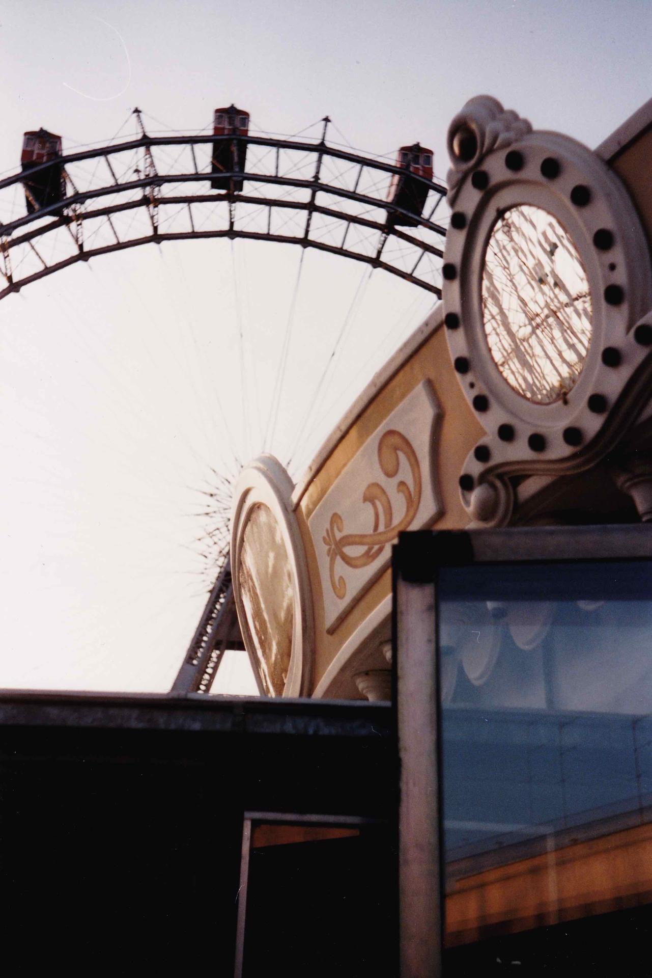 ...Er hat dann auch nicht weiters mit seinem Ansinnen hinterm Berg gehalten und gemeint, ich sei ihm als einziger eingefallen, der zu den Fotos etwas sagen könnte. Weil ich mich für Altersmilde und ergo auch dazu entschlossen habe, alle mir gegenüber geäußerten Freundlichkeiten platterdings als solche zu akzeptieren und nicht aus Ausdruck irgendeines Hintersinns oder von Desperatheit; und weil mir darüber hinaus gefallen hat, dass ausnahmsweise mal der Mann in der Manager/Musen-Doppelfunktion auftritt, habe ich zugesagt. Mir fällt dazu tatsächlich etwas ein, schon allein deswegen, weil ich auch ein Prater-Geher bin und dort auch gerne fotografiere. Außerdem ist uns beiden, Anne Marie und mir, gemeinsam, dass uns schon bei der Ansicht der meisten angeblich dem Vergnügen dienenden Geräte schlecht wird. Ich bin im Vergleich aber ausnahmsweise sogar der Unternehmungslustigere, denn ich bin nicht nur schon mit der Zwergerlbahn Heiligenblut, dem Donau-jump und der Wildalpenbahn gefahren, sondern habe mich auf Anstiftung meiner Tochter auch schon in den Volare-Rollercoaster spannen lassen. Das Härteste, was ich je gemacht habe, war freilich, mit der Dizzy Mouse zu fahren. Das ist insofern ein bisschen verwunderlich, als diese Attraktion, zu den Old-School-Vergnügungen des Wurstelpraters zählt. Beschleunigungs- und kotztechnisch sind andere Geräte gewiss wilder, aber gerade die Kurven in der Horizontalen haben es in sich und suggerieren ängstlicheren Benutzer, dass man jetzt wohl gleich aus dem Gefährt geschleudert würde. Dass die Benutzung der Dizzy Mouse tatsächlich nicht ohne Risiko ist, bewies ein Unfall im August vorigen Jahres, bei dem ein Urlauberkind „buchstäblich unter die Räder“ geriet – wie „Heute“ schrieb – und aus seiner misslichen Lage befreit werden musste. Abgesehen von seinen volatilen hat die Dizzy Mouse aber auch noch einen beträchtlichen ästhetischen Reiz: sie ist von einer gleichsam konstruktivistischen Eleganz, die besonders im Gegenlicht und im Kontrast zur symmetrischen Kompaktheit des Riesenrads besonders gut zur Geltung kommt. Wäre Vladimir Tatlin nicht bescheuert gewesen, er hätte die Dizzy Mouse gschaffen und nicht das Monument der Dritten Internationale. Sieht man von unserer Dizzymouse-sensibilität ab, beginnen hier aber schon erste Unterschiede. Ich habe eine Digi-Cam stets einstecken, hauptsächlich, um damit Wolken zu fotografieren. Anne Marie begab sich vor rund 25 Jahren an zwei Tagen – an den Fotos leicht wegen des stark unterschiedlichen Wetters zu unterscheiden: wolkenfrei oder stark bewölkt – ganz gezielt in den Prater, um mit ihrer am Flohmarkt erstandenen Kodak Retinett ganz bewusst zu fotografieren. Das Medium ist auch hier die Message, insofern, als sich die technischen Gegebenheiten und Beschränkungen dieser Form strikt analoger Fotografie ästhetisch manifest werden. Es gibt kein Teleobjektiv und keine Zoomfunktion, die Minimaldistanz, in der sich die Fotografin ihrem Objekt mit dem Objektiv nähern und scharfe Fotos von diesen manchen kann, beträgt einen Meter. Ich denke, dass Anne Marie kein dokumentarisches Interesse an ihren Motiven hat, und das auch der Blick, mit dem wir ihre Fotos betrachten, nicht auf die Identifikation eines historischen Augenblicks aus ist, jedenfalls nicht in erster Linie. Die detektivische Entschlüsselung der Tatzeit, wenn ich das einmal so nennen darf, wird durch verschiedene Umstände und Entscheidungen der Fotografin erschwert. Die Verwendung analogen Filmmaterials – Kodak 200, Entwicklung bei DM – versieht die Bilder mit einer gewissen Patina oder Aura, die weniger mit den Objekten als mit dem Material selbst zu tun hat. Anne Marie mag außerdem keine Menschen – jedenfalls nicht auf ihren Fotos. Womit das aussagekräftigste Indiz zur Identifizierung der Tatzeit wegfällt, nämlich die Kleidung. Selbst in den Totalansichten wird wenig sichtbar, was eine präzise Datierung ermöglichte. Das hängt natürlich auch ursächlich mit dem Tatort zusammen. Ein Vergnügungspark ist ein Ort der Collage und des Pastiche, der historischen und pseudo-historischen Zitate und der retrofuturistischen Gesten, und es ist woh kein Zufall, dass mich die Bilder ein wenig an die englische Fernseh-Serie „Life on Mars“ und „Ashes to Ashes“ erinnert, in denen ein verunfallter Detektiv in seiner Koma-Phantasie – so jedenfalls eine plausible Deutung – in ein Paralleluniversum aus den 70er- bzw. 80er-Jahren versetzt wird. Ich glaube, es gibt noch etwas, was Anne Marie und ich teilen: Eigentlich mögen wir den wurstelprater nicht besonders. Mir jedenfalls geht es so. Seit Kinderzeiten werden Praterbesuche stets auch von einer zarten Depression begleitet, der gleichen, die mich bei Zirkusbesuchen beschleicht. Die Melancholie, die mich anweht, resultiert, glaube ich, aus der Diskrepanz zwischen der Aufdringlichkeit eines Spaßangebots und meiner Unfähigkeit, es zu nutzen. „Fun ist ein Stahlbad“ schrieben Horkheimer und Adorno; im Prater ist es ein Zuckerwatte- und Frittierinferno: Alles ist zu süß und zu fettig. Das führt dazu, dass ich mir den Prater schöntrinke. Ich geh ja praktisch nur zum Saufen hin, und seit vielen Jahren treffen sich mein Freund Robert Rotifer und seine beiden Kinder mit meiner Tochter und mir am Weihnachtsabend gegen 17 Uhr in der Luftburg, um die depressive Valenz des Praters in vollen Zügen auszukosten. Im Unterschied zu mir ist Anne Marie Weintrinkerin. Ich vermute, dass sich die önologischen Offerte des Praters abseits der Haubengastronomie in stupend hässlichem Ambiente in Grenzen halten, und dass Anne Marie ergo darauf angewiesen ist, sich den Prater halt schönzuknipsen. Wobei ihr Zugang ja kein schlechterdings eskapistischer ist. Das was zu sehen ist, ist ja tatsächlich da. Und jeder Ausschnitt, jede Rahmung, ohne die ein Bild nun einmal nicht auskommt, verdankt sich einer Entscheidung, sei diese nun bewusst oder instinktiv gewählt. Dass Anne