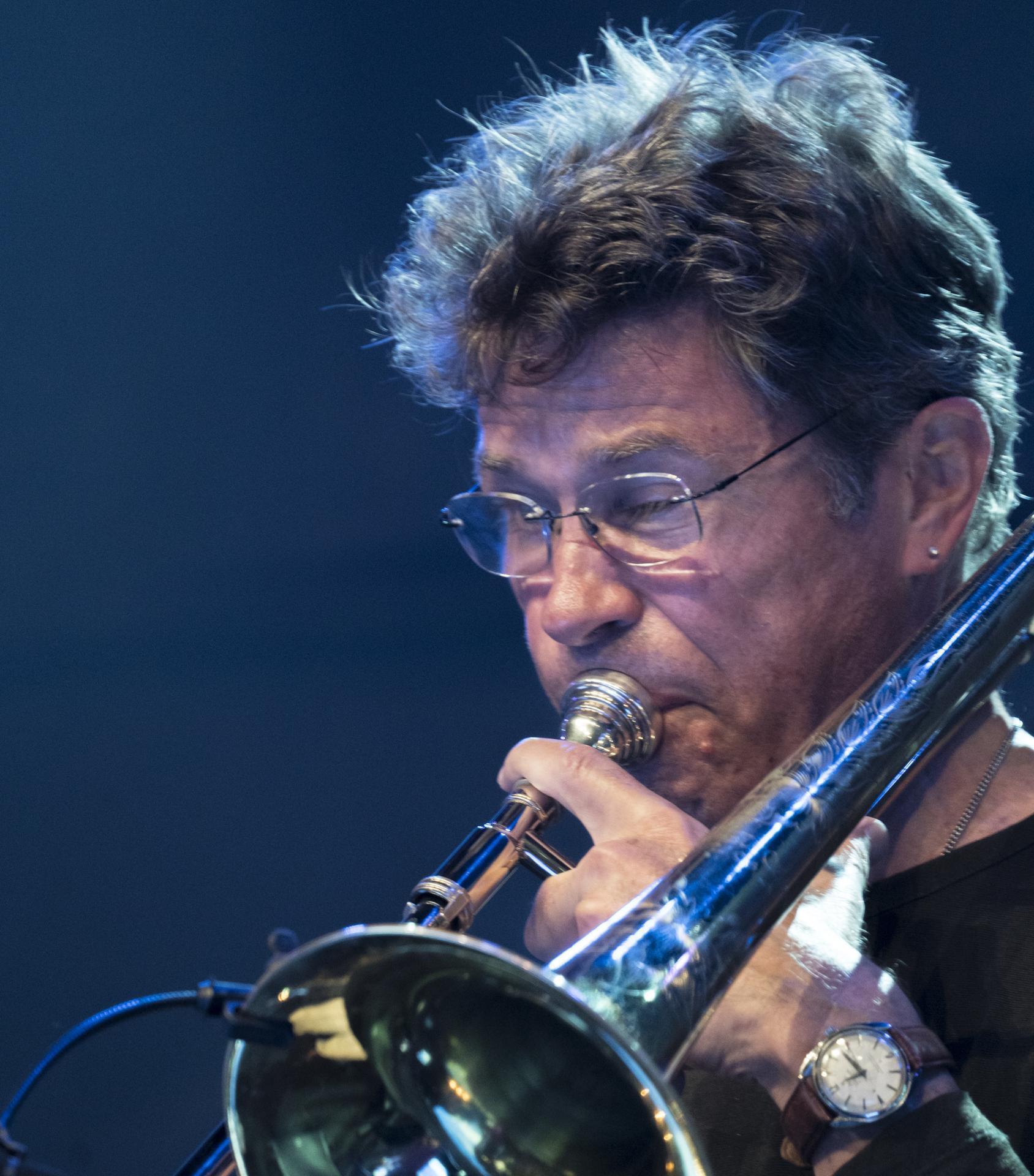 Ray Anderson, geboren in Chicago, hat sich schon früh mit kreativer Musik beschäftigt. Mit 20 Jahren wechselte er nach New York. Bald entstand um ihn, George Lewis und Anthony Davis eine aktive Szene der neuen Musik, die ihr Zentrum in New Heaven (Connecticut) hatte. Bekannt wurde er 1977, als er mit dem Anthony Braxton's Ensemble auftrat. Danach folgten verschiedene Plattenverträge und die Aufnahme der ersten CD unter eigenem Namen. Inzwischen geniesst Ray weltweite Anerkennung. Sein Name steht für unverkennbare, freche Solos von einzigartiger Originalität. Musik ist für Ray kein 08.15-Job, sondern eine Leidenschaft, der er sich mit Hingabe und sehr viel Witz widmet. Seine Posaune singt mal eine eher klassiche Improvisation, dann wieder ertönen Klänge, die man spontan nicht ohne weiteres einer Posaune zuordnen würde. Anderson weiss gezielt mit den vielfätigen Effekten einer gestopften Posaune zu spielen. Seine sprühende Spielfreude wirkt hochgradig ansteckend.