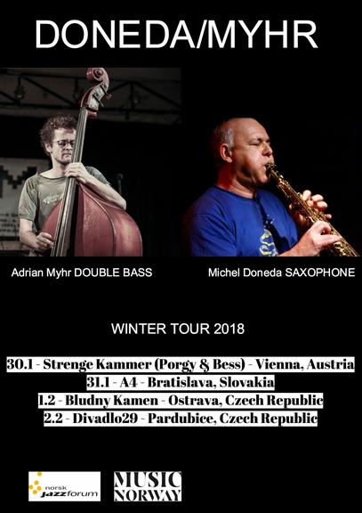 Doneda/Myhr plays acoustic free improvised music and have played together for many years. They have earlier toured Norway, Denmark, France and Switzerland as a duo and as a trio with the Norwegian drummer Tore Sandbakken, and also as a quartet with the video artist Xavier Querel. The winter 2016 they did their first concerts as a duo. In this duo they are exploring the sound possibilities of their instruments. The soprano saxophone and the double bass has a wide range to play with, from bright shrill tones to dark drones. They use alternative playing techniques and preparations to get music rich on textures. Michel Doneda is from France and has been active on the european improvisation scene in many decades. He has earlier worked with musicians like Le Quan Ninh, John Zorn, Fred Frith, etc. Adrian Fiskum Myhr is a bassist from Oslo and active in bands like Oker, Simiskina and Bansal Band.