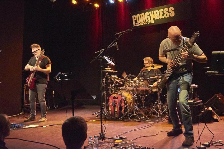 Wie ein Eisbrecher schoben sich die Soundblöcke durch grauschattierte Klangtopographie. Findige Arrangements kanalisierten vertrackte Rhythmusstrukturen, die zumeist im Mid-Tempo aus dem Schlagzeug hervor brachen und sich mit den kontrapunktisch gesetzten Melodierhythmen der Gitarren zu teils atemberaubenden Kapriolen vermengten, und die harmonisch-melodischen Motive in frickelige Abläufe. Schwellklänge prallten auf trashige Cluster, verwundene Bassfiguren umhüllten schlichte Songlines oder splittrige Klangmanipulationen. Asymmetrische Beat-Akzentuierungen und waghalsige Schlagkombinationen (die sich polyrhythmisch wie –metrisch austobten) verhalfen dem massiven Konvolut zu intelligenten Tanzschritten. Trotz alledem atmete die Musik eine faszinierende Durchlässigkeit. Resultierend daraus ergab sich gleichfalls eine spannungsvolle Balance zwischen fixen Spielvorlagen und offenen Gestaltungsmöglichkeiten. Wobei das engverzahnte Interplay ein gehöriges Fluidum an Spontaneität besaß. Was kollektiv wie solistisch zum Tragen kam. Gespeist aus einem Jazzverständnis, das auch modales Improvisieren begründete. Und ein bisschen museales Brimborium mit streicherlastigem Klangflächenpathos, das beim Rückgriff auf klassische Klangideale auftauchte, darf bei einem aufgeschlossenen Progressiv Rock-Feuerwerk ebenso nicht fehlen. Zum Glück hielt es sich im Rahmen. Beeindruckend war jener elektrisierende Sog und die klirrende Körperlichkeit ihrer Klangarchitektur. In den eigenen Stücken um nichts weniger als in den verdammt guten Version von King Crimson Klassikern wie „Larks´ Tongues In Aspic“ oder „Level Five“. Ein Zusammenhalt wie Dur & Moll in ansprechend exzentrischer Collagierung.