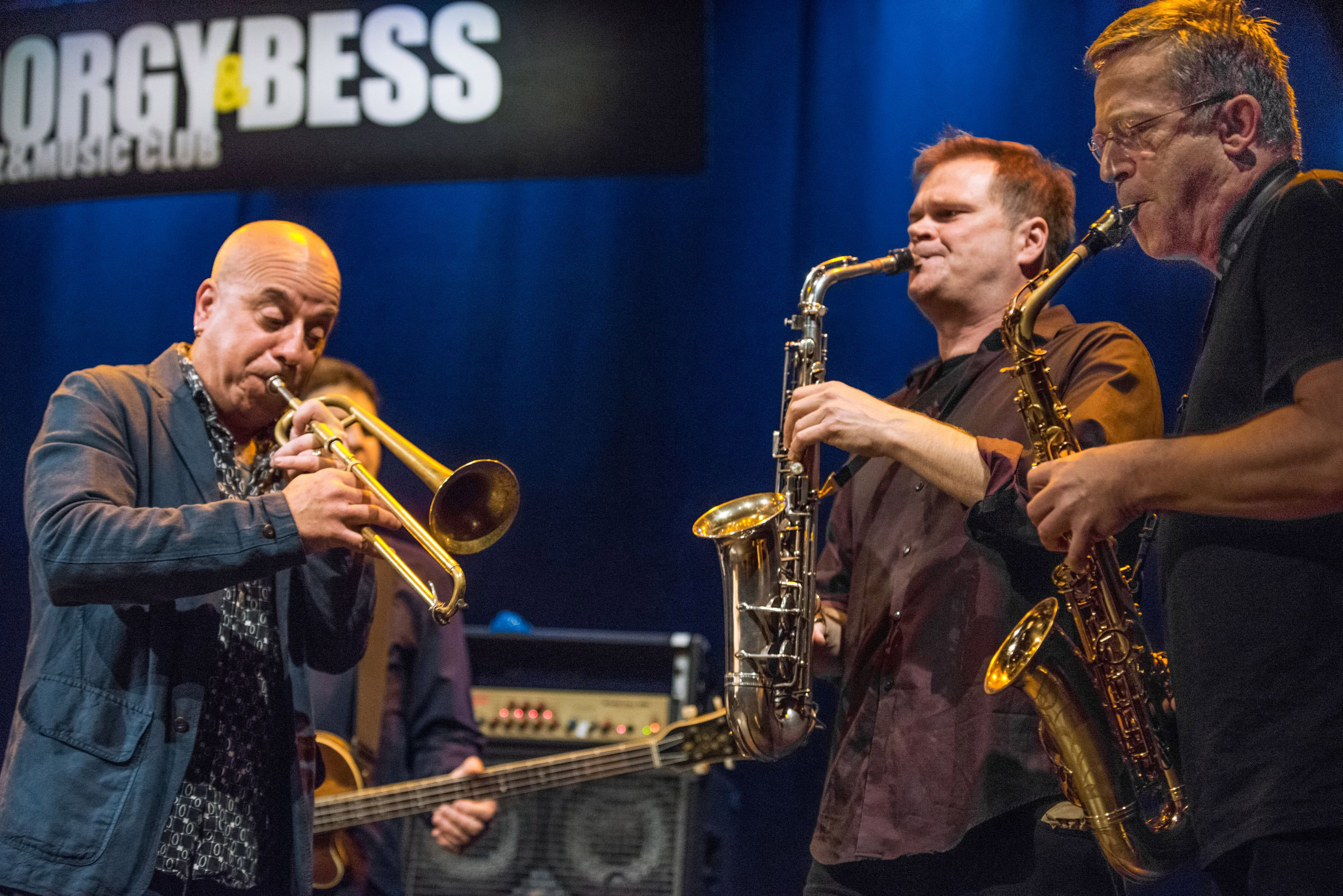 Alleine schon ihre Bühnenpräsenz und das einhergehende Erscheinungsbild respektive die erheiternden Ansagen des kauzigen Bernstein, waren die Vorboten eines vergnüglichen musikalischen Ereignisses. Und die Herrschaften tanzten auch nicht lange um den heißen Brei herum. Schnurstracks warf Kenny Wollesen einen sophisticaten, rockaddicted Groove ins Geschehen. Tony Scherr mischte entsprechend, mit überlegener Entspanntheit, defragmentierte, fette Hooklines hinzu. Darüber fuhrwerkten Stephen Bernstein, Mr. Slide Trumpet par exellence, und der berstend impulsive Briggan Krauss mit aberwitzigen Unisonokapriolen und Call & Response-Strukturen. Im Laufe der grandiosen Performance gesellten sich von Bernstein spontan initiierte kontrapunktische Finessen hinzu. Was soll man sagen, die vier Kapazunder sind enorm sattelfest was die Jazzanalen betrifft. Von dort schöpfen sie ihr „Cultural Capital“. Wurden tradierte Funktionalismen und Formgebungen angezapft, wobei sich Bernstein, Hauptkomponist und Arrangeur der Band, bevorzugt im BeBop-Terrain herumtreibt, schwang, geschmacksicher gehandhabt, Schelmisches mit. Doch es fehlte nie an Seriosität, wenn eine swingende Horde an Klängen in eine Rockwalze umkippte, wenn lässige Neo-Bop Figurationen in einem entfesselten Klangfarbenfurioso, teils versetzt mit typischem NY-Down Town Trash, explodierten, wenn Interpretationen von Filmmusiken Nino Rotas, Zitate eines Ellington Tunes, Tangoeinsprengsel oder La Banda bzw. Marching Band Anklänge mit liebenswürdigen Understatements in diesen so hinreißend originellen, flockigen Sex Mob „Klangkapitalismus“ transformiert wurden. Grandios, die dabei angewandte kollektive Energie, diese uneitle Perfektion und, analog zur Konzeption, das solistische Grenzgängertum eines jeden einzelnen. Apropos solistisch: mit einer derartigen Aufgabe war als Gast in zwei rhythmisch wie arrangementtechnisch verschachtelten, hochdramatischen Stücken, mit Up-Tempo Motorik, zusätzlich die österreichische Saxophongröße Max Nagl betraut. In gelösten, quecksilbrigen Improvisationen verdeutlichte er die einhellig stimmige “Chemie“ zwischen Bernstein und ihm. Nicht zu kurz kam ebenso die sentimentale Ader des Kollektivs. Da wurde ausgebreitet, mit welch hinreißendem Herz/Schmerz man auch „schnulzen“ kann. Auge blieb da keines trocken. Und in einem kurzen „Sing Along“-Stück verpackten Bernstein & Co eine spaßig feine Würdigung an Porgy & Bess Mastermind Christoph Huber. Das spricht doch Bände. Sex Mob verkörpern die pluralistischste, zeitgenössische Form der harmonieinstrumentelosen Jazzquartett-Konzeption, mit der Gerry Mulligan dereinst Jazzgeschichte schrieb, die Ornette Coleman in neue Sphären führte und die John Zorn abermals verdichtete und von den „Geschlechtsreifen“ nochmals stilästhetisch gehörig durchmischt wurde.