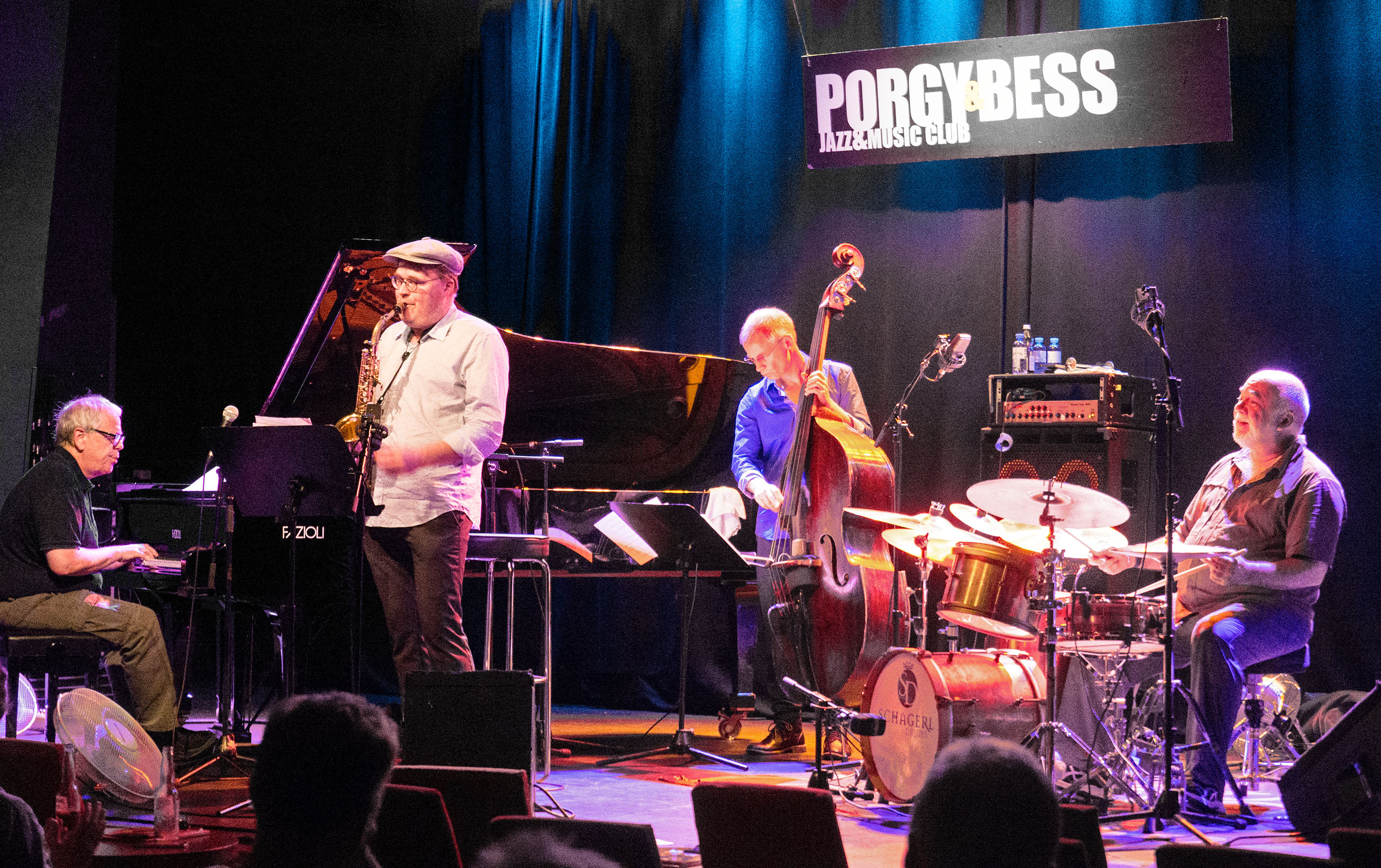 Quartett-Kunst im jazzklassizistischen Sinne. Gebot eines Zusammenschlusses zweier gewichtiger „Obrigkeiten“ der jüngeren Jazzgeschichte, Erskine und Werner, mit zwei profunden Routiniers der Nachfolgegeneration, dem Deutschen Johannes Weidenmüller und dem Dänen Benjamin Koppel. Über Jahrzehnte sich bei unterschiedlichsten musikalischen Gelegenheiten kreuzender Wege hinweg, sind die vier bestens miteinander vertraut. Dieser Umstand klang in jedweder Geste an und hievte das Interplay auf ein explizit hohes Level. Voraussetzungen die a priori ein offenformatiges und wagemutiges hantieren mit der Modern Jazz-Tradition, womit sich Erskine und Werner schon unzählige Male essentiell profiliert haben, begünstigen würde. Doch die Verpflichtung jener Tradition gegenüber gelangte in diesem Quartett nicht zu einer aktualisierten Standortbestimmung, sondern erschöpfte sich im zu plakativen Aufgreifen von Stereotypen und Routinen. Zumal sich die Motivzellen der Stücke, deren Urheberschaft großteils bei Erskine bzw. Werner lag und die zumindest nicht immer als Intro fungierten, häufig als ziemlich süffig, manchmal fast schmalzig, auswiesen. Demzufolge waren auch die Chorusse und spontanen Improvisationen nicht ganz frei von Klischees. Die wurden dann beispielsweise im Zuge der Adaption einer bachschen Fuge respektive romantischen Schwärmereien des Pianisten überstrapaziert. Jedoch kann man weder Werner noch dem Saxophonisten melodische oder harmonische Dürre nachsagen. Somit schlich sich die Erkenntnis ein, dass der vorweg eng abgesteckte tonale wie formative Rahmen beschränkend wirkte. Aber auch die angewandte Tempokonzeption war über weite Strecken zu gemächlich gewählt. Der Schaumgebremstheit rückte Erskine zwar mit bewährt exzellentem Spiel, dynamisch variabel konturierend, mit melodischem Spürsinn angereichert, über einem Set mit exquisitem Fein-Tuning ausgebreitet, auf den Pelz, brach jedoch die Lauschigkeit ebenso wenig auf, da er als Impulsgeber letztendlich zu inkonsequent war. Nichts desto trotz versorgte er die Musik mit einer feingliedrigen Rhythmusstruktur, die deren Fließvermögen garantierte und die Ereignishaftigkeit an Farbe gewinnen ließ.