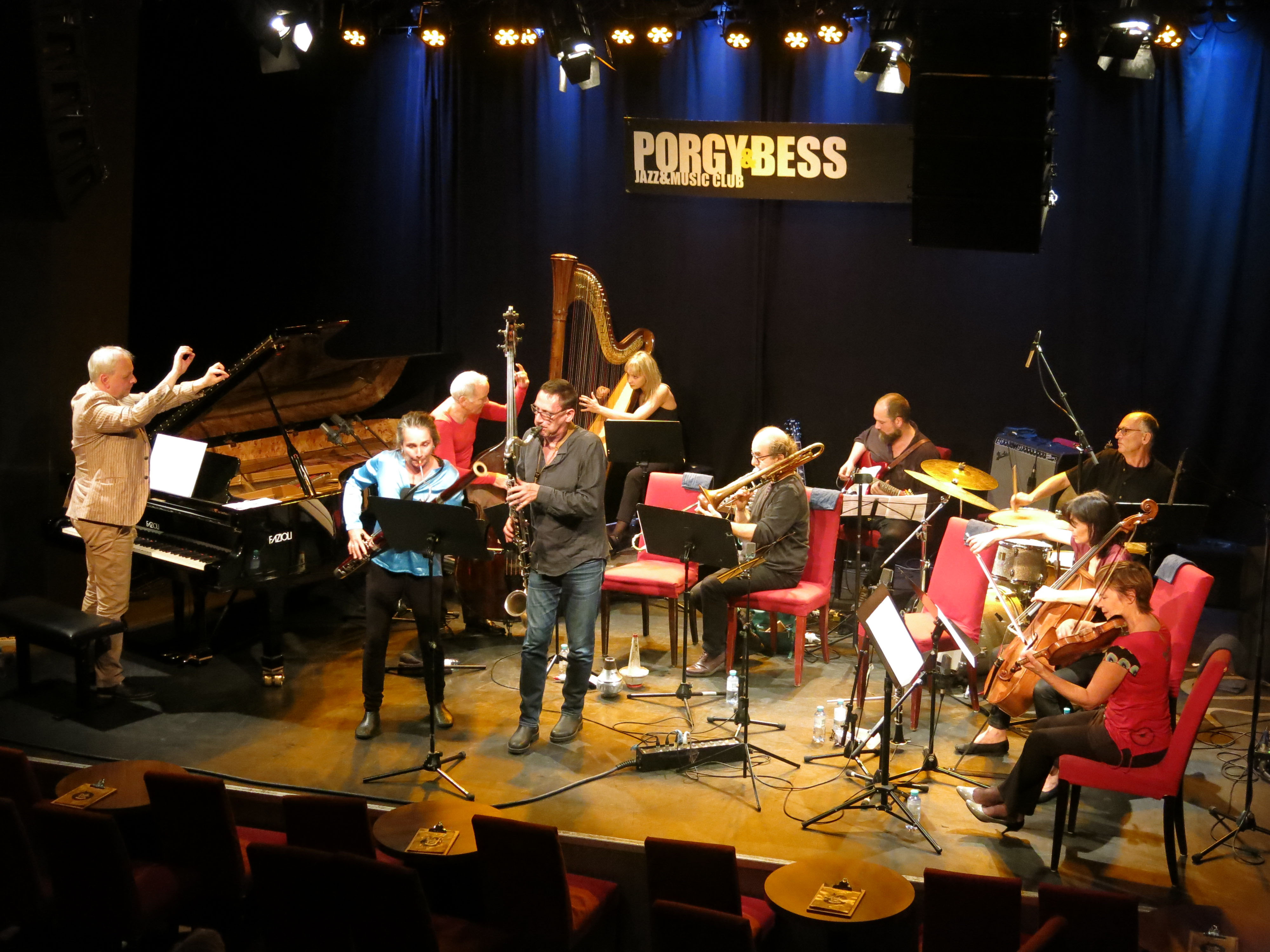 Georg Graewe (p, cond), Frank Gratkowski (cl, bcl), Maria Gstättner (basson), Sebi Tramontana (tb), Sara Kowal (harp), Martin Siewert (e-g), Joanna Lewis (v), Margarethe Herbert (cello), Peter Herbert (b), Wolfgang Reisinger (dr)