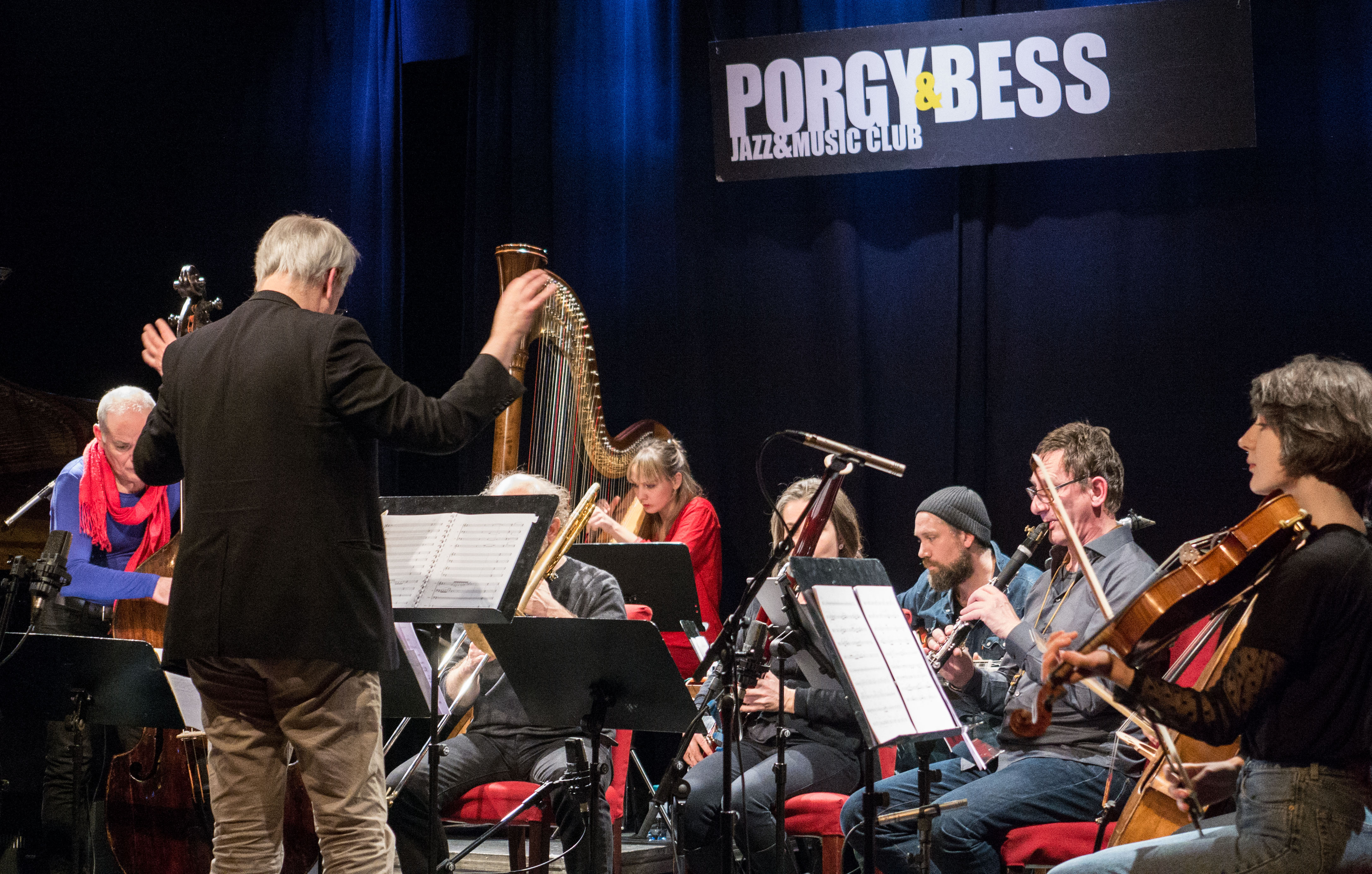 Auch für seine vierte Präsentationphase hat Georg Graewe die Basispartitur seines Stageband-Projektes umgeschichtet. Mit genau jenem Feinsinn für Dramaturgie und Überraschungsmomente ließ er aufs neue vorgefertigte Klangbausteine mit Momentkreationen in ergebenster Weise harmonieren. Kein unfreiwilliger Bruch, keine Verirrung in der Kommunikation, keine vordergründige Klanggebärde besetzten je Graewes Konzeption noch die Umsetzung/Freiverwaltung des Ensembles. Wiederum faszinierte der selbstverständliche, kreativitätkitzelnde Synergismus der Tugenden der europäischen Musiktradition und dem Jazzkanon. Ein Elementarfokus im Schaffen des Pianisten, der mit unverminderter Tatkraft an der Ausdifferenzierung seiner außergewöhnlich individuellen, musikentwicklungsgewichtigen Klangsprache als Instrumentalist wie Komponist feilt. An diesem Abend erklommen die „Erfinder“ schon einmal einen ersten Klimax. Vorbereitet mit einem unbegleiteten Piano-Solo. Graewe tauchte es in abstrakt gedachten, unprätentiösen Lyrismus, durchflutet von harmonischen Kühnheiten. Fingerfertig mit federndem, aber um nichts weniger präsenten Anschlag, verdichtete es sich zu einem rauschhaften, unbeschreiblichen Trio mit Herbert und Reisinger. Jetzt illuminierten die rhythmischen und perkussivklanglichen Details nochmals eindringlicher. Apropos Herbert und Reisinger, mit ihren eingedampften, nuancenreichen Klangreden, rückten sie Bass bzw. Schlagzeug-Soli in gänzlich anderes Licht. Ein famoses, klangfarblich unerhörtes, bedachtsam klangenergetisches Duett zwischen Fagott und Bassklarinette erregte sodann die Aufmerksamkeit. Ihre engvernetzte Zweistimmigkeit wurde vom restlichen Ensemble mit punktuellen, dissonanten Interventionen aufgeraut. Derartige weitere Spannungssteigerungen setzte Graewe mit aus dem Ensemblekontext herausgelösten Kleingruppen, die zumeist aus den Vorereignissen ihre intuitiv improvisierten Empfindungen artikulierten. Überwältigend z.B. ein Trio aus Harfe, Posaune und E-Gitarre. Eine elektrisierende Kombination, der am Ende Siewert mit überlegter Attack und einem Klangfüllhorn die Krone aufsetzte. In wunderbarer Balance schwebte auch die Kombination Piano und klassische Saiteninstrumente. Dazwischen immer Auflösungen oder Komprimierungen im Großformat. Auf Basis dieser Wechselwirkungen formte Graewe ein eingeschworenes Kollektiv. Er kann die Musik zusammenballen oder auseinanderfließen lassen ohne sie der Intensität zu berauben. Warum sollte es dann plötzlich nicht ebenso in ellingtonscher Geschmeidigkeit und Eleganz swingen? Das tat es, hinreißend. Graewe ist zu einem musikalischen Modell gelangt, bei dem sich die Nachfrage betreffend komponierten und improvisierten Abschnitten nicht stellt. Wie merkte Pierre Boulez einmal an: „Zwischen Spontanem und Gelehrtem besteht von Natur aus kein Unterschied….der Impuls kann die Reflexion ebenso anstacheln wie das Kalkül die Geste beleben kann.“ Und Graewe lebt das. Bleibt noch festzuhalten, dass er mit seinem Sonic Fiction Orchestra das derzeit inhaltlich relevanteste großformatige Konzept entworfen hat und zum engsten Kreis wegweisender, zeitgenössischer Jazzkomponisten zu zählen ist. Besser kann man sich nicht empfehlen. Brisante Hörstation.