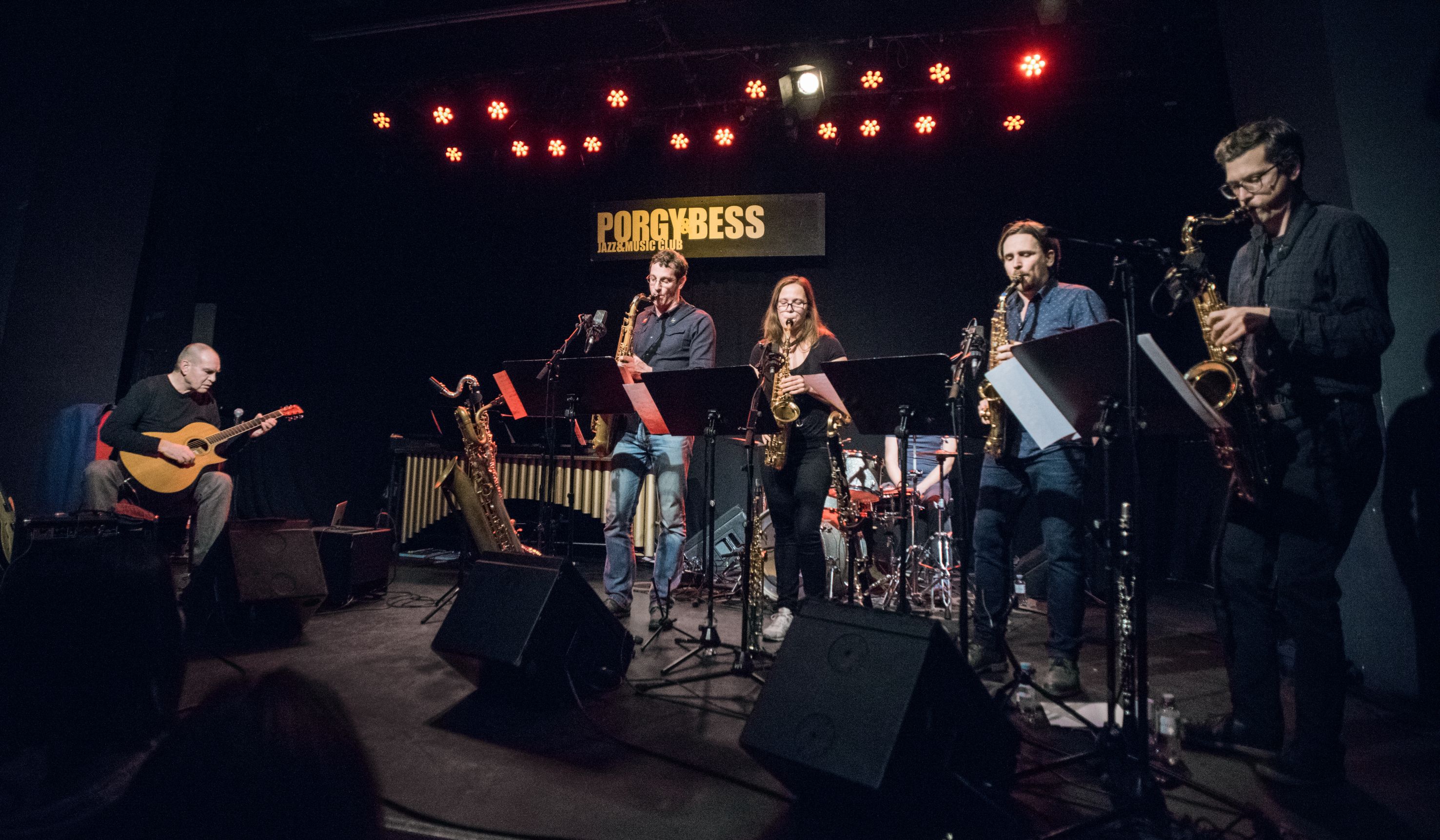 Abermals hat Karl Ritter, dieser unentwegt forschende Freigeist, mit seiner neuesten Kreativgeburt einen herausfordernden, spannungsgehäuften Versuchsballon gestartet. Inhaltlich dreht es sich um zwei unabhängige musikalische Verlaufsstränge, Festgelegtes und Spontanes stehen in gewinnbringender Balance, die simultan in Klang gesetzt werden. Ritter entschloss sich, einer nur marginal beleuchteten Konzeptidee neue Nahrung zu geben. Füllige Wirksamkeit und Standfestigkeit dominierender Kollektivität sowie die Parallelführung musikalischer Ereignisse sind die tragenden Säulen dieses spleenigen Organisationsprinzips. Für deren Umsetzung ihm zur Seite stand wiederum ein handverlesenes Ensemble fähigster, jüngerer MusikerInnen des inländischen Jazzpools. Großartig wie sie diese Konfrontation in Schlüssigkeit gossen und mit vibrierenden Empfindungen durchzogen. Ausgang nahm der „Crashtest“ von einem versprengten, unbegleiteten Solo Ritters, gesäumt von Splittrigkeit, weiten Intervallsprüngen und kleinen harmonischen Querverstrebungen – outstanding. Diesem Impuls folgte ein kurzes, lautstarkes freies Inferno von Gitarre und Schlagzeug, das der Noise-Rock Ästhetik zugeneigt war. Dahinein stach Viola Falb mit scharfkantigen Sopransaxophon-Arabesken und leitete das Geschehen in melodischen Wildwuchs über. Jenes Trio rief die restlichen Musiker auf den Plan. Alsbald nahmen die zugrundegelegten Strukturen der beiden Stücke Gestalt an. Ritter bildete mit dem Schlagzeuger sowie dem Marimbaspieler einen Verbund, ebenso die vier SaxophonistInnen, aka Phoen. Bekundeten Erstere die rhythmischen Elementarkräfte – in and out of time und gerne auch mit Rock-Impetus, frohlockte das Saxophonquartett mit ausgelassenen Polyphonien und Klangfarbenschöpfungen eines risikobereiten Jazzverständnisses. Separate Spurenführungen der Klangverbände waren zwar nicht einfach auszumachen, als entscheidend galten letztlich die Reibungen, Durchdringungen, Synthesen beider Eigenschaften. Kollektive Clusterhäufungen wechselten in spontanem Reaktionsverhalten einerseits, angewiesenen Instruktionen andererseits, mit kontrapunktischen Labyrinthen, kristallinen Klangflächen oder verschachtelten, zappaesken Spielereien. Was wiederum die ProtagonistInnen gleichfalls anhielt, solistisch das Heft in die Hand zu nehmen und aus den Rahmenbedingungen auszubrechen. Ausnehmend imaginativ taten dies Viola Falb am Sopran und Marimbavirtuose Raphael Meinhart. Dazwischen blitzen immer wieder klangliche Details, wie glühend funkige Riffs, barocker Hauch, coole Bop-Lines, Rockerdigkeiten kulminierend in einem subjektiven Klangsog, auf, die Ritter in seiner unnachahmlichen Lockerheit hervorquellen ließ. Gleichfalls beschwört er anhand dieses „Aufpralls“ die “Barrierefreiheit“ seines musikalischen Denkens/Fühlens. Bindet den Maelstrom aber deutlicher als sonst an ein avanciertes Jazzidiom. Diesem Projekt sollte er zeitlich intensiver und inhaltlich vertiefend nachgehen. Aufrichtig gelebte Integrität, Direktheit, Leidenschaft.