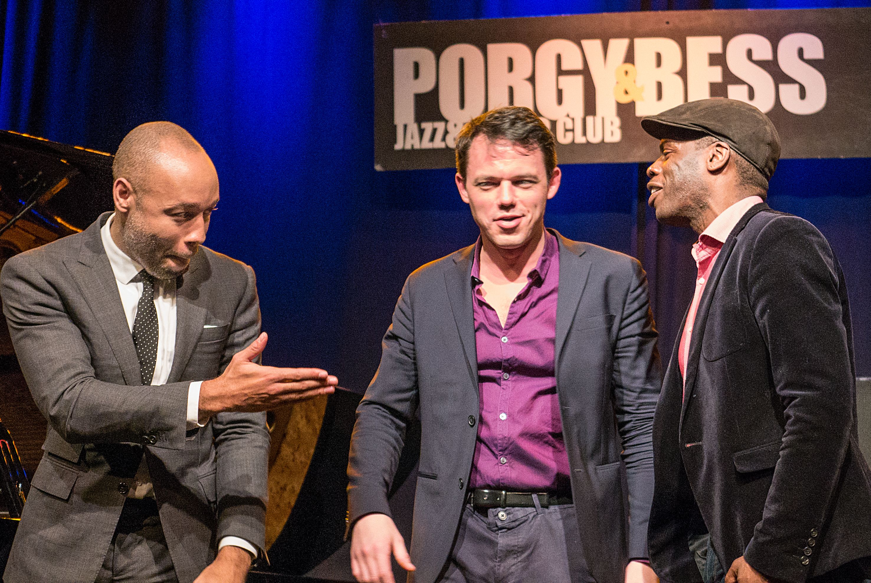 Nicht von ungefähr platzierte der stupende, junge afro-amerikanische Pianist Aaron Diehl, in unseren Breiten, wenn überhaupt, vor allem bekannt durch seine musikalische Partnerschaft mit dem derzeit hellsten Stern am Jazzsängerinnen-Himmel Cécile McLorin Salvant, eine Hommage an den bedeutenden Jazzpianisten und –komponisten John Lewis, dessen zweiter Vornahme im Übrigen Aaron lautete, an den Beginn der Performance. Angelegt als Medley zweier Lewis Widmungen einer weiteren tastenbeherrschenden Jazzgröße, Roland Hanna, und dem Lewis Original „Milano“. Wie kaum ein anderer aus der jungen Pianistenriege erhellt Diehl die wegweisende Konzeption und Stilistik Lewis´. Die Ausgewogenheit von fixiertem Material und dessen improvisatorischer Weiterführung in einem Gesamtzusammenhang und die Kunst des Auslassens, elastischer Kontrolle, lyrischer Sensibilität als Stilist mit einer kohärenten Tastenkultur. Ähnlich seinem musikalischen Ahnen integriert Diehl kenntnisreich Formen (z.B. Fuge) und Klangästhetiken der europäischen Tradition. Oftmals als Andeutungen oder Bruchstückmotive. Bar jeglicher Epigonalität oder Plakativität. Unter seinen Händen  fließen all die Parameter in einer exzeptionell eigenen Diktion zusammen. Seine Fähigkeit zur Feinkalibrierung von Akkordprogressionen aus dem Moment heraus ist ebenso schlüssig, wie ausnehmende Transparenz und Plastizität in den Improvisationen. Diehl vertritt die Tonalität, die er aber feinfühlig und vorbehaltlos durchmisst. Sein spontanes Extemporieren steht immer im Bezug zu den Äußerungen seiner Partner. Erklärte Rollenaufteilungen sind, entsprechend den epochalen Reformen des Pianisten Bill Evans in diesem Trio gleichfalls aufgehoben. Besonders mit dem Schlagzeuger verband Diehl an diesem Abend ein sensorisches Einvernehmen. Unentwegt überraschten sie mit rhythmischen und klanglichen Details oder fanden sich zu irrwitzig rasanten Unisonopassagen zusammen. Aber auch sonst betörte der Drummer. Blitzschnell verlagerte er die Akzentuierungen. Vor den Beat, hinter bzw. genau auf dem selbigen oder setzte pointierte Komplementärrhythmen gegen die Melodierhythmik von Piano und Bass. Ausgelegte Pattern wurden spontan aufgesplittet, neu gruppiert, die Time dynamisch und klanglich mit Vielfalt sondergleichen differenziert. Gleich sensibel wie Diehl ging Hutchinson an sein Instrumentarium heran. Blieb aber ständig präsent  – Hi-Fly. Bassist Sikivie markierte den kohäsiven Pol des Trios. Mit einem außerordentlichen Gespür für Swing und emanzipierter Melodieauffassung. Einem packenden Bass-Solo gab er mit Mingus-Zitaten zusätzlich Profil. Auffallend war, dass Aaron Diehl in seinem Jazz-Kontinuum hinsichtlich der Jazzhistorie auch an die Anfänge zurück geht und einen homogenen Bogen zu tonalitätszentrierter, neo-klassischer komponierter Musik spannen kann. Dank des Vermögens die Mikrostrukturen diverser musikalischer Formalismen herausdestillieren zu können, wird eine Verlaufslinie von Jelly Roll Morton, mit einem Abstecher zu Serge Prokofieff, zu Phillip Glass erlebbar. Das Idiom der Jazz Moderne erfährt durch Diehls Ansatz in ihren Formmöglichkeiten eine weitere vorwärtsgewandte Fassette. Geleitet von einem immensen emotionalen Tiefegrad. Transmission of Tradition – now.
