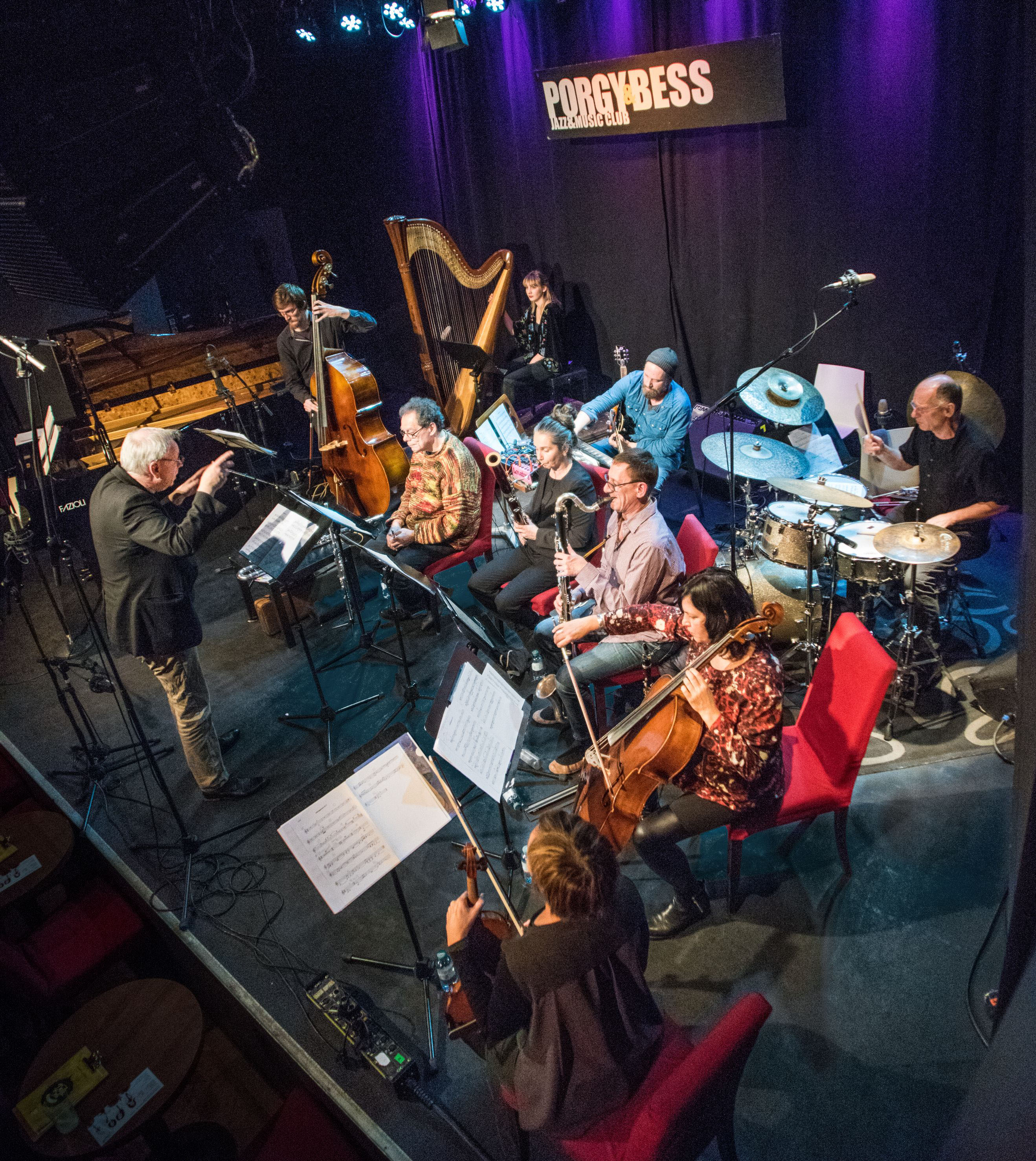 Als Assemblage moussierender Motive angelegt, in Cluster oder nonkonforme Mehrklänge gebündelt, begab sich Graewe mit Kienberger und Reisinger auf eine blindfliegende Trioimprovisation von gewohnt geschmeidiger Rasanz und perlender Fantasie. Joanna Lewis rührte mit einem imaginativen Geigensolo, irisierend im Ton. Substitut-Bassist Kienberger ist ebenso ein hervorragender Arcospieler, was er sowohl solistisch als auch im Kollektiv, dort verantwortete er in Korrespondenz mit den anderen Streicherinnen eine dichtere Klanglichkeit, klarlegte. Final ging Martin Siewert durch die Decke. Fulminant im Zuge einer nonidiomatischen Entladung – zwischen grell und herb, klirrend zugespitz und distroted at it´s best. Auch hier, wie in den meisten Situationen war Wolfgang Reisinger der rhythmische Brennpunkt. Agogisch meisterlich, zumeist frei akzentuierend, klangfarblich erlesen – einen unwiderstehlichen Drive auslegend. Zusammengehalten in einem elastischen Arrangementnetz in dem Form und Ungewissheit essentielle Komponenten sind. Georg Graewe hat, den musikalischen Kosmos als Einheit verstehend, einen Berg versetzt. Wenn man Kategorisierungen bemühen möchte, ließe sich sagen: Der Third Stream ist zum New Stream mutiert.