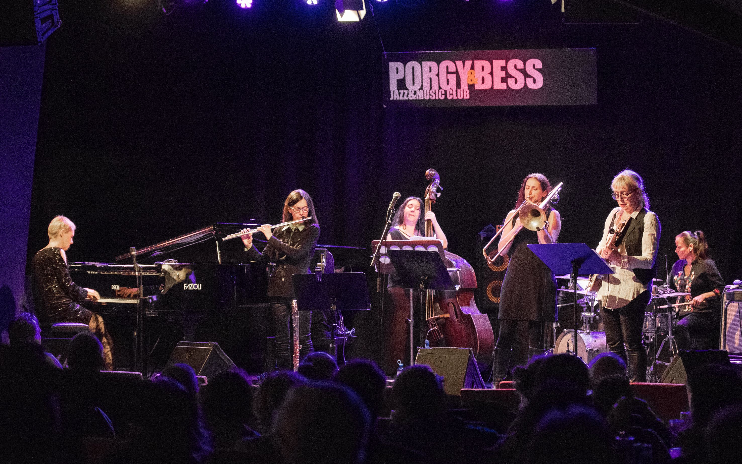 Heutzutage wird es doch glücklicherweise bereits als Selbstverständlichkeit erachtet, dass ausschließlich von Frauen gebildete Ensembles das Musikleben bereichern. Eine derartige Projektidee vor der künstlerischen Intension wiederum dem Modebegriff  Empowerment einzuverleiben bzw. ihr eine plakative feministische Selbstbestimmungsattitüde umzuhängen, mutet gegenwärtig etwas irritierend an und drängt den kreativen Ansatz ins Abseits. Etablierte, ausdrucksstarke Musikerinnen waren seit jeher selbstbestimmt, ließen es nie an Selbstbewusstsein mangeln und zeigten/zeigen vielen männlichen Kollegen immer wieder wo die Musik spielt. Dennoch künstlerische Qualitätskriterien sollten geschlechtsneutral betrachtet werden. Unter Musikschaffenden wird das auch primär so gehandhabt. Gegenständliches Sextett verstrickte sich seitens des intellektuellen Ansatzes zu übersteigert in der weiblichen Genderposition. Im Zentrum muss doch die musikalische Wertigkeit stehen. Angesichts der Originalität des Bandnamens, war musikalische Originalität in diesem „Musikerinnen-Ensemble“ spärlich gesät. Initiatorin dieses US-amerikanischen Ensembles ist die aus Deutschland stammende, in den USA lehrende/lebende Pianistin Monika Herzig. Sie konzipierte auch den größten Teil der Stücke. Mit Leni Stern hat sie zudem eine namhafte Solistin gewinnen können. So interessant die Instrumentierung sich ausmachte, wurde recht bald deutlich, dass kein geschlossener Bandsound daraus erwuchs. Er litt unter Zerrissenheit und diffuser Konsistenz. Musikalisch konnte die Besetzung ebenso wenig überzeugen. Das Ergebnis blieb doch deutlich hinter den Möglichkeiten zurück. Halb gar wie die Themen der Stücke, stellten sich gleichfalls die Arrangements dar. Sie wiesen keinerlei Eigenheit auf und gingen vor Stereotypen über, die angegrauten Jazz-Fusion Prinzipien, versetzt mit Hard Bop Konfigurationen, entsprangen. Ähnlich undifferenziert und in starrer Linearität pflanzten sich die Improvisationen fort – harmonisch, melodisch, rhythmisch durchschnittlich. Selbst Leni Stern wirkte ausgesprochen farblos. Außer der Posaunistin, die setzte mit aufgekratztem, voluminösem Ton reichhaltige Improvisationen in den Raum.  Konnte aber der weitestgehend dominierenden Routiniertheit und pädagogischen Schwere der Umsetzung/des Konzeptes keine Wendung verleihen. Jazztexturen, die nach einer gewissen Gegenwärtigkeit streben, aber zu viel Eingeübtem anheimfallen, erstarren zu wächsernen Knospen. Da ist noch einiges an Potential in der Warteschleife.