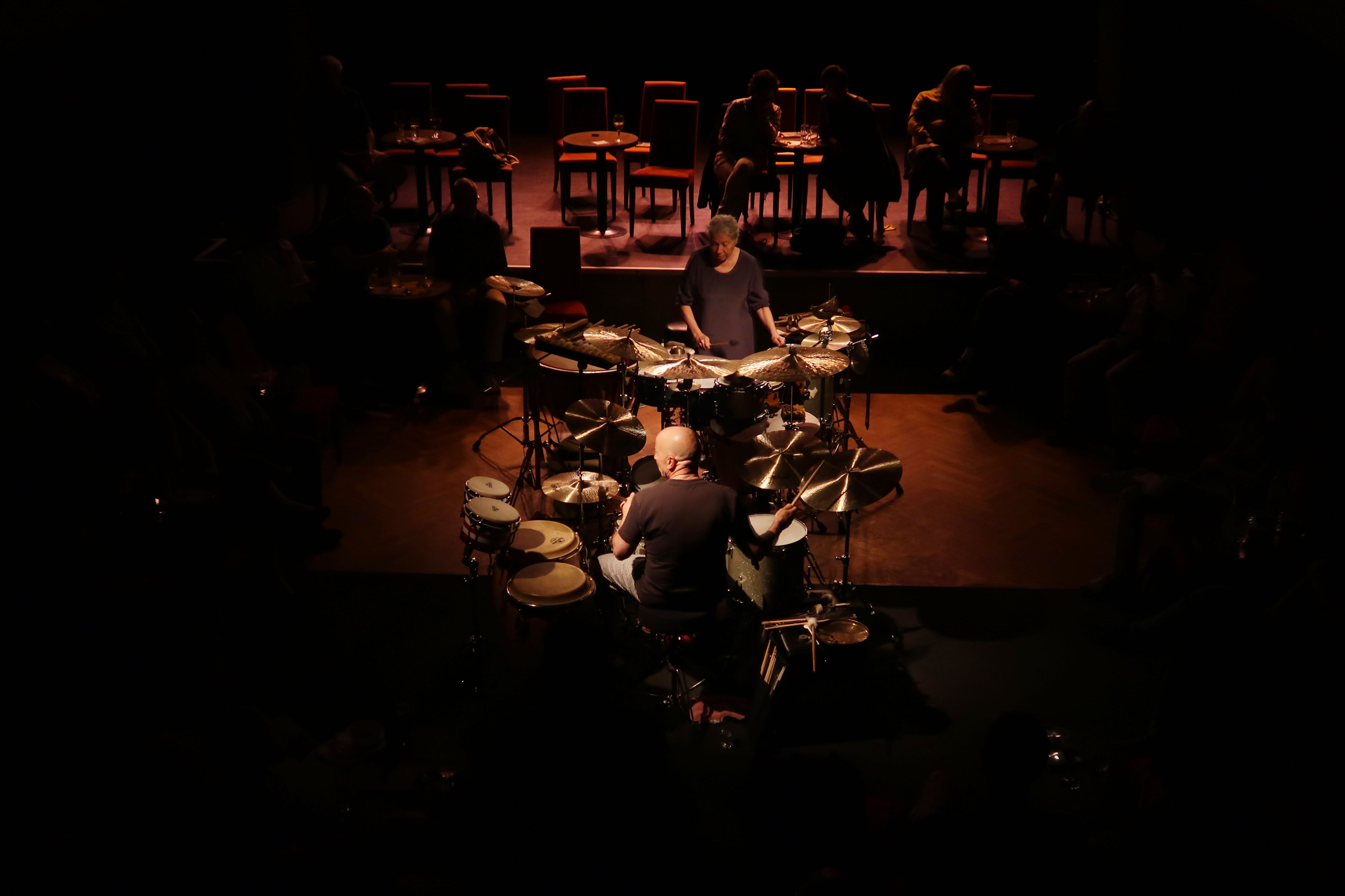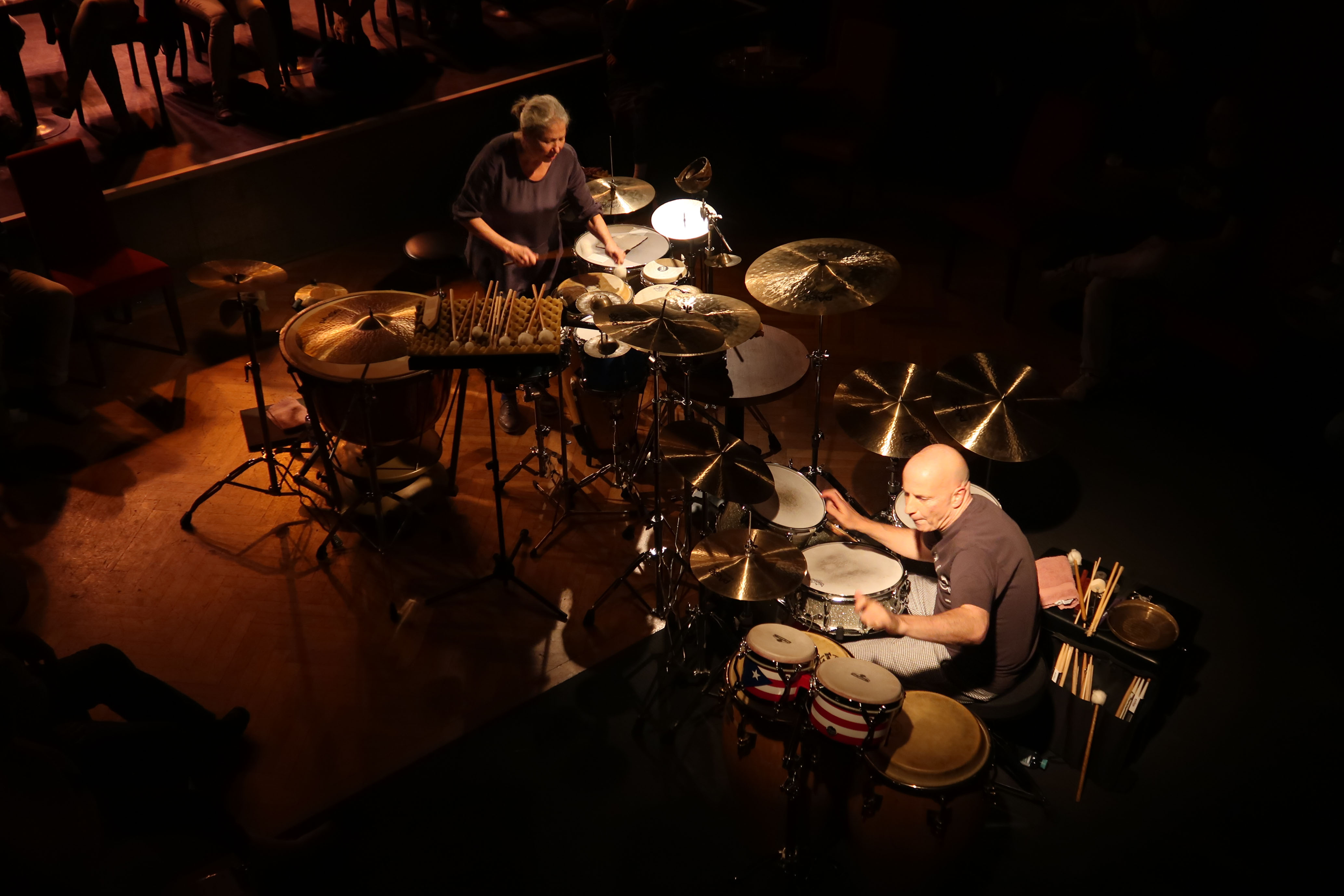 Trommeln und Rhythmen haben eine tiefe, archaische Geschichte. Sie prägten die Ursuppe der Menschheit von Anfang an. Trommeln und Rhythmen sind in den Musiken aller Kulturen von bestimmender Bedeutung. In unterschiedlicher Wertigkeit. Wobei die hochentwickelte Trommelmusik Afrikas für die musikalischen Entwicklungen des 20. Jhdts besonders maßgeblich war. Rhythmen sind unleugbar „Nahrung“ unserer Empfindungs-, Äußerungs-, Beziehungsformen. Für das musikalische wie zwischenmenschliche Zusammenspiel. Sie sind Ausdruck einer kollektiven Lebenshaltung. Zwei besonders herausragende Exponenten der Instrumentengattung Schlagzeug/Schlagwerk/Perkussion, die mit eben diesen Gerätschaften in diesem Bewusstsein fassettenreiche Musik schaffen können, sind jene die diese Klangflüchtigkeiten an besagtem Abend rundum perkussiv im Raum verteilten. Saßen sie doch mitten im Zuschauerraum. Unverstärkt brachten Schulkowsky und Baron die speziellen Eigenschaften jedes einzelnen Instrumentes zu Gehör. Gefördert durch die besondere Konzentration der Hörerschaft und die ausgezeichnete Akustik des Raumes. Musikalisch besitzen Schulkowsky und Baron verschiedenen Geschichten. Ihr musikalischer Werdegang gründet in der Klassik/Neuen Musik - sie hat einen Ruf als herausragende Interpretin und Förderin zeitgenössischer Schlagwerk-Musik - ehe ihr Jazz immer mehr zu bedeuten begann. Er zählt zu den begnadeten Jazztrommlern heutzutage, mit breitgefächertem Ausdrucksvermöge, der Mainstreamprizipien mit Avantgardeansatz nahtlos zu verbinden weiß. Seit längerem betreiben und vervollkommnen beide ihr Trommelkonversation unter dem Titel „Now You Hear Me“. Und wie Schulkowsky und Baron aufeinander hörten. Akribisch hatten sie ihr Instrumentarium, die Trommeln, das Blech, die Small Instruments aufeinander abgestimmt. Ein melodischer Zugang stand in ihren Dialogen im Fokus. Dorthin bewegten sie sich mit einer Fülle an Ideen. Klangfarbenreiche, von außerordentlichem Gespür für Kreuzrhythmen dominierte „Drum-Songs“ standen am Ende. Überquellend an polyrhythmischer Spannung, die Grund der hellhörigen Interaktion Klimax um Klimax schuf. Beider Backgrounds umschlangen sich dabei homogen, selbstverständlich. Wenn Baron u.a. emanzipiertes Timekeeping, wie es Max Roach begründete, auspackte und Schulkowsky ihren melodischen Feinsinn in ständig mutierenden Schlagmustern, von der europäischen Kunstmusik-Tradition gespeist, darüber schichtete. Periodisches Zeitmaß und elastisches Generieren des Beats, von asymmetrischen Akzentuierungen umspielt bzw. fallweise aufgehoben, waren stets strukturierende Elemente. Ins Spiel kam weiters noch eine besondere Kombination von Fähigkeiten auf die die beiden „Sonderstellungstrommler“ in jedem Moment zugreifen können: eine außergewöhnliche Aufmerksamkeit den Details von Klängen & Rhythmen gegenüber und eine hingebungsvolle spielerische Intelligenz. Ein arbeiten mit Sparsamkeit und Ziselierung an der Ereignisdichte. Gekrönt von individueller Anschlagkultur und gekleidet in eine Allklang-Weltanschauung. Allem Anschein nach auf Basis freier Improvisation. Nochmals Max Roach. Gerne wird er mit der Aussage zitiert: „Mit dem Rhythmus tun, was Bach mit der Melodie gemacht hat.“ Würde gleichfalls als Credo von Schulkovsky und Baron zutreffen. We heard amazing Beats - Musiker und Publikum gingen emotional ineinander auf.