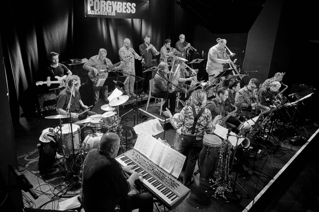 Vermessen anhand kniffligen kontrapunktischen Wetteiferns der Bläsersections, scharfer Dissonanzen, chromatischen Ausschweifungen, polytonalen Überlagerungen, kunstvollen Strukturverflechtungen. Die Tonalität bleibt dabei der definierte Aktionsradius. Von essentieller Stimulans für die cech-/mühlbachersche Klangwelt ist und bleibt eine komplex geschichtete Motorik. Die sich polyrhythmisch austobt, sich permanent erstaunlich wendet. Ein ungeheurer Drive pulsiert dahinter. Haftbar dafür ist der „Maschinist“ des Kollektivs, Lukas Knöfler. Einer der besten Big Band-Schlagzeuger hierzulande. Off-Beat-Kunststücke purzeln der Reihe nach herab. Mühlbacher ist gerne mit rockaffinen Rhythmus/Metrik-Parametern zugange, bevorzugt eine Klangblöcke-Architektur, Cech hingegen organisiert mit durchlässigen Gewebeüberlagerungen im Verbund mit luftigerer Groovness. Alles ausschließlich in time. Aber, entscheidender Richtwert sind unbestritten die individuellen Gaben der Musiker. Diese klischeefrei herauszufordern, ist eine dieser speziellen Fähigkeiten der beiden Kapellmeister. Freiraum eröffnet einmal ein balladesker Aggregatzustand, andermals ein up-tempo Umfeld. Die Improvisationen bleiben gleichfalls melodierhythmisch und funktionsharmonisch konventionell. Trotzdem lässt es der mit behänder Präzision agierende Klangkörper, eine zusätzliche Portion Nonchalance wäre schon reizvoll gewesen, nicht an Eigenart fehlen. Und ein Haufen meisterlicher Solisten sind sie auch. Vieles war dennoch Gold was glänzte.
