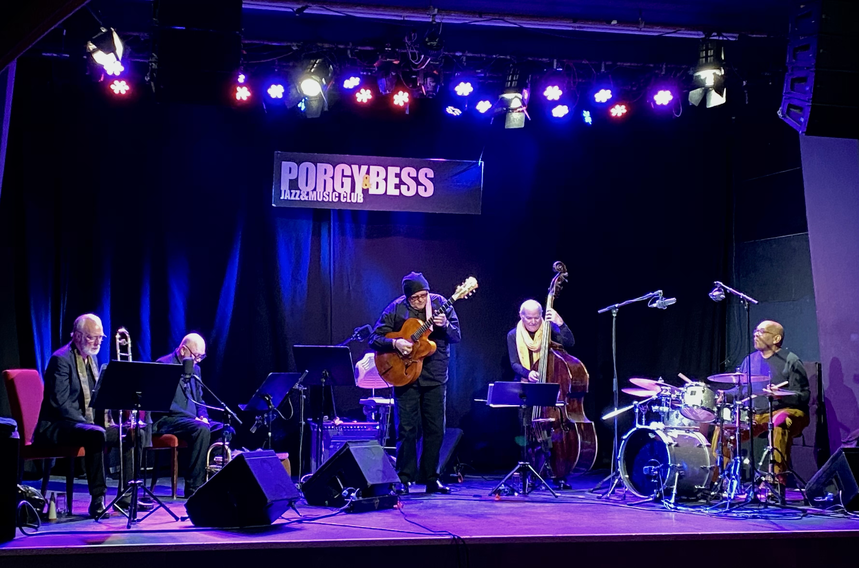 Diesmal trug sich wiederum nicht nur ein Jahreswechsel zu, sondern auch einer des Jahrzehnts. Obligatorisch, mit Klängen aus der Welt des Jazz eingefasst, verantwortete „Sir Karl“ mit seinem „Fünf Sterne Quintett“ sowohl den Kehraus des alten Jahres wie eben auch das Einpeitschen des neuen Jahres an Wiens erster Jazzclubadresse. Rückblickend betrachtet ist man allseits froh, das pandemische „Stop and Go“-Jahr 2020 hinter sich gelassen zu haben. Speziell im letzten Jahresdrittel häuften sich ja in fast erschreckender Weise erratische gesellschafts-politischen Entscheidungen der Regierungsverantwortlichen, speziell auch das Kulturleben betreffend. Jedoch auch für das neue Jahr kündigt sich nicht an, dass hinkünftige demokratiepolitische Weichenstellungen, wie es aber eine derart prekäre Weltlage erfordern würde, holistisch gesehen werden. Das tun fraglos mit hellwachem Geiste Karl Ratzer and his Men auf den Modern Jazz-Kosmos bezogen. Ein ordentlicher Knall gleich zu Beginn: eine harmonisch und melodisch flanierende Version von Sam Rivers´ „Beatrice“. Dessen rhythmische Eleganz von Curtis veredelt wurde. Dem verspielten Thema folgten die Grundharmonik variierende, neu interpolierende Soli von Ratzer, Neumeister und Peter Herbert. Gespickt mit Graduierungen, die die Spuren für den restlichen Abend legten. Akkordstützen wurden geschmacksicher durcheinander gewirbelt. Changes auf tonale Abenteuer geschickt. Ratzer legte all sein Herz diesmal in ausgedehnten Improvisationen offen und faszinierte mit seiner Gabe die harmonische, melodische Grundsubstanz der Themen durch Umkehrungen, Alterationen einer weiterführenden Inhaltlichkeit zuzuführen, aufs Neue. Und er überraschte das eine oder andere Mal mit entkoppelten Klangsplitterkonzentraten a la Derek Bailey. Deutlich zu Tage trat diesmal auch, dass der Gitarrist sein Soul/Rock-Faible im Köfferchen ließ und zur Gänze seine Jazzseele auspackte. Demzufolge glänzte die Stückauswahl mit anspruchsvollen Tunes von dem bereits erwähnten Sam Rivers, Joe Chambers, Mal Waldron bis Larry Young und Eigenwerken aus Koglmanns und Ratzers Fundus. Die konzeptionelle Primärausrichtung der Musik verhandelte zwar tradierte Ordnungsprinzipien (einzig Koglmann Third Stream-affine Komposition für Trio – Flügelhorn, Gitarre, Bass- gründete auf komplex verzweigten vertikalen/horizontalen Texturen), sprich Thema und Improvisation bilden ein untrennbares Begriffspaar, doch ihre Meisterlichkeit ermöglicht es den Musikern in den Extempores aus einem Neo-Bop Destillat heraus, teils mit melodisch riffartigen Motivbildungen, reichhaltig modalen Wagnissen zu huldigen. Es entstand ein musikalischer Organismus in dem sich Fixiertes und Unbestimmtes – sowohl widerspruchsreich als auch angeglichen – schöpferisch durchmischte. Ed Neumeister brillierte als einer der relevantesten, heutigen Posaunenstilisten, speziell seine Verwendung des Plungers ist einmalig, Peter Herbert mit einem Ton für die Ewigkeit, vollbrachte einen alle musikalischen Parameter zusammenfassenden Exploit. Timekeeping feinster Nuancierung, dabei Gleichförmigkeit und Monotonie außer Kraft setzend, aber auch melodieverständige, schlagtechnisch bravouröse Alleingänge gleiteten Curtis aus Händen und Füßen. Zudem jene fantastische rhythmische Einheit mit Herbert. Lediglich Franz Koglmann gab sich etwas zurückhaltender in seinen Soli. Er verknappte lieber seinen Fokus, ließ aber erkennen, dass er nun deutlicher jazzoptional dem „Into The Hot“ zuneigt. Unter die Haut ging das gemeinsam mit Ratzer praktizierte rubato-philosophieren über „My Funny Valentine“. „Das Leben entsteht jeden Moment neu und frisch: so soll es auch in der Musik sein.“, gab einmal der große Schlagzeuger Milford Graves zu Protokoll. Karl Ratzer wünschte sich: „Let´s Save Our Country From Tristesse“. Conclusio aktuell: freispielen statt freitesten.