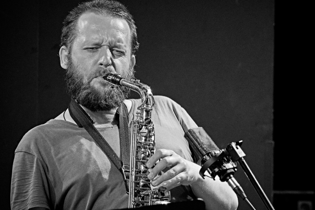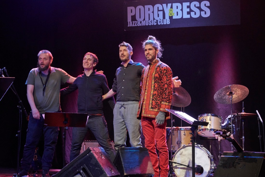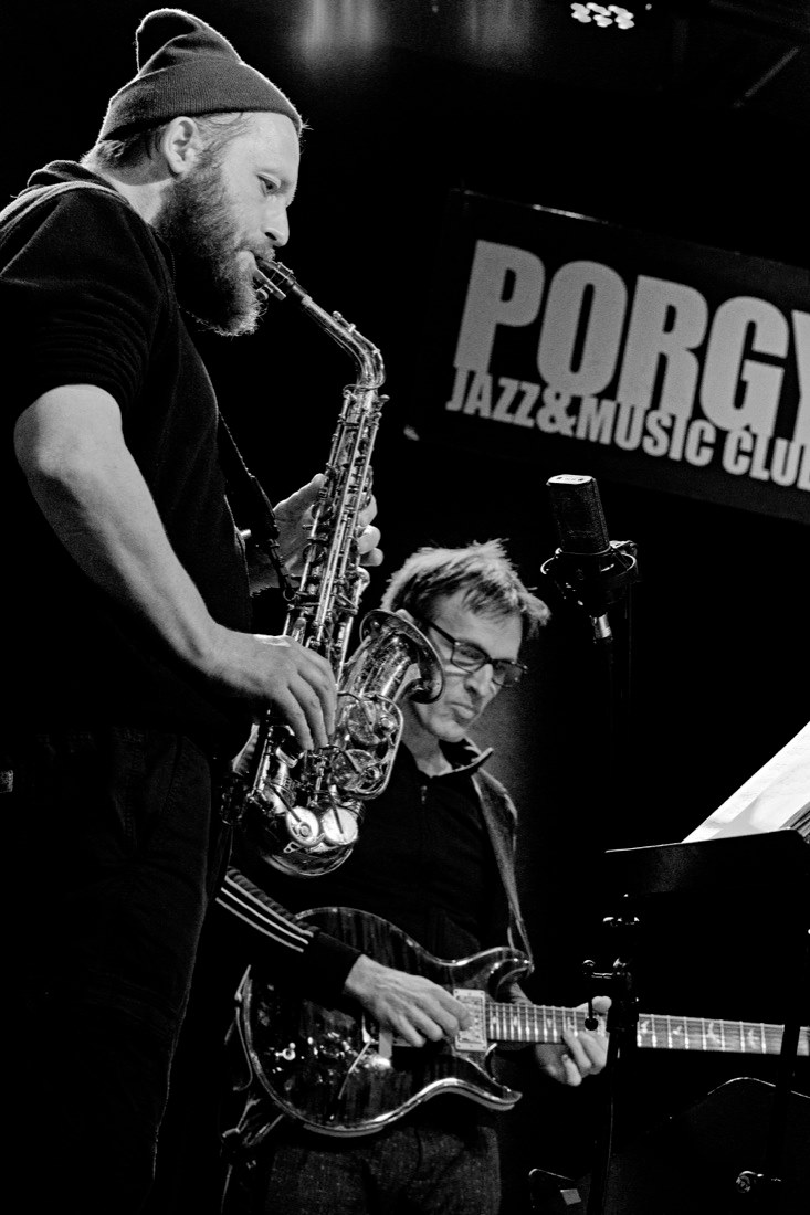 Eine der Bands aus den Anfängen die eine gehörige Portion Neugewürz in die Suppe streute, war das Quartett FuzzNoir, das nun nach 14 Jahren den gemeinsamen Faden wieder aufnahm. Mit dabei Wolfgang Schiftner, damaliger Aufsehen erregender neuer Altsaxophon-Stilist, der sich im Zuge einer musikalischen Auszeit, die jetzt beendet scheint, dem Sufismus zuwandte und nun den Vornamen Ahmad trägt. Und nach wie vor ein stupender Spieler ist. Seine Mitstreiter sind mittlerweile zentrale Persönlichkeiten des Jazzgeschehens vor Ort mit paneuropäischem Wirkungskreis. Sofort ging´s ans ordentlich „Krachenlassen“ wie dereinst. Ausgehend von einer massigen Basslinie, die sich in die Magengrube rockte. Von Preuschl unentwegt, teils rudimentär, teils ausfüllend, melodisch/harmonisch variiert, transformiert. In seinem Spiel durchwirkt sich Gitarrentechnik, in perfektem Arpeggio-Spiel ausformuliert, mit instrumentadäquater Phrasierung. Ergänzt um die rhythmische Kongruenz mit Schlagzeuger Prowaznik. Dessen elastischer funky Punsch im Wechsel mit raffinierten Fill-Ins und Fill-Outs der Musik eine polyrhythmische/ -metrische Diversität einbrennt. Periodizität verläuft zerdehnt oder kurzgefasst. Das sorgte immer wieder für spannungsgesättigte Wendungen. Die polyphone Bewegtheit multiplizierten Schiftner und Rom mit ihren schwergewichtigen Improvisationen. Schifter ist der melodiöse Genius geblieben, der mit lichter Klarheit Klangbänder umsetzt. Sein Ton schneidet den Äther in kleine Stücke. Das hatte ungehemmte Direktheit aber ebenso balladeske Evidenz. Sowohl in horizontalen wie vertikalen Verlaufsformen erspielt Gitarrist Rom raumgreifende Gegebenheiten, die Transparenz des linearen Bauplans der Musik zusätzlich weitend. Filigrane Schwellklänge, klirrende Funk-Akkorde, vertrackte Cluster oder Einzelton-Sustains spielen hierbei eine beträchtliche Rolle. Klangästhetisch wechselt der Gitarrist zwischen „jazz-dry“ und „rock-rotzig“ – nahtlos. Dem musikalischen Breitbandverständnis der Protagonisten entsprechend, schimmern verschiedenste Stileinflüsse durch den primären Jazz-Korpus der Stücke. Alles Originale. Von der Rockmuskulatur, als prägendste „Nährstoffergänzung“ bis zu beispielsweise afrikanischem Highlife. Korrespondierende Improvisationskunst auf höchstem Level mit großem Ohrenmerk auf dem Kollektivklang. Dahinter steckt ausgiebiger Spieldrang und stürmische Vitalität. Musik wie eine Tauschicht, frisch und fliehend. Sie besteht bravourös den Test der Zeit. Wrroooom Zack, das hat gesessen. Bitte dranbleiben.