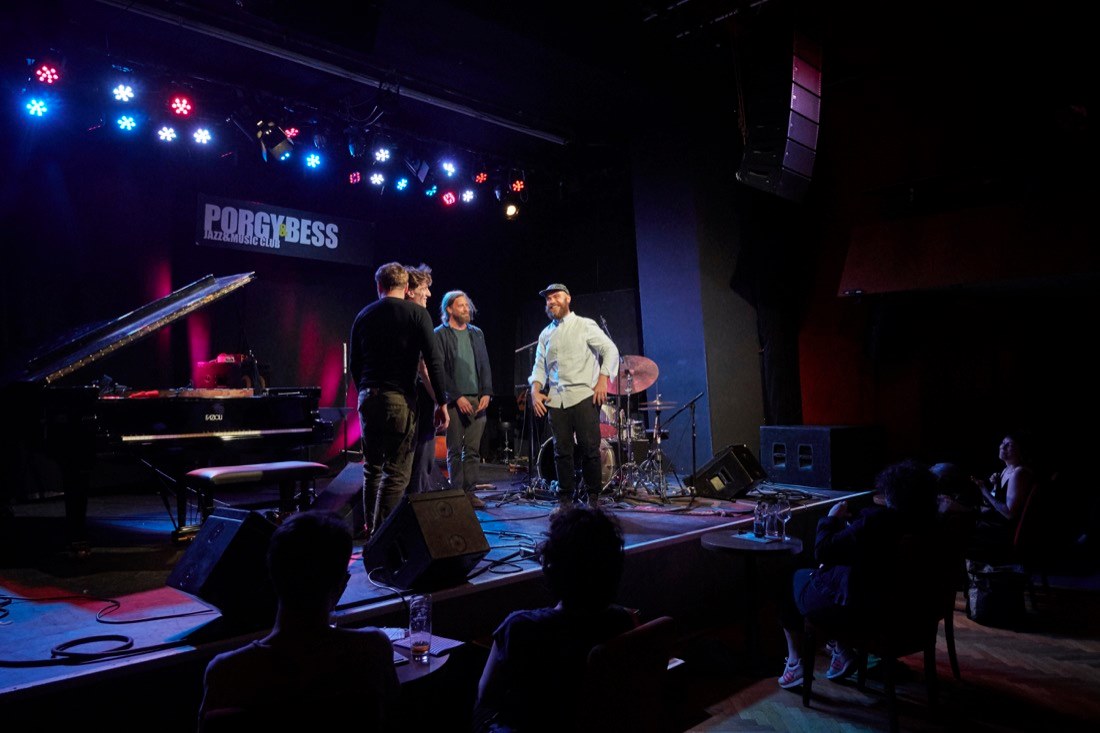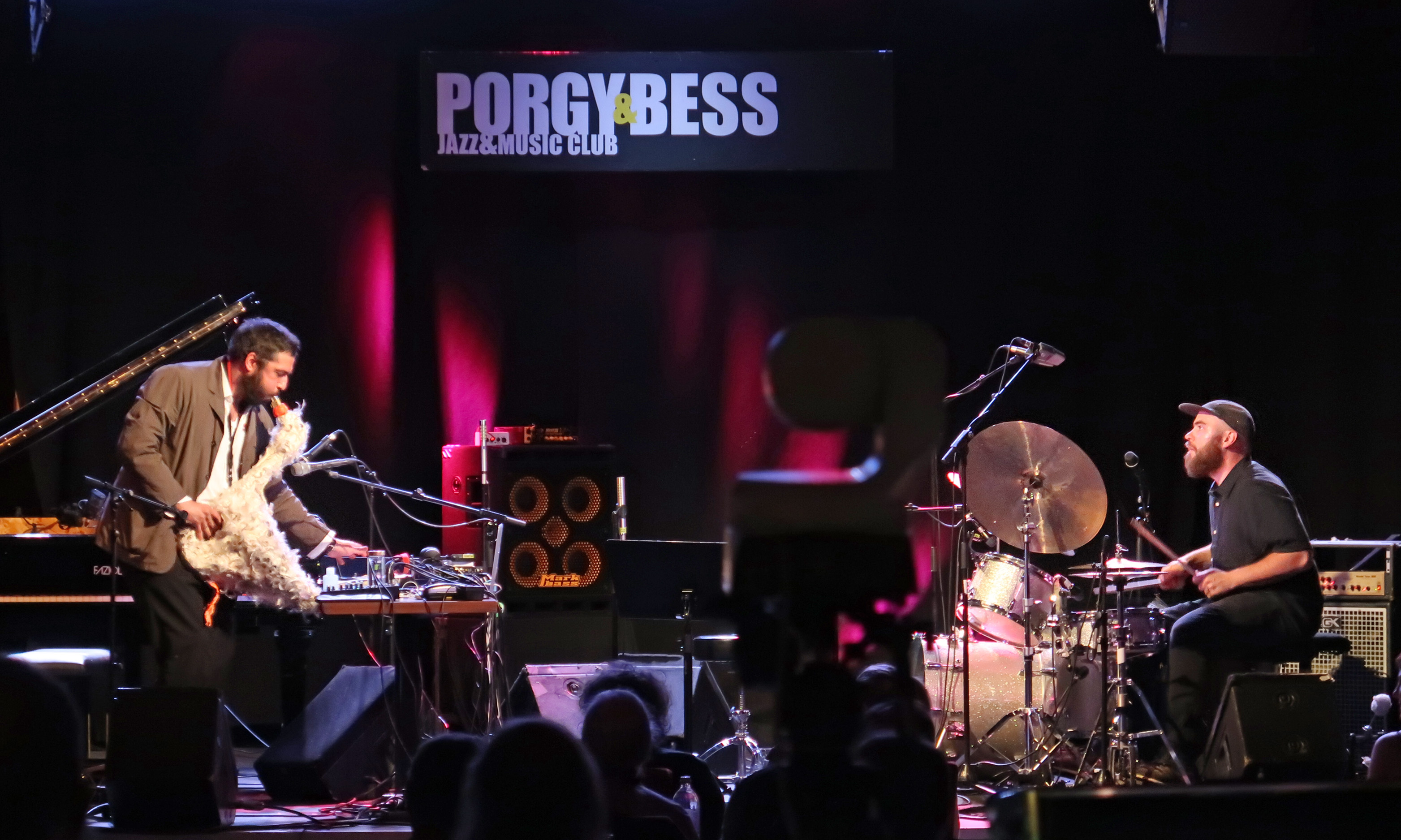 Der zweite Akt stellte eine spektakuläre „Sidestream“-Szeneband mit ihrer multispektralen Musik in den Mittelpunkt. Eine, die relevantest und eigensinnigst Clubmusik, Rockmentalitäten mit ihrem Jazz-Philosophikum konglomeratisieren. Auch diesmal wieder nicht am Netz. Von ein paar Effekten, als Klangfarbenextras, auf dem Blech abgesehen. Als akustische Deutung wurde wiederum ihr Konzept offeriert. So rückte die lyrische Fassette der Musik, von einem sinnierenden Piano-Intro von Omerzell ausgehend, deutlicher in den Fokus. Verhallte Schwaden, Geräuschpuzzles der Trompete mischten sich ein. Vom Bass kamen zwei, drei Grundierungstöne und der Schlagzeug-König bespritzte ad lib von seiner Farbpalette. Ein wunderbarer Gleitflug der sodann abhob, aber in einer unüberhörbar robusten Feinstofflichkeit verweilte. Interaktionistisch auf höchstem Einverständnisniveau. Der Bandsound war unverkennbar und die typischen Strukturmerkmale, jetzt eben abgespeckt, gegenwärtig hörbar. Repetitive Muster, präsente Riffs, suggestive Hooklines, magnetische Grooves in vertrackten Schlagfigurenschichtungen. Hierbei ist der kollektive Entstehungsprozess von vorrangigem Belang. Wie hinlänglich bekannt improvisatorisch firm die Musiker sowohl bei dieser Gelegenheit als auch bei Solospots sind, ließen sie an etlichen Stellen unaufgeregt aufblitzen. In solcher akustischen Kleidung entringt sich dem klanglich Losgelassenen die Fassette filigranerer poetischer Kraft. Keineswegs sentimental, sondern abyssisch. Nicht zuletzt durch das entgrenzte harmonische, melodische Ansinnen, innerhalb einer tonalen Konfiguration, gegeben. An den abstrahierten Break Beats, Hip Hop/Drum ´n´ Bass-Grooves, die König mit jazzspezifisch metrisch entriegelter, rhythmisch bereicherter bzw. tempovariabler Auffassung aufmischte, in einer Sequenz mit atemberaub verzwickten Unisono-Stops vernetzt, konnte man sich unentwegt delektieren. Ein unerlässlicher Dünger für den üppigen österreichischen Jazzwuchs ist die Band nach wie vor. Gerufen war diesmal speziell Herz König.