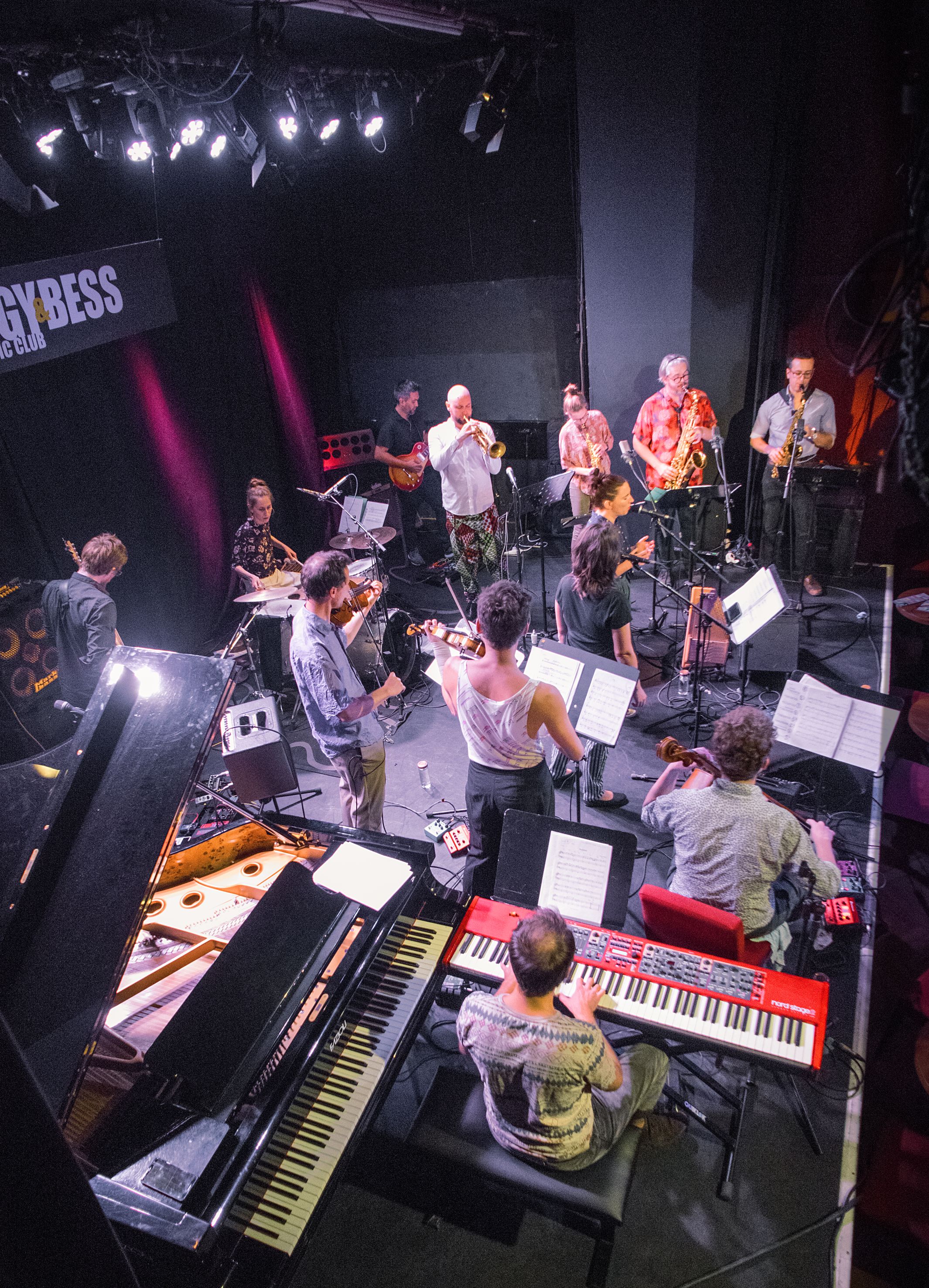 Wer ist denn nun „Little Rosie“? Wir wissen es nicht? Müssen wir es wissen? Tatsache ist, dass sich ein kreativbeflügelter, kunterbunter Haufen österreichischer, vorrangig mit dem Jazz auf du und du befindender MusikerInnen,  mit dem Zusatz „Kindergarten“,  unter diesem Namen zusammengefunden hat. Sie sind zudem die Stageband der Porgy & Bess-Saison 2021/22. Unter den Titel „Explorations“ haben die „KindergärtnerInnen“ ihre Erkundungen gestellt. Konzertabend Nr. 1 lautete: „Introducing“. Sprühender Initiativdrang, losgelassene, musikalische Energie ging vom ersten Moment an durch die Reihen der „KlangforscherInnen“. Was forschen sie genau? Sie forschen mit einer bereitwilligen Offenherzigkeit in alle erdenklichen musikalischen Richtungen. In besagte Jazzsphären, abstrakte Strukturen komponierter Avantgarde, rockig funkige Erdungen oder folk-rockige Liedkünste. Ein wuchtiger Ensemblecluster forderte stante pede alle Aufmerksamkeit. Dem folgten feinstoffliche Verflechtungen flirrender Streichinstrumente und satter Saxophone. Entsprechender rhythmischer Druck kam von der stupenden Schlagzeugerin/Perkussionistin der Band: Judith Schwarz. Eine der auffallendsten, heutigen Persönlichkeiten an dem Fell/Metall-Instrumentarium und überragende MusikerIn des Abends, ohne die anderen klein reden zu wollen. Klar ist, „Little Rosies“ bestehen unüberhörbar nur als Kollektiv. Aber Judith Schwarz ließ mit derartigem Impetus die leichten und schweren Taktteile tanzen, hielt sie unentwegt am Brodeln, wirbelte Kreuz- und Komplementärrhythmen so behände durcheinander, platzierte den Beat, mit findigen Akzentuierungsmustern umspielt, immer an entscheidender Stelle, das es die gemeinsamen „Spielereien“ ganz besonders überstrahlte. Außerordentliche Sensibilität und beeindruckende emotionale Kraft gewichtete außerdem jeden ihrer Schläge. Schwarz´ Spiel war der motorische Stachel in den Kompositionen. Diesbezügliche Ideen entsprangen allesamt Little Rosies „Brüdern und Schwestern“. Besondere Ansprache bewirkten speziell jene Stücke von Lisa Hofmaninger und Werner Zangerle. Konzipiert die Saxophonistin prägnante, soulige Grooves im Wechselspiel mit metrischen Auflösungen, „Taktlosigkeiten“, geräuschhaften Zellen und abrupten Schnitten, legt Zangerle seine Werke als harmonisch breite Aggregatzustände mit gelegentlichen aufwühlenden, kleinteiligen Klanggesten an und erzielte eine gewisse hymnische Epik, welche dann doch in dem einen oder anderen Moment zu zähflüssig geriet. Diesem Umstand kam aber irgendwann wieder die kollektive Aufgewecktheit in die Quere. Große Meisterschaft der KomponistInnen zeigte sich zudem in der organischen Verwobenheit des vorgefertigten Materials mit dem Freiraum für improvisatorische Entäußerungen. Brillant waren die beiden Vokalistinnen Anderluh und Widauer mit intuitiven Koloraturen vertrackter Melodielinien, der aus einer satten Klangwolke hervorbrechende Geigenexkurs von Sighartner, Helmut Mühlbacher, der in dralligem Rockidiom dahin stob,