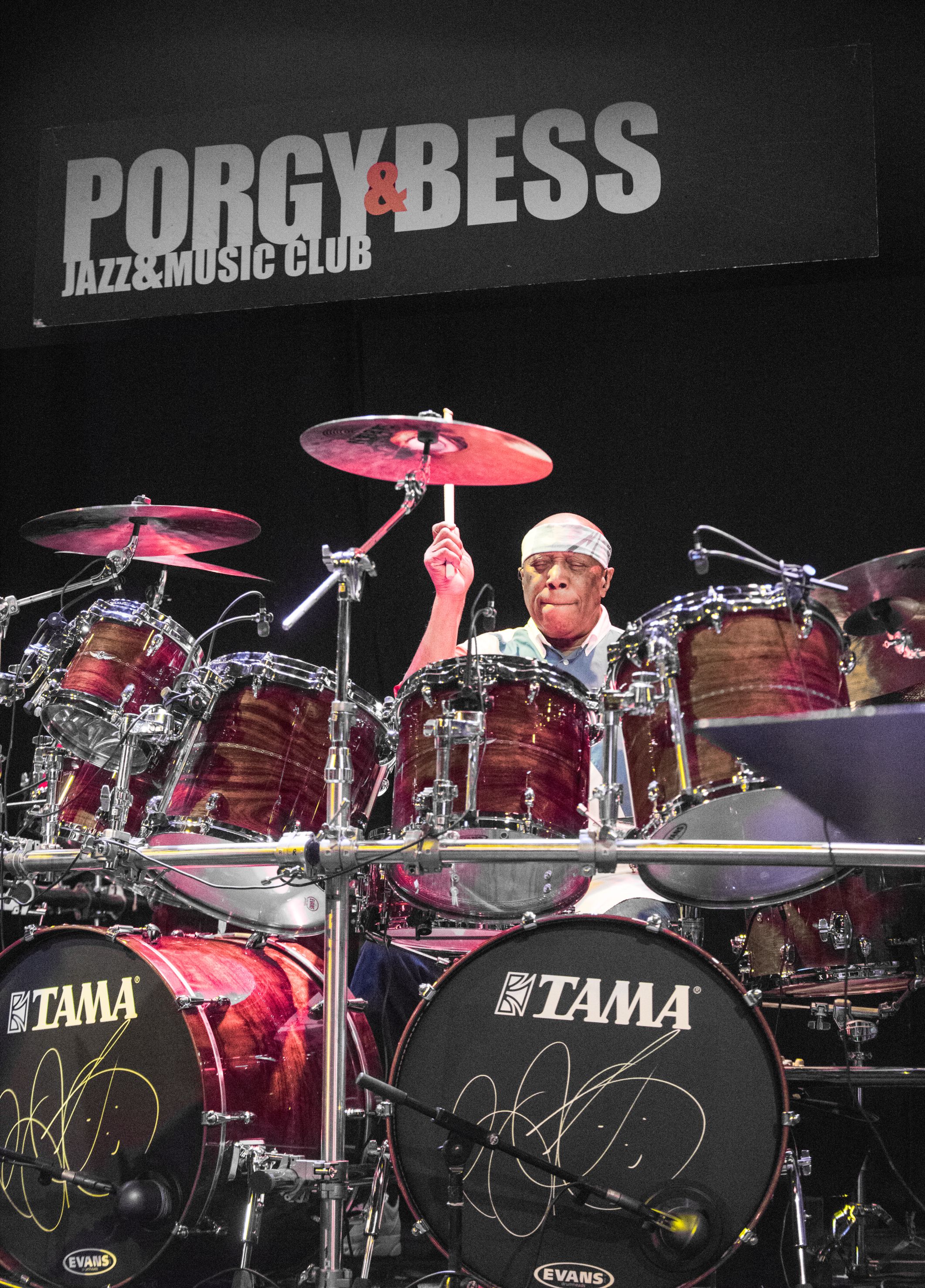 Die Instrumentierung die Cobham für sein aktuelles Projekt wählte, galt dereinst als die klassische Besetzung des Genres Jazzrock. Und Cobham hat diesem Idiom, wie hinlänglich bekannt, als Schlagzeuger in wegweisendsten Projekten neue Sphären ertrommelt. Hingewiesen muss jedoch erneut einmal wieder auf seine viel zu wenig beachteten originellen Beiträge als Komponist in diesem Umfeld. Gemeint ist nicht so sehr seine unsterbliche „Kennmelodie“ „Stratus“ als vielmehr ausgedehnte Werke a la „Spanish Moss“ oder „Solarization“, in bläsererweiterten Besetzungen, mit ihren vielschichtigen Arrangements. Harmonische Ausreizungen verschmelzen hier mit rhythmischen Druckwellen. Zurück zum heute. Der Jazzrock wie Cobham in die Jahre gekommen, verlautbarte sich durchs kontinuierliche drehen Cobhams an dessen strukturellen Stellschrauben und eines beträchtlichen Spontaneitätgehalts, als erstaunlich abnützungsresistent und frischbezellt. Das Quartett stellte gleich einmal einen markigen mit jazzrockigen Finessen gespickten Opener auf die Bühne. Lustvolle Lockerheit und Spiellaune waren kurzum unüberhörbar. Dazu absolute Tempokontrolle, Interaktion extraordinaire, geballte Energieausstöße, Improvisationen die die Jazzrock- Funktionalismen zwar im Hinterkopf haben, dennoch hie und da genüsslich perspektiveverändernde Transversalen einziehen. Der schwedische Gitarrist Ulf Wakenius, übrigens langjähriger Partner von Oscar Peterson, und Bassist Linley Marthe, mit bewegter Vergangenheit mit Joe Zawinul, waren Cobham kongeniale, inspirierte Partner. Lediglich der Keyboarder verhedderte sich zu sehr in altbackenen Stereotypen und war mehr Erfüller denn Erfinder. Was aber letztlich nicht ins Gewicht fiel. Denn die drei Virtuosen auf Augenhöhe lancierten Rotbereich-Intensität und knisternde Dramaturgie. Wakenius, dessen Spiel sich aus straighter Modern Jazz-Mentalität und Jazzrock-Dialekt speist, phrasierte, pendelnd zwischen trocken swingender Sophistication und rückhaltloser Expressivität, eigenwillig originell. Harmonisch mit einer gewissen Extravaganz. Eine besonderer Empathie für den cobhamschen Drive entwickelnd, vernetzte der Bassist mit permanent brodelnden autonomen Melodielinien, rhythmisch kontrapunktierend, den gitarristischen Output mit dem schlagzeugenden. Letzterer bestätigte einen körperlich vitalen, mental beweglichen Cobham. Wahnwitzige Snare Wirbel-, Paradiddle-Zaubereien, halsbrecherische Fills und Akzentuierungsasymmetrien gehen ihm nach wie vor leichtest von Hand und Fuß. Implantiert in ein komplexes System aus Kreuz- und Komplementärrhythmen die ein famoses polyrhythmisches/multimetrisches Gesamtmotorikwerk ergaben. Hinzu kam noch eine wunderbare melodische Nuance durch die ausgeklügelte klangliche Abstimmung des kompletten Drumsets. Darin ist Cobham unerreicht. So erhält auch die Paradenummer „Stratus“ immer neuen Feinschliff. Ganz exzeptionell praktizierte der Drummer seinen melodischen Feinsinn in einem von Seltenheitswert geprägten Solo. Ausschließlich mit den Händen und Fingern beklopfte, betaste er sein Instrumentarium. Man kam aus dem Staunen nicht heraus. Als Nachschlag präsentierten die „fantastischen Vier“ eine abgedrehte Version von Cobhams „Red Baron“. Nochmals trat eine eher selten anzutreffende Fassette dieser musikalischen Ästhetik zu Tage, dass nämlich Subtilität und Kraft, Innerlichkeit und berstende Explosivität sich einander nicht ausschließen müssen. Jazzrock in der Zeit verortet.