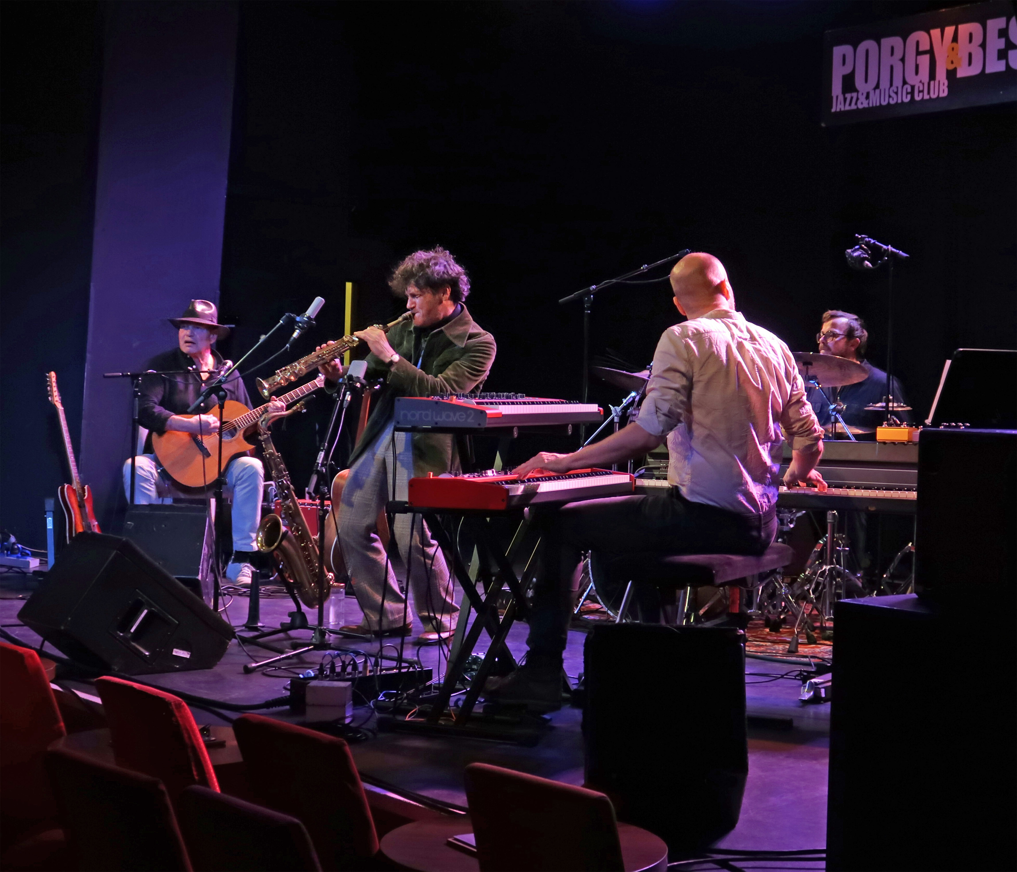 Den Klangfarbenmehrwert, die polyphone Vielschichtigkeit potenzierte, mittels Sequenzierungen oder experimentierfreudiger Auslotung, Philipp Nykrin an den Keyboards. Das verkündet völlig eigenständigen Charakter was er an Klangqualitäten diesen entlockt. Hier wandert er relevant auf den visionären Spuren von Joe Zawinul. Nykrin ersinnt nonkonforme Harmoniearchitektur, einen verbogenen Melos. Intuition ist im dabei unerlässlicher Antrieb. Umfassend denkend verfolgte der Tastenvirtuose kongenial mit Ritter eine harmonische und Pirker eine rhythmische Koinzidenz. Dazwischen improvisatorische Originalität. Elastische Bassfiguren hatte er aus gegebenem Anlass obendrein immer wieder zur Hand. Ritter entrang es weitere energische Ideenblöcke, als prägnante Hooks, Licks eingeworfen oder in wallende Klangstränge gewandet. Mit messerscharfem Ton legte sich das Sopran darüber. Andrej Prozorov intoniert bemerkenswert - und sehr eigen. Themeneinheiten reihte er unterbrochen aneinander. In rhythmisch strukturierender Off-Beat Manier. Extemporierte Ausschweifungen schob der Saxophonist ebenso dann und wann ein. Am Tenor blieb Prozorov unscheinbar. Lediglich kurze, ergänzende Pattern setzte er hinzu. Und wieder schwoll die Interaktion dionysisch an. Lieferte dem Bandsound die einzigartige rittersche Substanz. Kollektiv wurde der musikalische Reigen gestoppt, verzögert, umgelenkt und wieder losgelassen. Spontaneität quoll dabei aus allen Fugen. In gehörigstem Maße bei Ritter und Nykrin. Prozorov setzte die luziden Klangtupfer und Pirker groovte die Band in einen einzigartigen kinetischen Zustand. Nicht einzelne Stücke strukturierten den zusammenhängenden Ereignisbogen, sondern klug gesetzte dynamische Nuancen. Womit wir beim Spezifikum Sound angelangt wären. Karl Ritter ist ein selten begabter Sound Komponist/Konzeptionist. Entschlossen leidenschaftlich strebt, forscht er danach undogmatisch gehandhabte, freigeistig aufgebrochene Rockzentriertheit mit starker Jazzfermentierung unter der Prämisse Improvisation zu einem zwei Seelen, ein Herz-Geschöpf zu verschmelzen. Jazzrock neu hören. Und die Kombo ist ein ziemlicher Idealzustand.