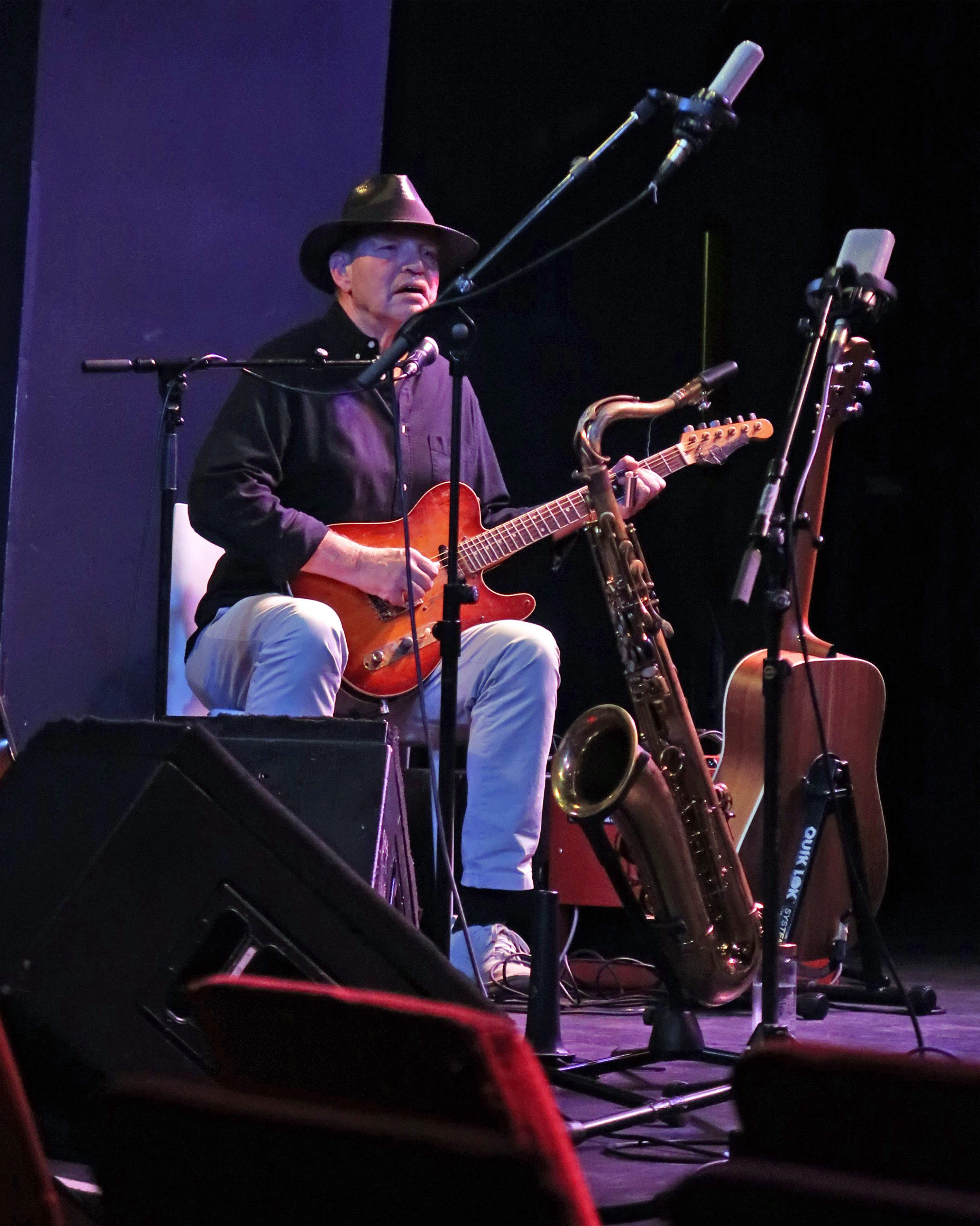 Vor fünfzig Jahren bekam er seine erste Gitarre, seit diesem Tage ist sie ihm kreative Vermittlerin und seit vierzig Jahren bestreitet er mit ihr und all den inzwischen hinzugekommen Geschwistern seinen Lebensunterhalt, verkündete der Gitarren-Krösus eingangs. Und das auf den Bassisten Erich Buchebener krankheitsbedingt verzichtet werden muss. Rohdiamantische Akkordprogressionen - dicht gebündelt - katapultierte Ritter unverzüglich in den Äther, verpackt in harschen Nirosta-Sound. Dessen einnehmende Entfesseltheit einen Energieschub lostrat. Mit geschmeidiger Wucht klinkte sich sodann Herbert Pirker ein. Weitverzweigte rhythmische Verstrebungen fuhren aus. Da flitzten Akzentuierungsasymmetrien, verblüffende rhythmische, metrische Finessen nur so dahin. Komplexe Fills schraubten den Thrill in den roten Bereich. Selbst wenn er four to the floor spielt, kommt das in einer agilen Gestik daher. Ein immenser motorischer Impact.