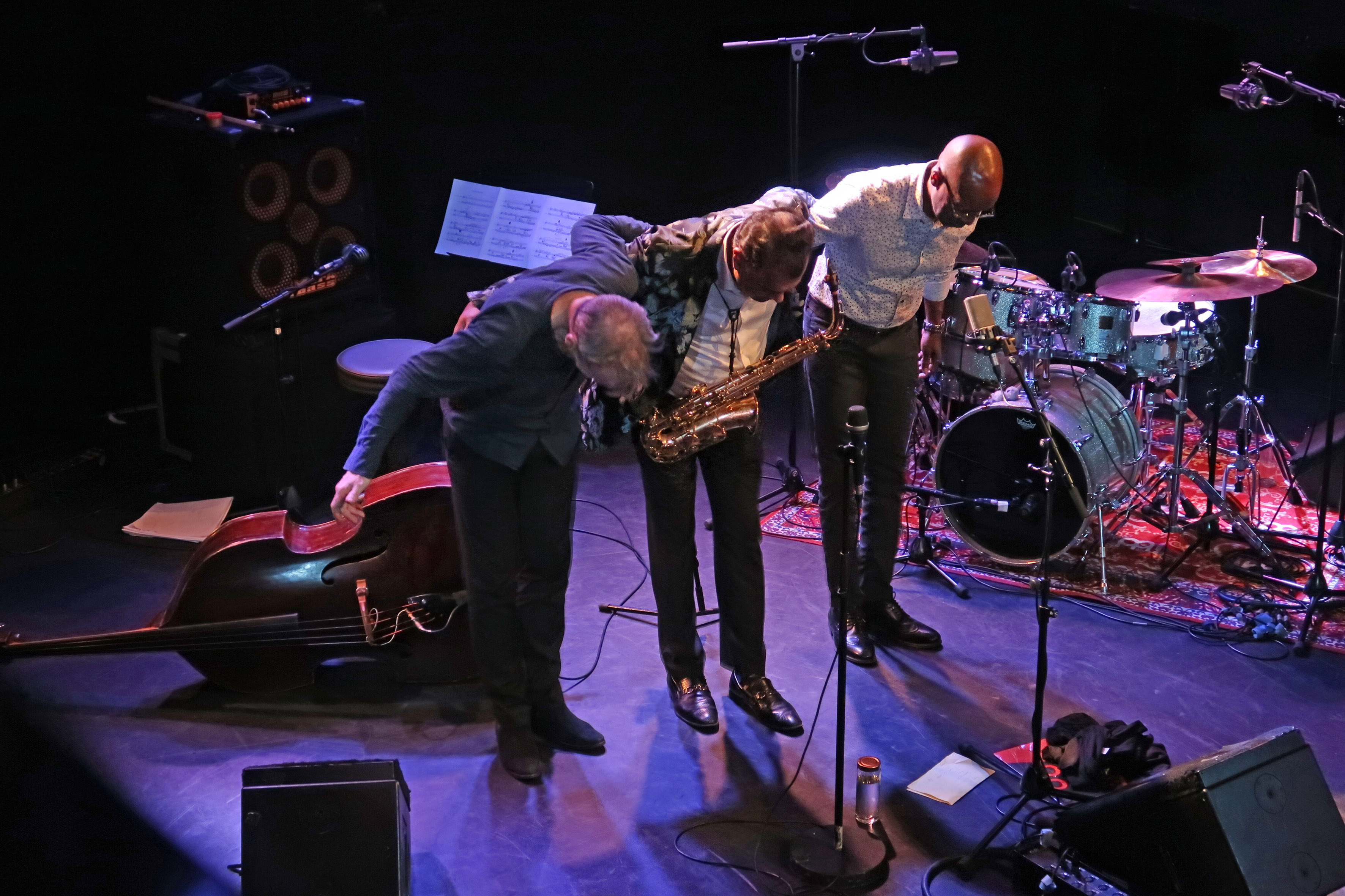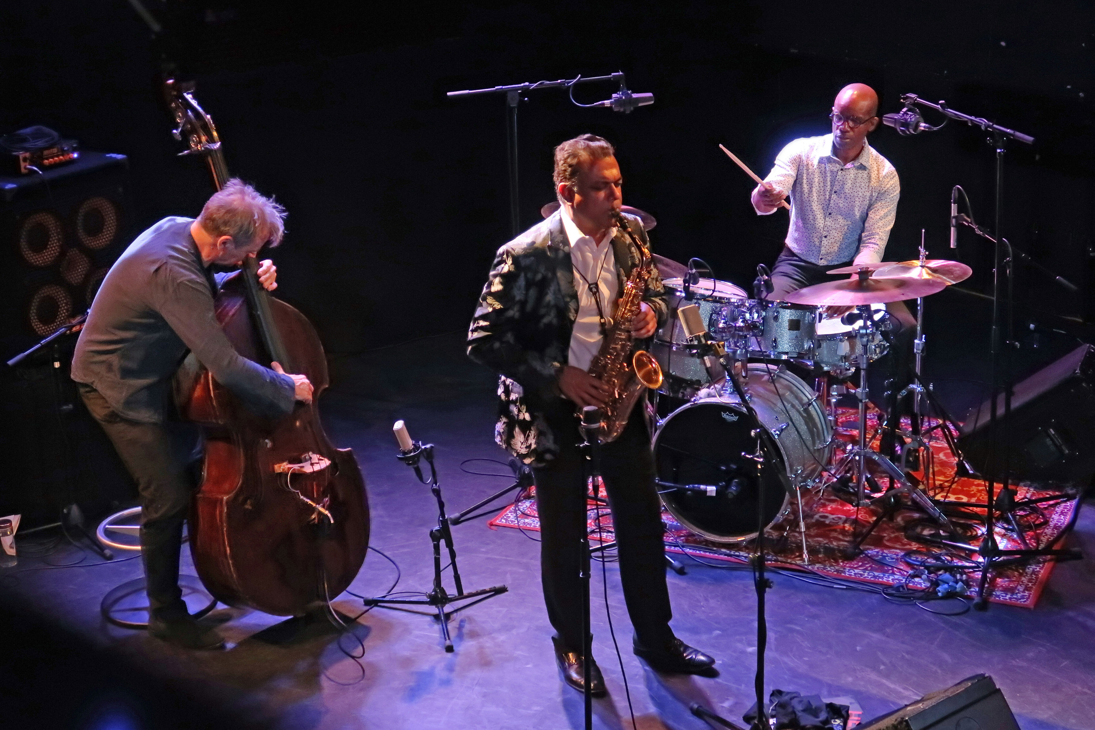 Jene “Helden” aus dem Musik-Universum, auf welche an jenem Abend angespielt wurde, die dieses im 20. Jahrhundert mit stilverschiedenen Großtaten erhellten, bevölkern das Musik-Pantheon. Zu überwiegender Mehrheit stammen diese wegweisenden Persönlichkeiten aus den Weiten des Jazzsystems. Für Rudresh Manhanthappa sind dies vorrangig Charlie Parker, Sonny Rollins, Ornette Coleman, Keith Jarrett, Pat Metheny. Dezidiert die Trio Musik- Konzepte von Rollins und Coleman nehmen eine Rolle hochgradiger Inspiration für sein Terzett-Format ein. Andererseits hat der Saxophonist seine offenen Ohren an der Musik so unterschiedlicher „Tonmeister“ wie Stevie Wonder, George Michael oder Jonny Cash. Für die grundlegende, dem Eigensinn überzeugend verhaftete, neuinterpretative Aufzäumung seiner „Heldenstücke“ wählte Mahanthappa strukturelle Bebop Standards. Sprich Sechszehntel-Phrasierungsweise, rhythmische Rasanz, Raffinement in Harmonik und Melodik, spannungselaborierende Wechselwirkung zwischen vertikalen und horizontalen Entwicklungen. Doch er und seine Partner ließen es damit nicht auf sich bewenden. Katalysatorisch wirken zudem die von Steve Coleman etablierten, von einem Funk/Rock-Approach durchwirkten verschachtelten Motivketten und deren markante Rhythmusmuskulatur. Eine unterschwellig pulsierende Bluesader und bis zu einem gewissen Grad auch die auf Mahanthappas indischen Wurzel zurückzuführenden Funktionsweisen klassischer indischer Musik, oftmals Ausdruck findend in tricky, schwindelerregend schnell gespielten Unisonofiguren, die auf den Abschnitt Gat des Ragas verweisen. Betreffend des Nexus erwähnter Parameter, ist besagter Eigensinn der drei Musiker nochmals zu betonen. Neubelebungen erfuhren alsdann Stücke wie u.a. Charlie Parkers „Red Cross“, Keith Jarretts „Wind Up“, Pat Methenys „Bright Size Life“, Jonny Cashs “Ring Of Fire”, George Michaels “Faith”. Vom Saxophon wurden die Themen teilweise erkennbar ausgespielt, teilweise lediglich seziert, in neue harmonische Situationen transferiert. Improvisatorisch erfuhren die Funktionalismen weitreichende Revitalisierungen oder bezugnehmende Umdeutungen. Beeindruckend erhoben dabei die Musiker Stimme, manifestierend wie Virtuosität als Trägermedium musikalischer Substanz funktioniert. Manhanthappa verwendet haufenweise atypische Alterationen, signiert sie mit scharf skizziertem Ton. Sein Spiel ist die persönliche Vergärung von Parkerismen und Stilqualitäten eines Dolphy bzw. Jackie McLean. Flinke melodisch-harmonische Signets von Bassist Moutin bekräftigten ihr kreatives Zutun. Gemeinsam finden sie sich im Taumel linear-kontrapunktischer Stimmverläufe. Hinzu tritt die rhythmische Gischt. Es folgte ein motorisches Beben. Royston langt und tritt zu. Feinfühlig dosiert. Im Formverstehen eines unübertrefflichen, von Wendigkeit und tänzelnder Wucht angetriebenen Akzentkonzeptes. Der Dynamik spricht er jegliche Schattierung zu. Die Time hielt der Schlagzeuger immer auf Engführung. Bei Royston heißt das aber zusätzlich extreme Dehnbarkeit auf dem Fundament enormer Körperlichkeit. Überragend. Es war ein ständiges Sich-Vorwagen des Trios, angespornt vom Bestreben des freien Auslotens der Tonalität. Begründet auf modaler Vermessung der Musik. Da trieben die Musiker ihre rhythmischen, melodischen Progressionen über Taktstriche respektive 12 oder 32-taktige Songschemata hinweg. Dann die stupenden Gestiken eines jeden mit Off-Beats. Abenteuerlichste polyrhythmische Verwebungen brachen sich Bahn. Spontaneität, Imagination sprudelte fast unbeschränkt. Schall und Masse. Aber von transparenter Architektonik. In der Summierung der Backgrounds der Musiker ergibt sich eine afroamerikanisch-eurasische Spange in der Symbiose mit auslösendem Jazzbewusstsein. Von Helden von gestern zu Helden von heute.