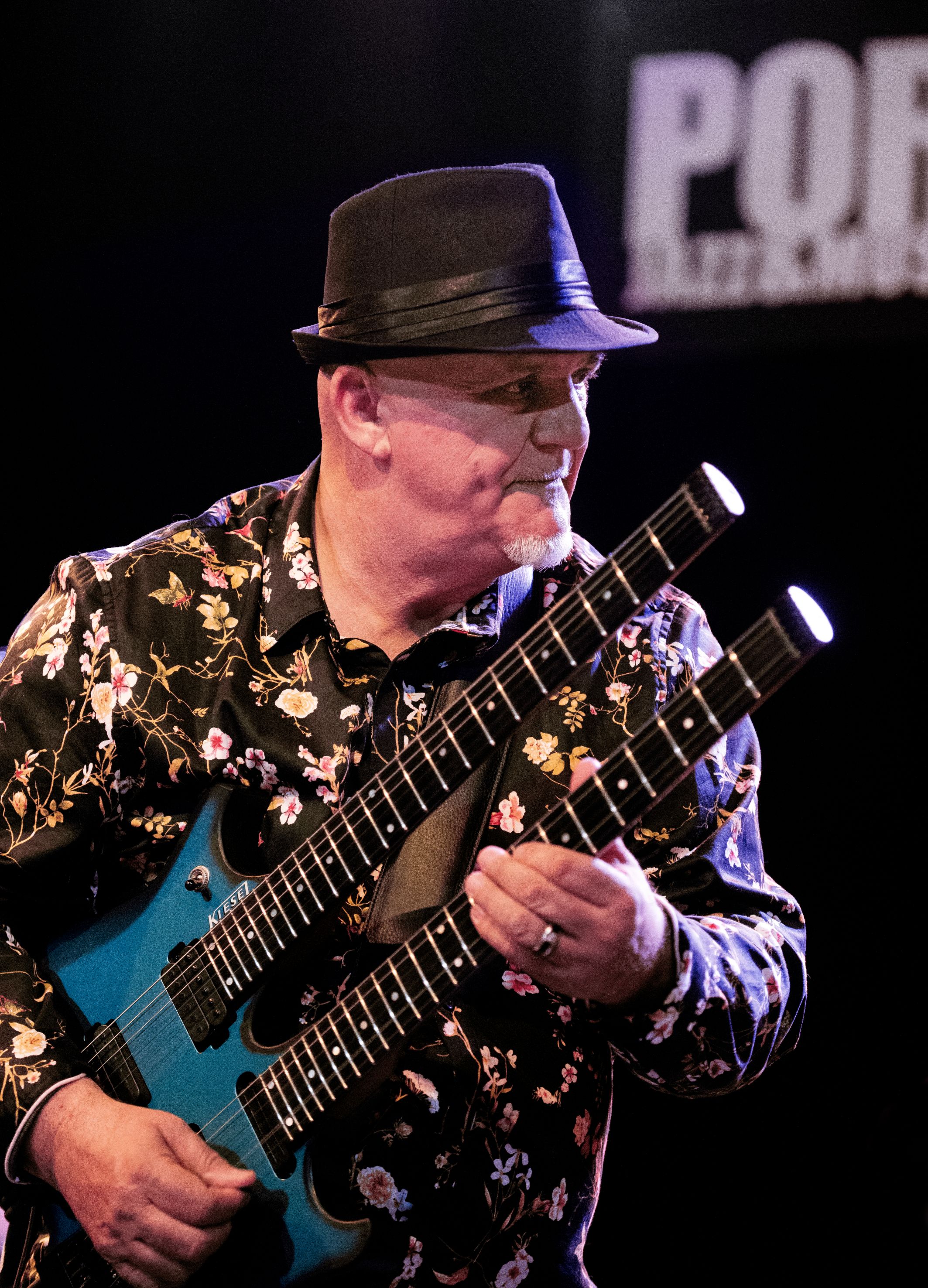 Das Fusion-Idiom, welches vornehmlich auf die konventionelle amerikanische Herangehensweise, denn die europäische war stets eine radikalere, des Konglomerats Jazz & Rock anwendbar ist und im Laufe der Jahrzehnte seine Fühler ja in alle erdenklichen musikalischen Richtungen ausgestreckt hat, erspielte sich in diversesten Verkleidungen einen Fixplatz in der Musikwelt. Gegenständlich sprechen wir eindeutig von der Schattierung Jazzrock. In die lichten Höhen dieser Spielhaltung gespielt hat sich der australische Gitarrist Frank Gambale während langjähriger Kooperationen mit der Band Vital Information und vor allem in Chick Coreas Elektric Band bzw. dessen Return To Forever-Reunion. Der Australier gilt zudem als eine Koryphäe der von ihm erweiterten Sweep Picking-Technik – einer speziellen Plektrum-Spielweise. Live erkennbar nur für Gitarristen, staunt jedenfalls der/die nicht spezialisierte HörerIn pass über die einsichtige grifftechnische Virtuosität von Mr. Gambale. Auf nicht weniger als fünf verschiedenen Gitarren, darunter ein doppelhalsiges Instrument, verlautbarte er seine raffinierte Kunstfertigkeit. Wozu er sich allerdings nicht hinreißen lässt, sind inhaltsleere Artistik oder das Abspulen technischer Bravourstücke. Technik ist für den Gitarristen die Trägerkomponente der Musik. Simples, sofort fassbares wie gleichfalls komplexes, temporeich ausgelegtes Themenmaterial sind die Trigger der Songs. Die daraus entwickelten Soli, reizten zunächst mit reichlich Originalität und Triftigkeit die Zonen der Jazz/Rock-Gemengelage aus. Seine flirrenden Improvisationen entwickelt Gambale aus Changes heraus. Harmonisch sehr einfallsreich, mit üppigem melodischen Potential. Und spezifisch im Sound. Rock-Kick und Jazz-Raffinement in Balance. Aufgeladen mit Bluesgefühl und beträchtlicher rhythmischer Intensität. Etliches an spritzigen Ideen boten im ersten Set ebenfalls Gambales gleichgesinnte Partner auf. Um nichts weniger stupende Könner an ihren Instrumenten. Bassist Feraud knüpft mit perfektem Akkordspiel an die Errungenschaften von Jaco Pastorius an, hatte aber letztlich zuviel an solistischen Gelegenheiten, da sich ein Repeat-Modus einstellte. Weitestgehend variantenreich an Einfällen zog Keyboarder Léonide die Register. Vor allem wenn er die E-Piano Einstellung seines Instrumentes aufrief. Da perlte es hinreißend analog organisch. Positioniert ist die aus dichter Interaktion heraus, mit eindringlicher Hingabe erschaffene Musik im konventionellen Tonalitätsrahmen gängiger Dur/Moll-Texturen.