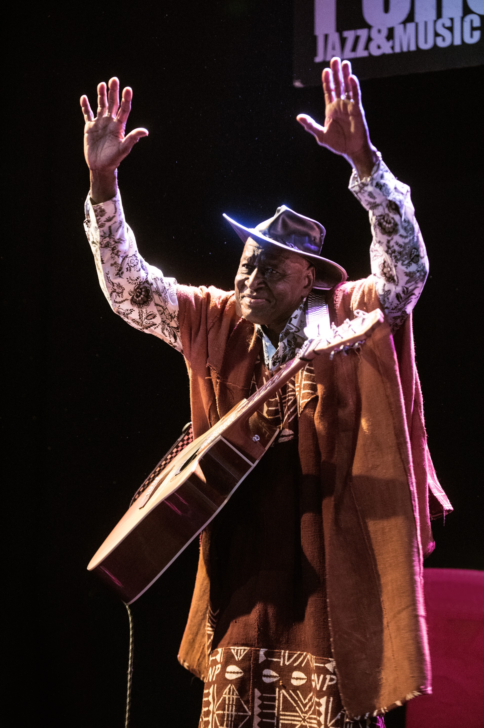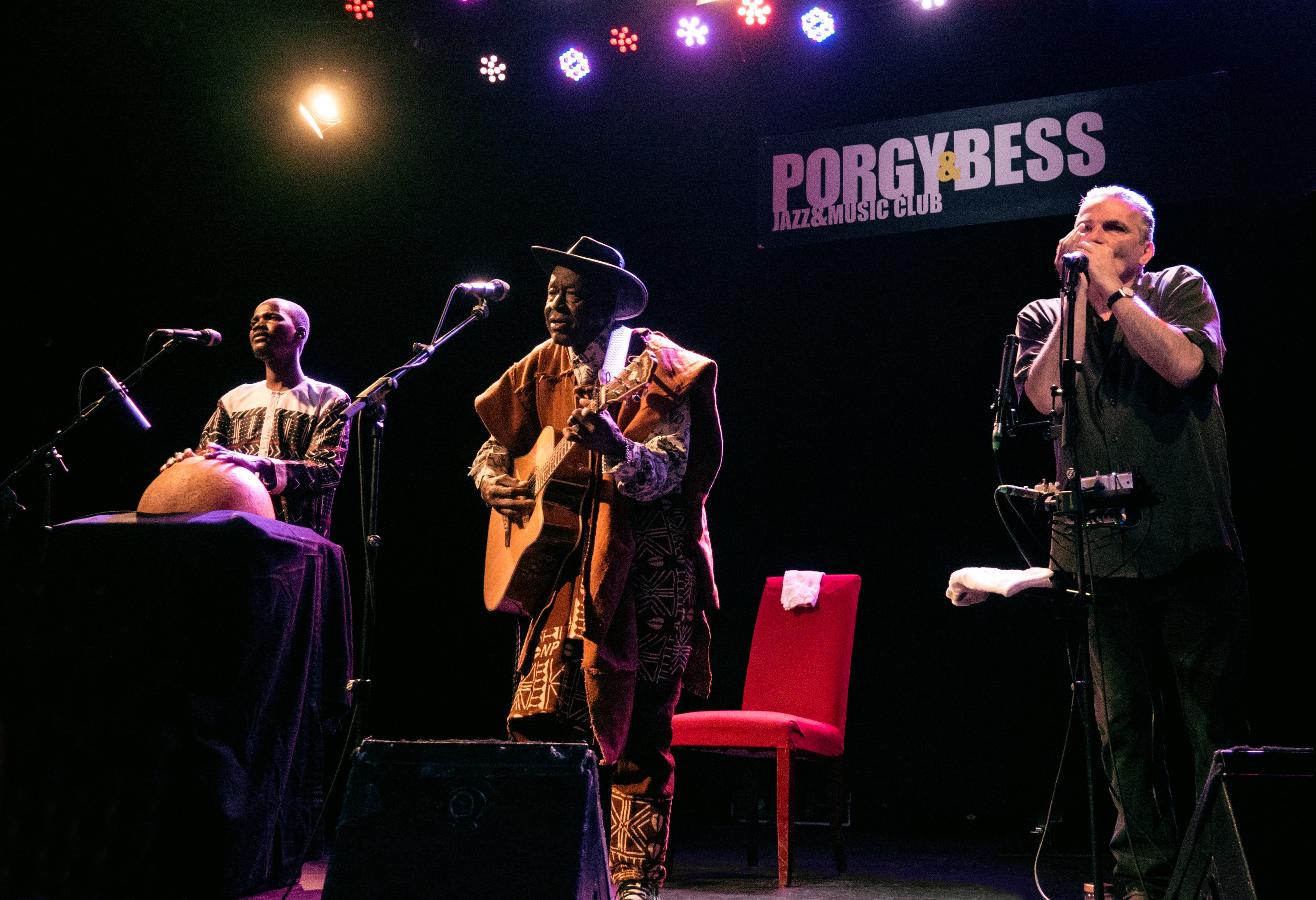 Mit der Unabhängigkeit Malis im Jahre 1960 begann gleichfalls die Karriere von Boubacar Traoré. Er avancierte zu einer Autorität der zeitgenössischen Populärmusik Malis. Die akustische Gitarre wurde sein Instrument, für das er Klangeigenschaften der Harfenlaute Cora adaptierte. Diverse politische Veränderungen in Mali bescherten dem Mann ein bewegtes Leben, im Verlaufe dessen er sich das eine oder andere Mal aus dem Musikerdasein zurückziehen musste. Doch seit mittlerweile über dreißig Jahren verbreitet Traoré wieder seine wesenseigene Musik, gespeist von tiefgründiger spiritueller und archaischer Kraft. In ganz spezifischer Weise finden in der Melodik seines Spieles afrikanische Tonalitätsverhältnisse und das harmonische Schema der afro-amerikanischen Bluesformel zusammen. Im Verbund mit afrikanischer Rhythmisierung schuf Traoré seine Form eines „African Blues“. Auch die Ähnlichkeiten in der Modulation wie beim afro-amerikanischen Blues stellen sich offen dar. Immer wieder dringen Analogien zum Blues eines John Lee Hooker ans Ohr. Ebenso wird man sich des Quellgebietes der den Blues/Jazz charakterisierenden Blue Notes gewahr: Afrika. Man begegnet hier einem Beispiel befruchtender Transkulturation. Aktuell ist der 80-jährige Musiker mit einem ungewöhnlich besetzten Trio zugange. Babah Koné, der Perkussionist, spielt die Hälfte eines Riesenkürbis, so hat es jedenfalls den Anschein, die mit der gekrümmten Seite nach oben vor ihm liegt. Am Mittelfinger seiner rechten Hand sitzt ein Eisenring mit dem er knackende Sounds erzielt. Mit der zur Faust geballten linken Hand beschlägt er den oberen Bereich der Schale, was einen vollen Basston nach sich zieht, mit dem die Eins markiert wird. Und dann der beseelte Blues-Harp Stil des französischen Mundharmonika-Virtuosen Vincent Bucher.