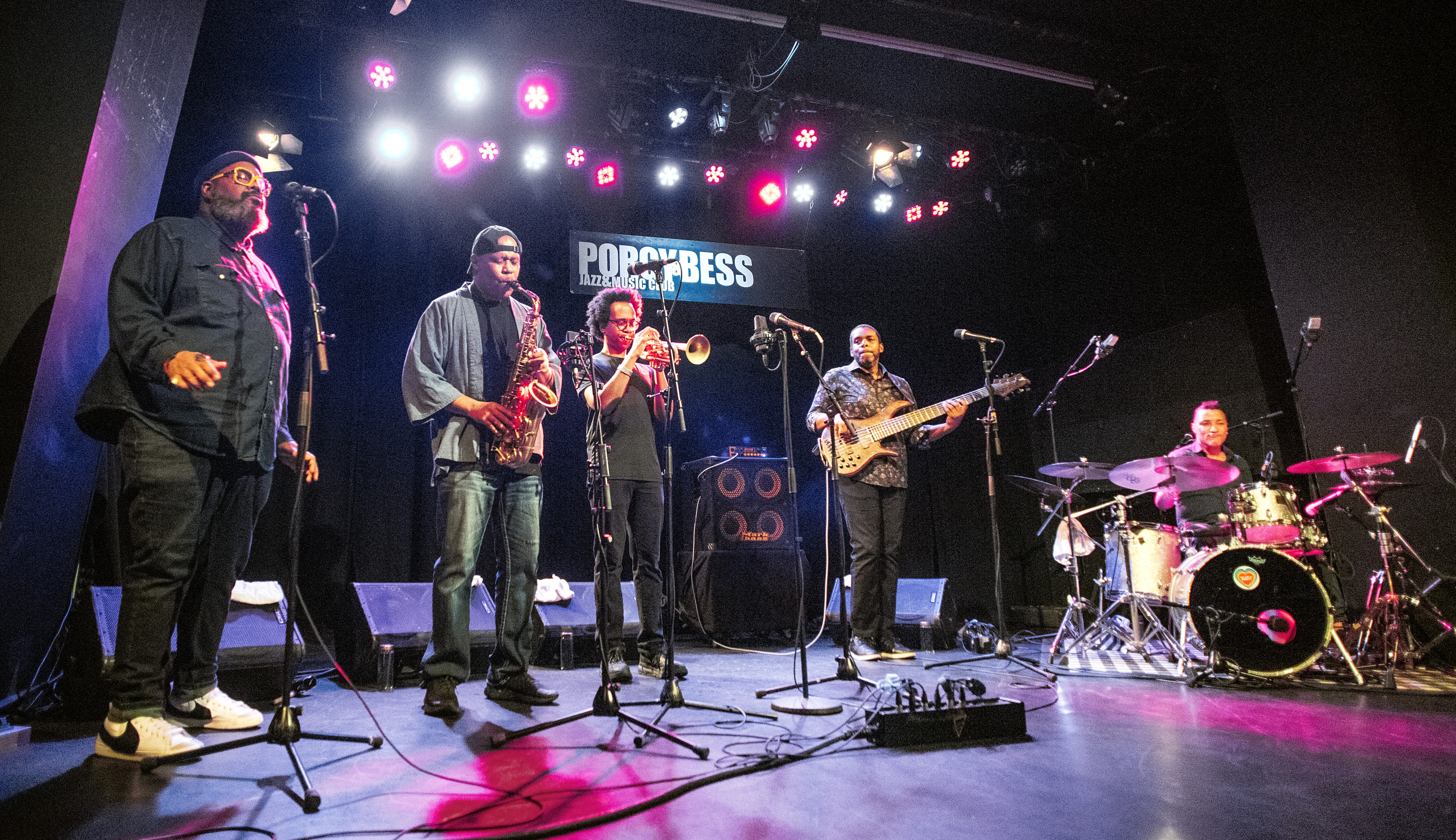 Von Coleman des Öfteren unbegleitet hingestellt, aber auch in präzisem Unisono mit dem Trompeter oder dreistimmig zuzüglich der Stimme. In den Improvisationen verfolgte Coleman gleichsam komplexe Pfade, Themenblöcke ausformend, mit scharfumrissenen Stakkatokaskaden jubilierend. Er gelangte somit zu spiralartigen Bewegungsverläufen. Darüber flaniert die Identität von Ton und Phrasierung. In seinen Extempores, man hätte gerne etwas von den „Wortspielen“ verstanden – die Inbrunst ließ allerdings den Inhalt fühlen-, slamte, „wordete“, sang, scatete, rapte Kokayi in einer ziemlichen Einzigartigkeit und begründet so etwas wie eine neue verbale Ausdrucksweise: „Scap“. Einigermaßen zurückhaltend, die Strahlkraft gedeckelt, wirkte Trompeter Finlayson. Der Drum & Bass-Generator trieb es gewohnt phänomenal buntest. Das Erbe afrikanischer rhythmischer Organisation in Koinzidenz mit dem Jazz Beat-Feeling plausibilisiert sich in Colemans speziellem zeitstrukturierenden, tonräumlichen System zu einem kinetischen Ritual, das der afroamerikanischen Musik ihren Bedeutungsstatus für die Musikentwicklung der letzten 12 Dekaden erhält und deren Wachstum nachwirkend vorantreibt. Five Elements - dem Rhythmus im Wort.