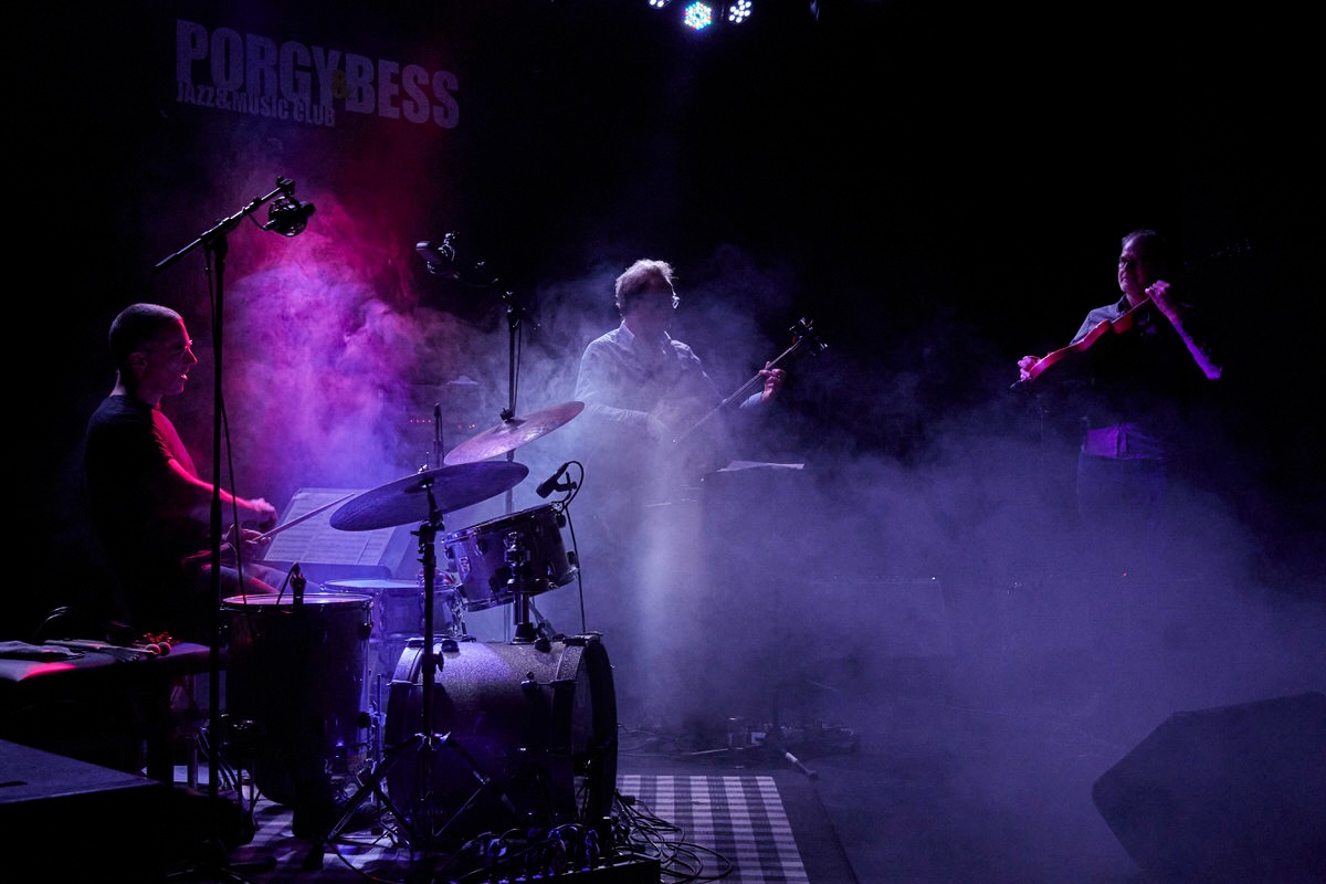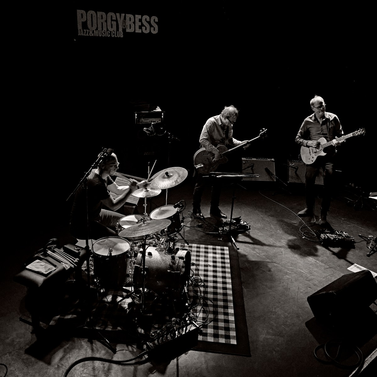Fraglos last sich das schön ausmalen: Derek Bailey, verstorbener stilistischer Solitär und Gitarreninnovator der frei improvisierten Musik, trifft Eric Clapton, Rockgitarrenheld der ersten Stunde. Man geht wahrscheinlich nicht sehr fehl in der Annahme, dass die beiden Größen so unterschiedlicher musikalischer Universen sich dennoch kannten oder zumindest irgendwann begegnet sind. Eine Kooperation stand mit Sicherheit jedoch nie jemals im Raum. Nach fantasierenden Scherzereien, so die Eigendarstellung, fassten drei Leuchten des avancierten Berliner Jazzzirkels sich ein Herz, die Fiktion einer derartigen Zusammenkunft nachzuempfinden und öfter mal vorzuspielen. Im ersten Teil des Konzertes stellte das Trio vorwiegend Eigenkompositionen, der Hauptanteil lag bei Willers, zur Diskussion. Gehört wurde ein Konglomerat eines Ansatzes von „Free Rock“ mit etwas schräggestelltem Modern Jazz. Gelegentlich in offene Formfindungsmomente, Klangfarbendiskurse ausschwärmend. Brüllende Akkorde lösten sich mit trocken angelegtem Single Note-Getrippel ab – von harmonischer/melodischer Seite. Rhythmisch rockte es ein wenig zu verhalten, der nötige Punsch wurde oftmals ausgedünnt. Das lag im Ermessen des Schlagzeugers der betreffend Rockmetier einigermaßen fremdelte. Auch die Vertrautheit seiner Partner mit diesem Idiom half ihm nicht heraus. Vor allem der meisterliche Allrounder Roder warf fortwährend satte Hooklines, spannungsgenerierende Off-Beat Akzente ins Geschehen. Seine eigengeführten Basslinien groovten allemal. Willers traf in seinem originellen Amalgam aus Rock- und Jazzgenen schon immer wieder ins Schwarze. Speziell mit seinem Sound. Nahm, ab und an Noiseausbrüche evozierend, die Funktionsharmonik gleichsam ordentlich in die Mangel. Trotzdem wirkte Willers im Zuge seiner akkordischen Fortschreitungen phasenweise zu fahrig. So geriet dann der rockige Back Beat öfters ins Schwanken. Löste sich diese Phase in rein klangfarblich angelegte Improvisationen mit zeitlich frei entwickelten Schwebezuständen auf, erklangen die dichtesten wohl auch intensivsten Aggregatzustände. Dann zeigte Schlagzeuger Marien mit seinem eigentliches Können auf. Von einer Reflexion über die einzigartige, einen non-linearen Entwicklungsprozess verfolgende Spalt- und Splitterklang-Ästhetik des Derek Bailey und der gesuchten stringenten Verschränkung mit Claptons bluesgetränkter, relaxter Spielweise war bis zu diesem Zeitpunkt nichts zu hören. Ebenso wenig ließ sich dies im zweiten Teil des Konzertes wahrnehmen. Vielmehr gab´s ein Cover des Jack Bruce Stückes „Politician“, eine etwas neblige Version von „Good Bye Pork Pie Hat“ sowie Interpretationen von Gentle Giant bzw. Mahavishnu Orchestra Stücken. Deren Vielschichtigkeit und struktureller Kunstgriffigkeit konnte nicht Rechnung getragen werden. Hier war ebenso wieder der Schlagzeuger ziemlich in der Zwickmühle. Nötiger Drive und Würze kamen seinerseits nicht über die Rampe. Abermals, wenn es in die jazzrhythmischen, -harmonischen Gefilde ging und deren offene improvisatorische Auslegung anstand, die Interaktion wirklich durchdringend war, errang die Musik Dringlichkeit. Schönes Beispiel die Aufbereitung des Gateway(Abercrombie/Holland/DeJohnette) Stückes „May Dance“. Bilanzierend konstatiert: Derek und Eric winkten sich nur aus der Ferne zu.