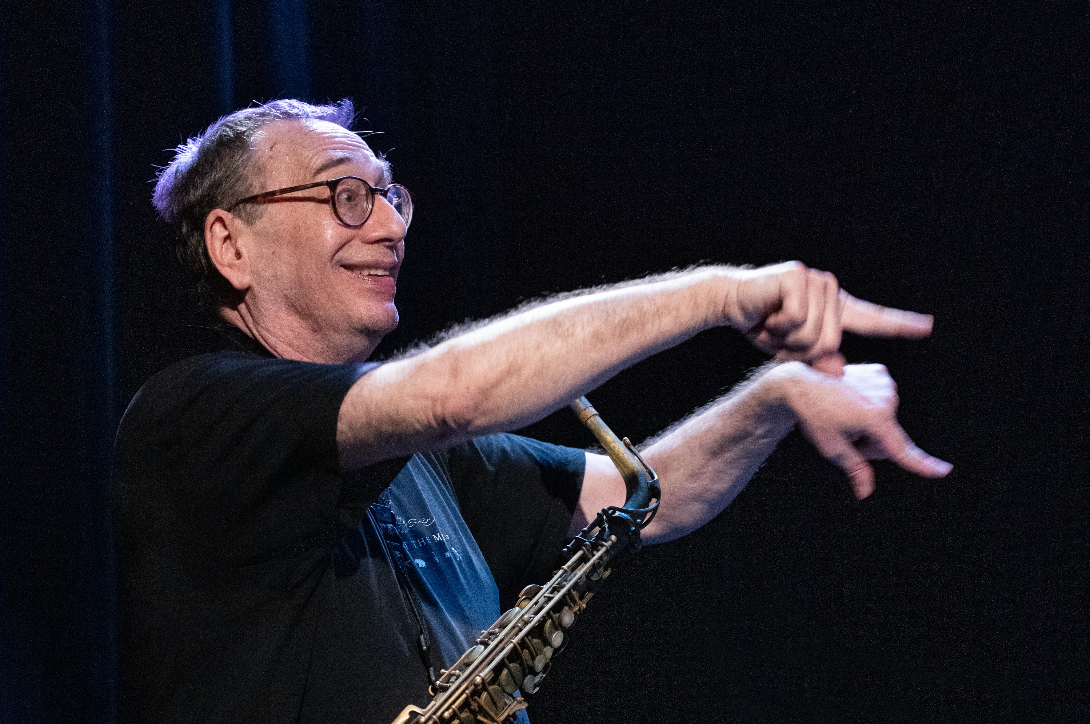 Im Vorjahr als Jubiläums Special angelegt, sprich 30 Jahre Porgy & Bess, 70 Jahre John Zorn, machte eine Erkrankung des Protagonisten eine Verschiebung auf heuer notwendig. Sodann, Zorn splittete das Konzert in zwei Teile auf. Mit Beginn 19.30 bzw. 22.00. Analog zum klassischen Masada Quartett treibt er mit dessen neuer Version ebenso sein Wesen in der Jazzsphäre. Zorn durchwühlt mit allem gebotenen Respekt die Jazz-Moderne aber primär bleibt es auch hier bei der scharfkantigen Transformation der Errungenschaften des legendären Ornette Coleman Quartet. In der Wahrnehmung der Gegenwart und der eigenexpliziten Deutung. Süffige Bassostinate sprossen nur so hervor, gepusht von polyrhythmischen Vertracktheiten. Über diesem vibrierenden Nährboden, verstreuten Saxophon und Gitarre chromatisch gefärbte, modal getriggerte Themen, ausgefuchste Polyphonien und letztlich solistischen Sternenstaub, konventionell ausgelegt und gleichlautend der Steilwand-Noise zugeneigt. Seine signifikante cut-and-paste-Technik mit den wahnwitzig schnellen Wechseln im Minutentakt wendet Zorn hier nur im entschleunigten Modus an. Harmonischen, melodischen Progressionen und improvisatorischen Ausdeutungen ist im Vergleich viel Zeit gegeben. Tempomäßig wird dennoch nicht getrödelt. Folglich konnten der einem Phänomen gleichende Bassist Roeder und ein so und so unfassbarer Wollesen (auch bei ihrem solistischen Kundtun stand einem der Mund offen) die rhythmische Kunstfertigkeit der zornschen Kompositionen in aller gewünschten Nuanciertheit ausbreiten.