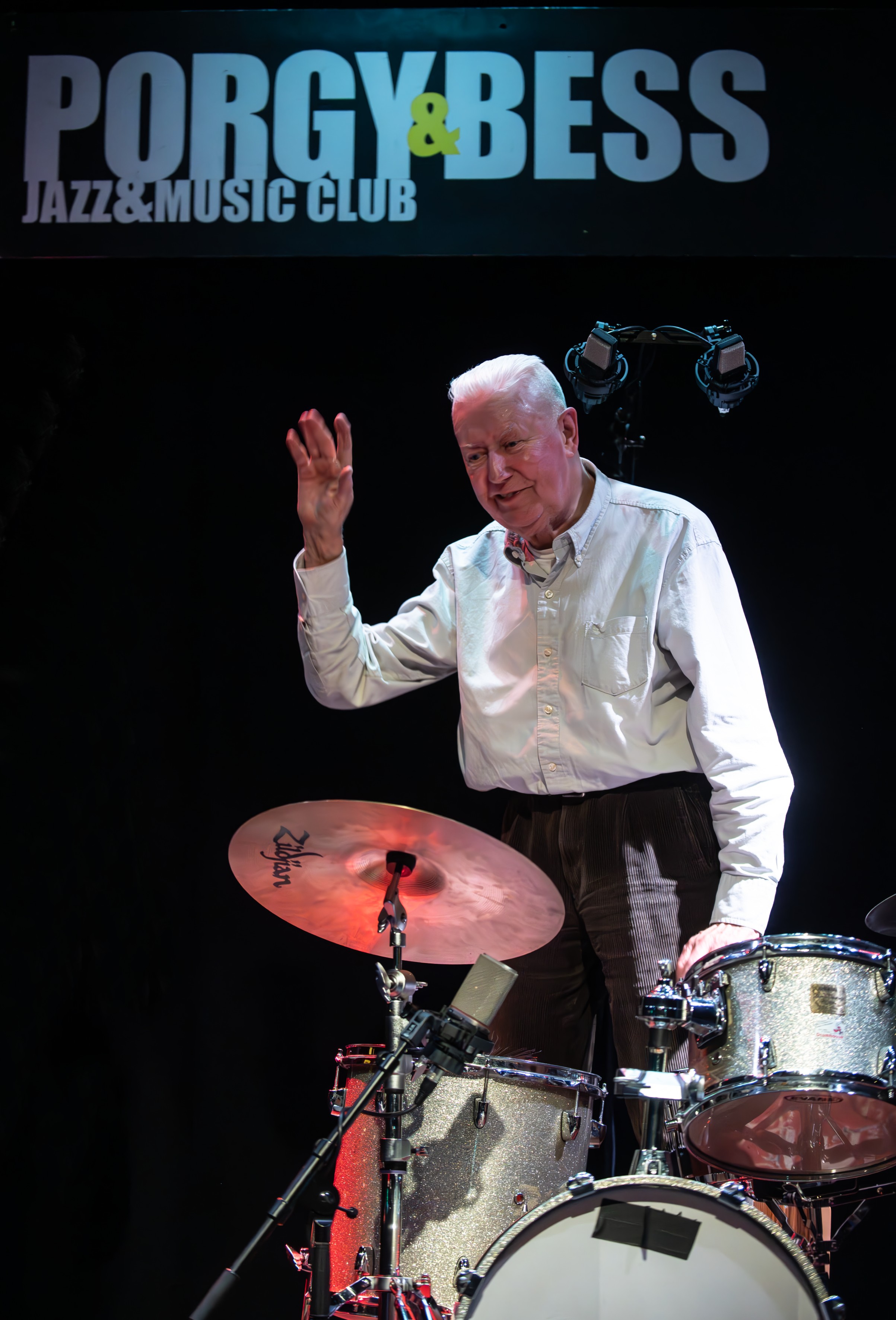 Vergnügliches Beispiel war sein „Schlagzeugsolo“, für ein solches, wie er betont, er sich gar nicht erwärmen kann. Somit legte er dieses „benninkisch“ an. Linker Hand ein Mikrofon haltend, in welches er mit dadaistischem Anstrich die berüchtigte Geschichte vom Hasen sprechsangte, rechter Hand, besenschwingend, sich mit schnippendem Beat begleitend. Großartig eben wie er die periodische Rhythmik kurzzeitig aufbricht, Akzentuierungen verschiebt, rhythmische Pattern kreuzt, einen unbändigen Drive unterlegt und somit seinen zwei Generationen jüngeren Partnern anstachelnde Informationen vorschlägt. Die sich gierig darauf stürzten und ihrerseits nicht mit Ideen geizten, vor Originalität glänzend, die den „Großvater“ strahlen ließen. Gitarrist Baas verflicht Hook- und Basslines mit satter Jazzakkordik, einer Brise Rockaffinität und imaginiert gefinkelten Soli. Eigenwillig charmant positioniert sich Saxophonist van Gelder zwischen Konitz und Ornette Coleman. Lyrische Coolness verträgt sich wunderbar mit forscher Rasanz. Überhaupt lag die Würze in der Kürze. Die Stücke verweigerten eine Ausuferung und waren einem dringlichen Konzentrat des Narrativen verpflichtet. Kommunikativ außerordentlich anregend, eng verzahnt, zielgerichtet. Programmtechnisch hielt das Trio an Originalkompositionen (thematische Skizzen die die Improvisationen anregen) fest. Monk durfte allerdings nicht fehlen. Dessen verschrobene Kantigkeit verträgt sich bestens mit der humor- und parodieversetzten Musik der Holländer. Und sie fliegen noch immer. Großes Vergnügen und eindrucksvolles Alterstatement eines herausragenden Stilisten.